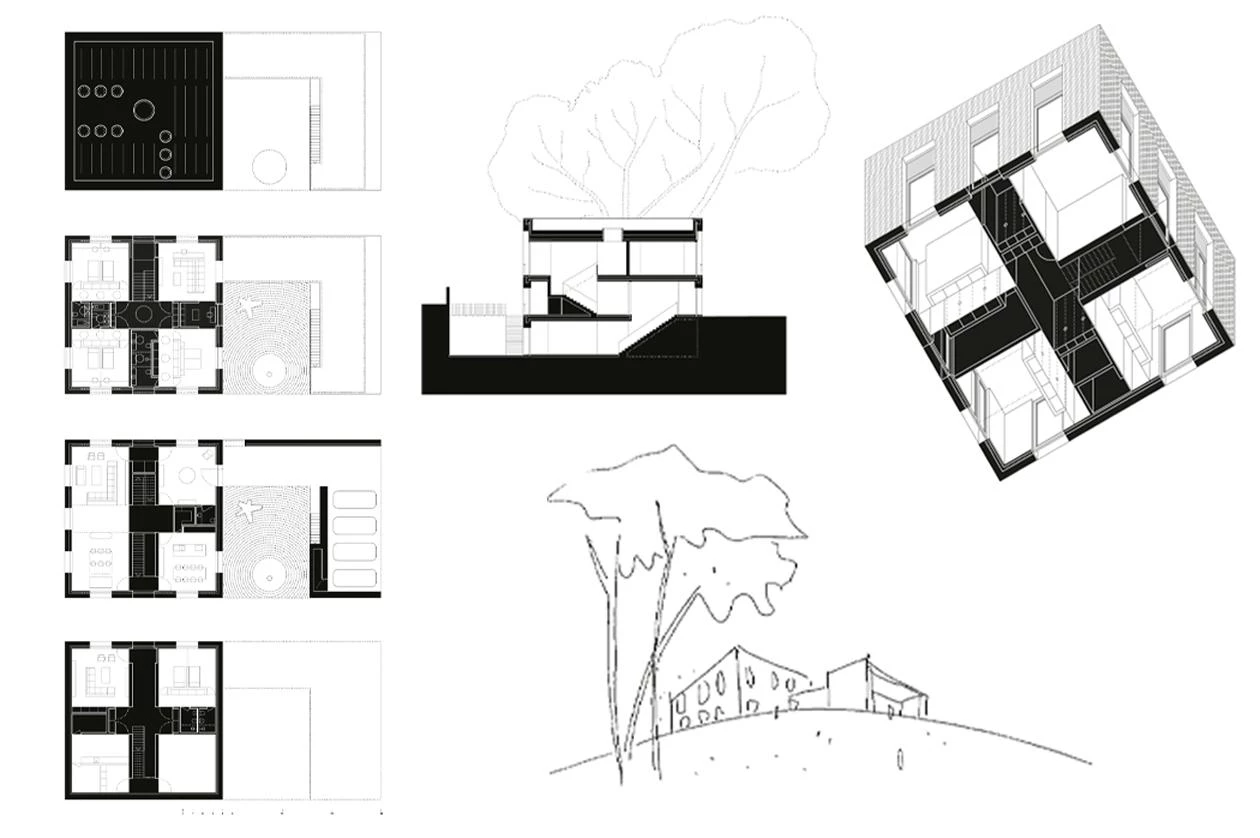 The cubic volume of the house is organized in three levels: the family bedrooms are placed on the first floor, the common areas are located on the ground floor, and the auxiliary units are placed on the first floor basement with a wide patio. The square plan of the house is structured with a central cross shape, which contains vertical and horizontal communications, while the rooms take up the four squares of the corners.
