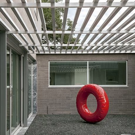 Oriented toward this courtyard, the three volumes open into and frame multiple views of what is a combination of hardscape garden and pool area. An aluminum trellis adds another critical element to this courtyard ensemble, providing shaded spaces for eating and entertaining. The totally enclosed environment is consistent with the client’s desire for absolute privacy and a calm environment. The layout of the masonry and galvalume steel structure maximizes the use of the entire property, introducing an alternative prototype for the neighborhood of mostly free floating single houses.