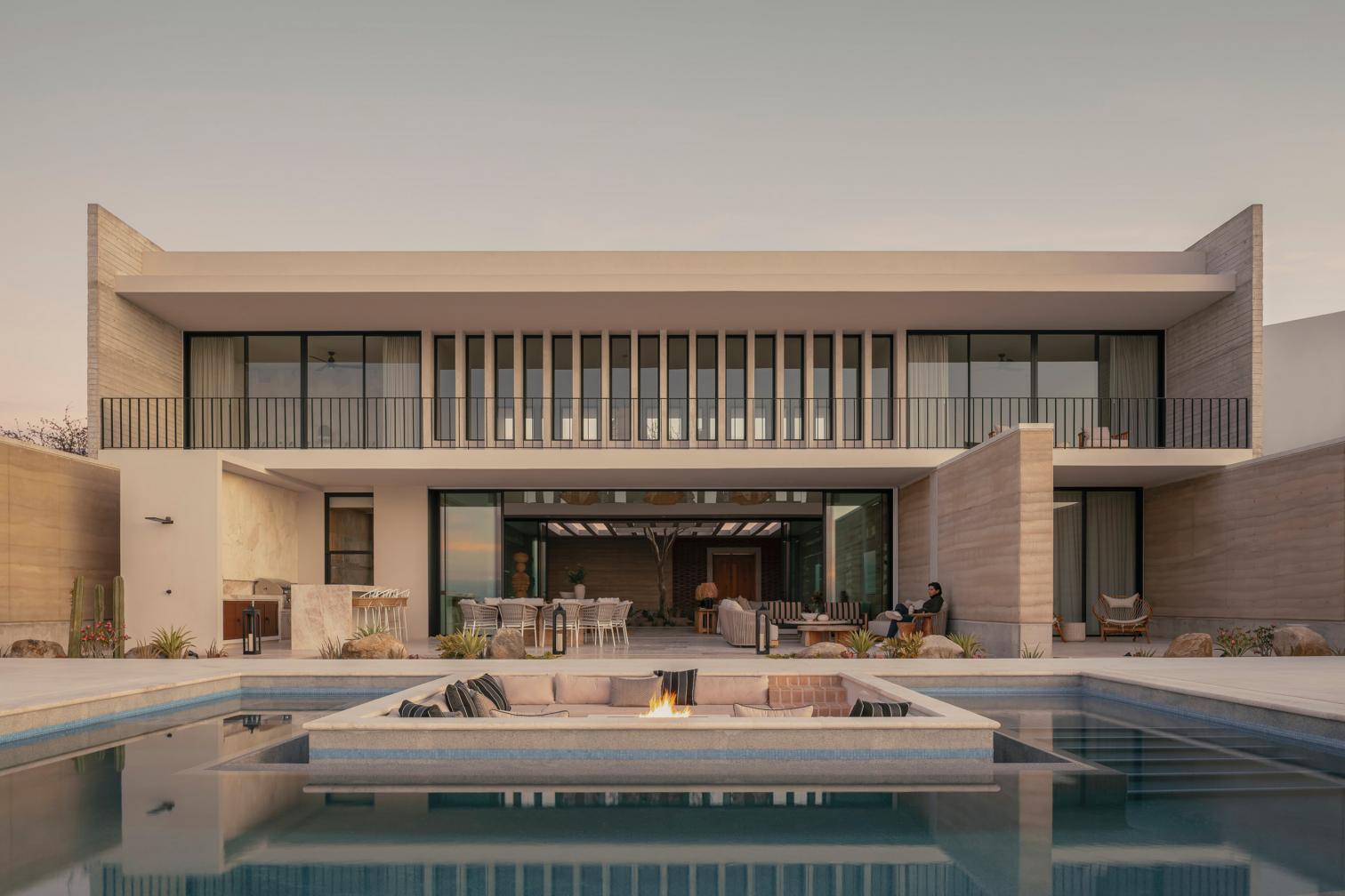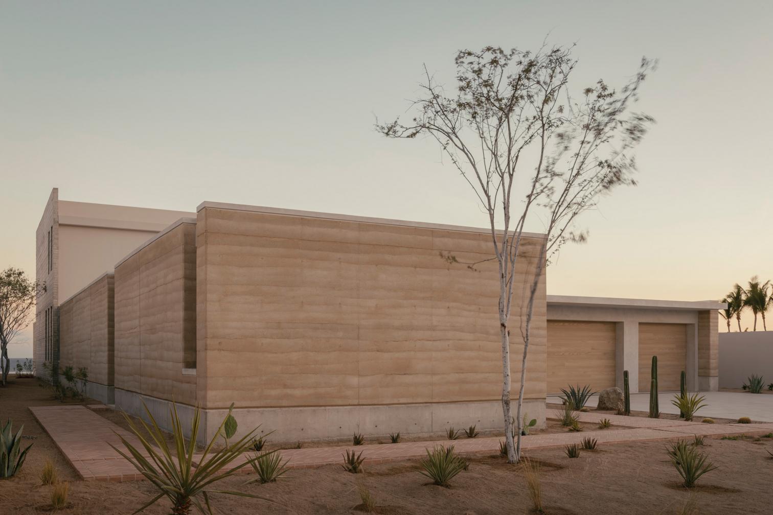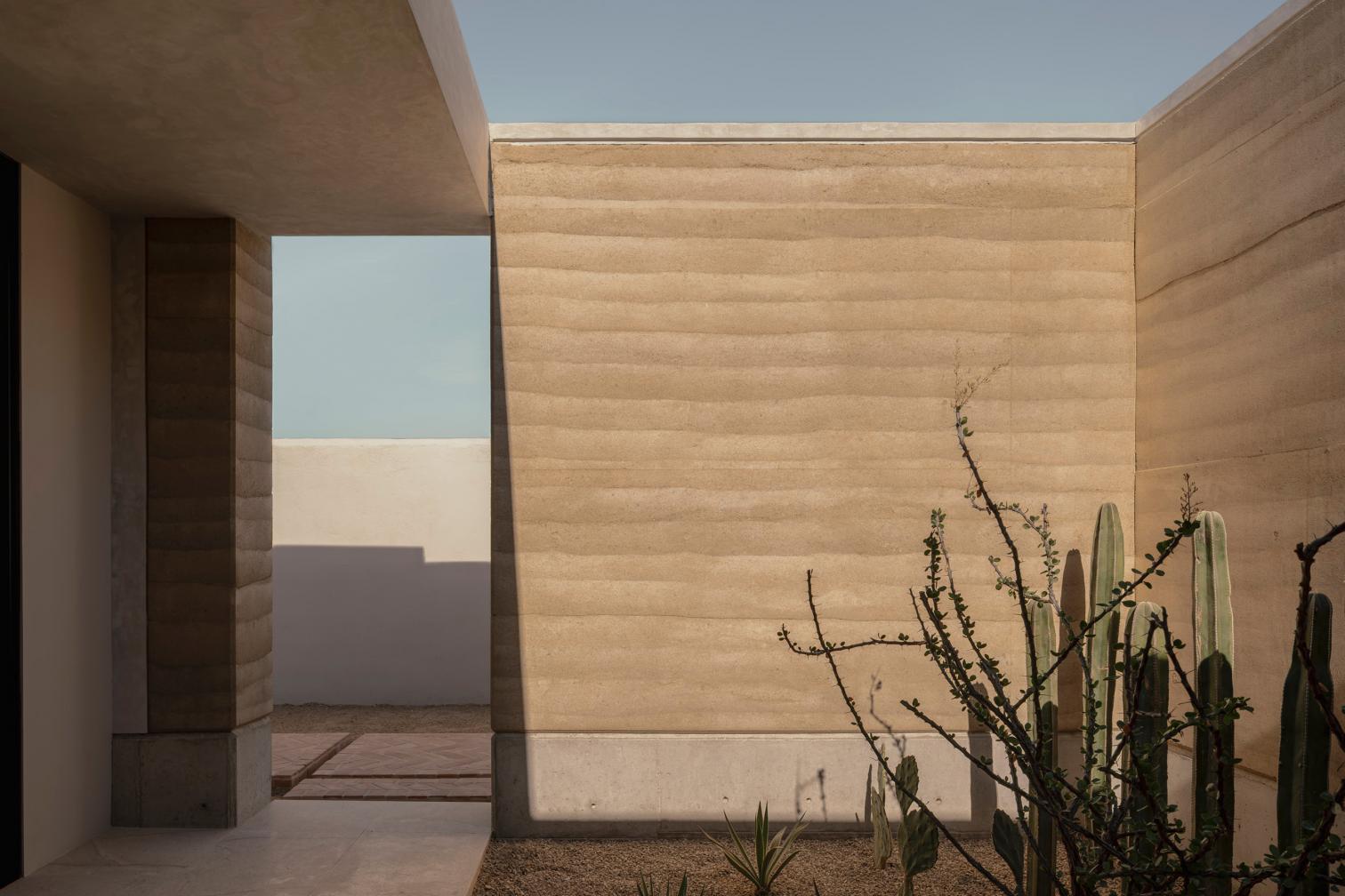 Located amid the privileged landscape of Cabo del Este, in Baja California Sur, the house responds sensitively to its natural surroundings, protecting itself from prevailing winds without sacrificing the open views of the sea. Access to it is designed as a gradual transition sequence. A blind wall marks the front facing the street to guarantee privacy, leaving only the pedestrian and vehicular accessways visible. From this point, the compacted-earth walls of the main volume lead to the entrance, culminating in a brick wall that frames a monumental oak door. This path leads to the central courtyard, the organizing element and heart of the project.