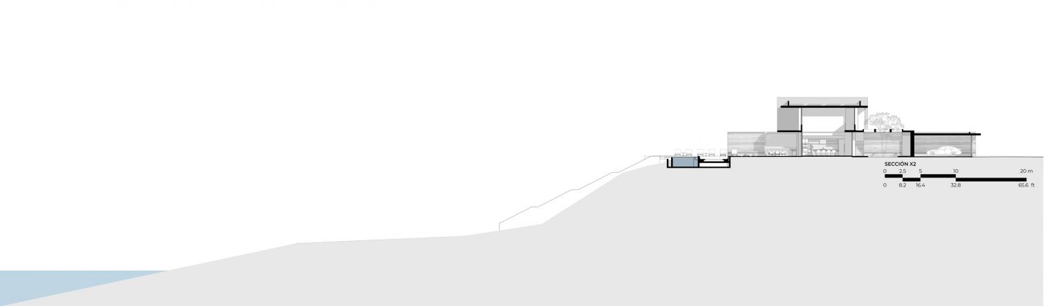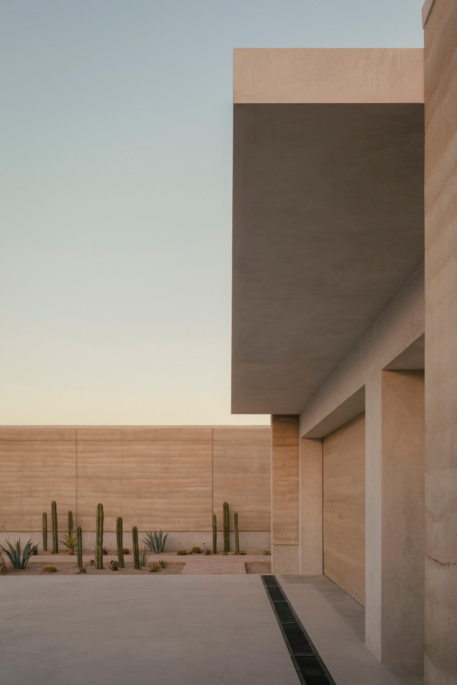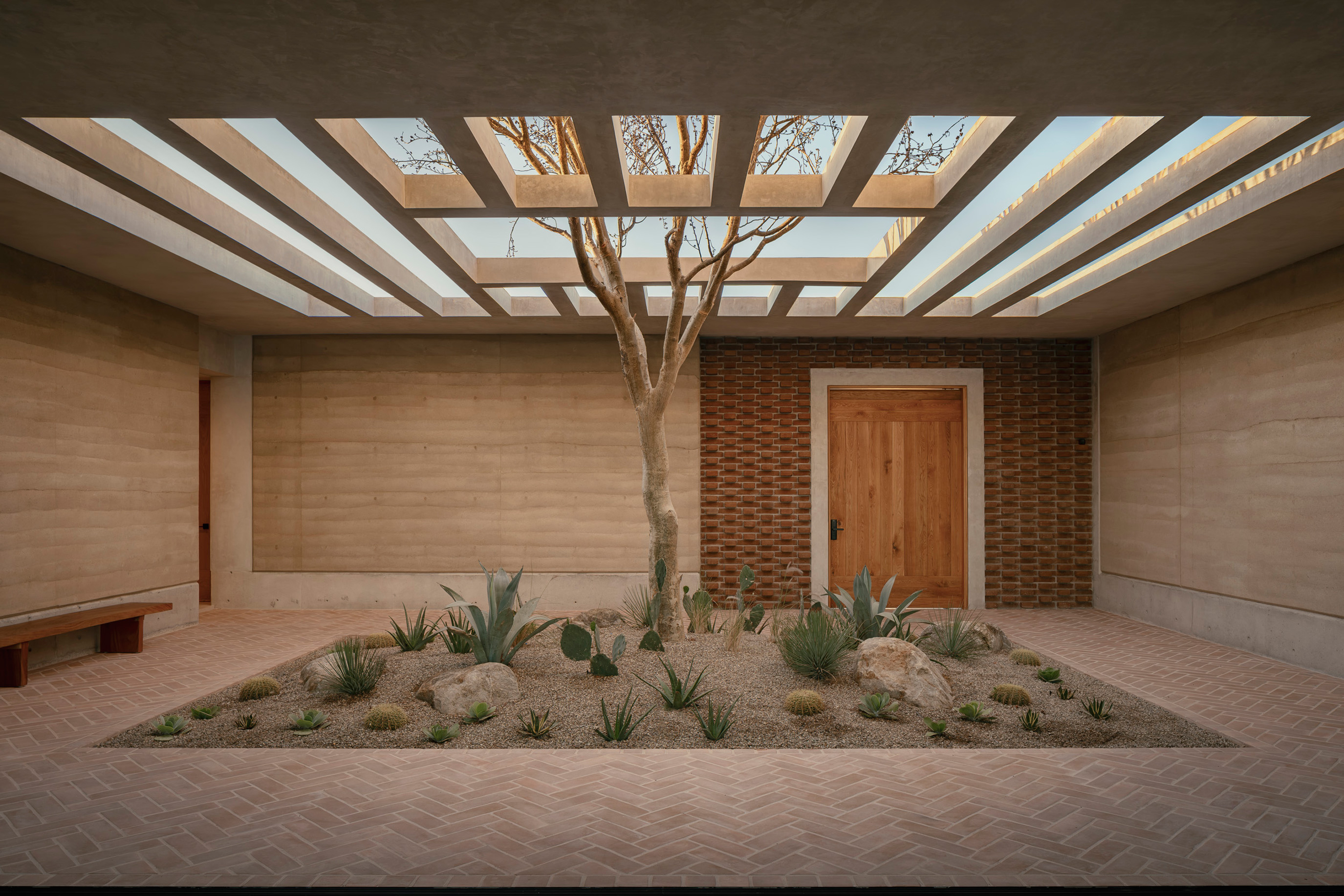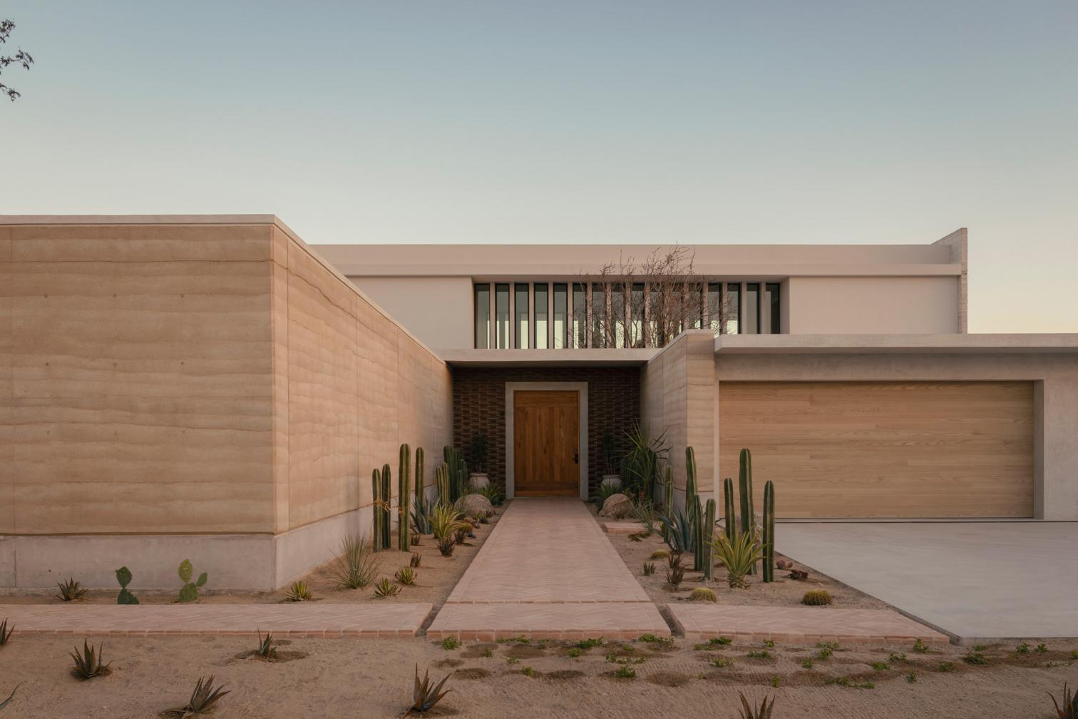 Located amid the privileged landscape of Cabo del Este, in Baja California Sur, the house responds sensitively to its natural surroundings, protecting itself from prevailing winds without sacrificing the open views of the sea. Access to it is designed as a gradual transition sequence. A blind wall marks the front facing the street to guarantee privacy, leaving only the pedestrian and vehicular accessways visible. From this point, the compacted-earth walls of the main volume lead to the entrance, culminating in a brick wall that frames a monumental oak door. This path leads to the central courtyard, the organizing element and heart of the project.