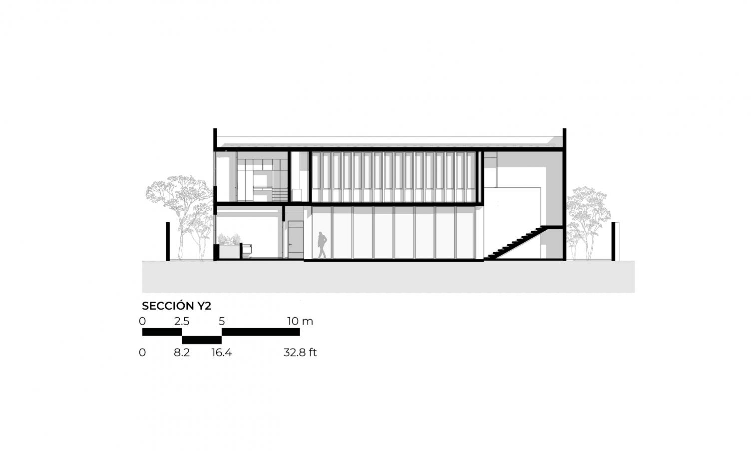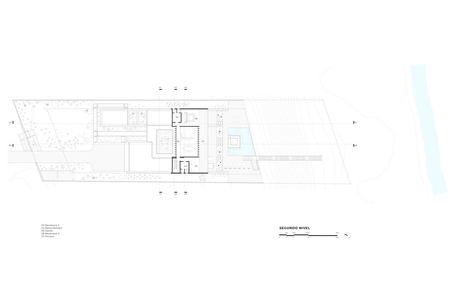 The courtyard organizes the interaction between the social and private areas of the house. A perimetral concrete pergola allows for controlled light and natural ventilation, while a rectangular opening at the center embraces a tree, which becomes the focal point of the space. Endemic vegetation and clay flooring reinforce the regional character of the residence and its connection to the site.