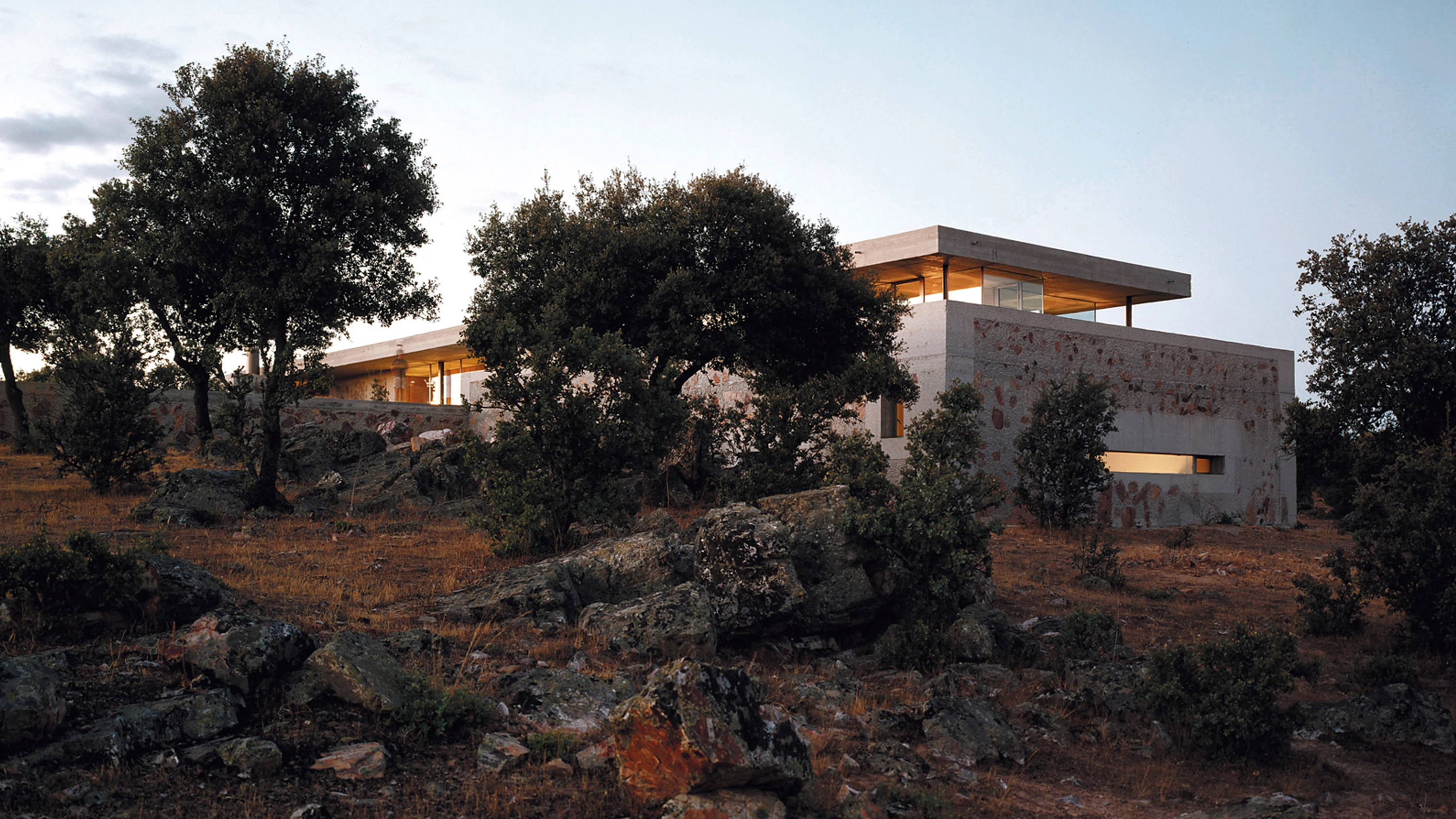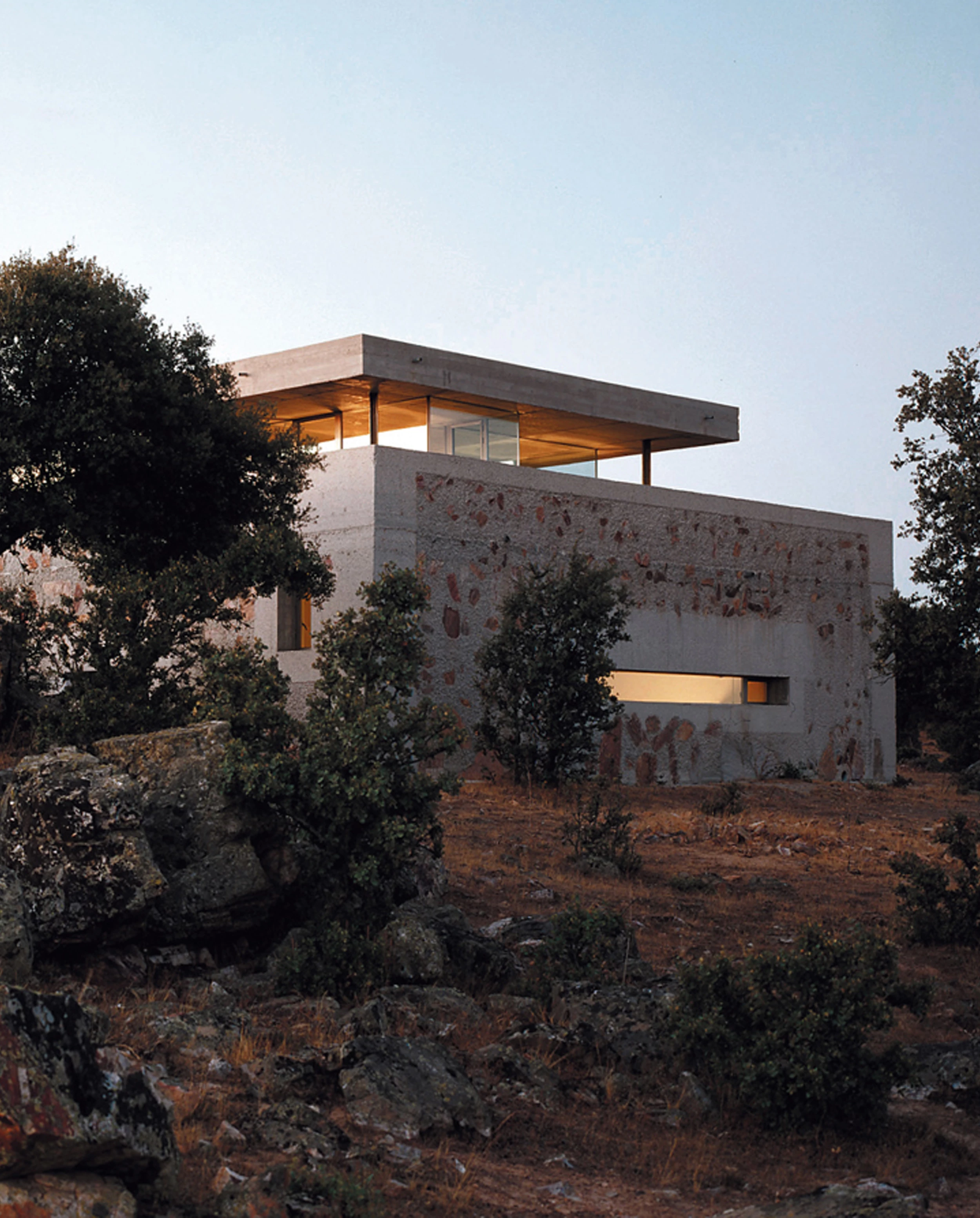 The residence is located in the most elevated part of the hill, on a flat landscape with the mountain ranges of Gredos and Gata as backdrop. A zigzagging path departs from the closest main road and through a forest of oak trees all the way to the upper part of the slope, where towards the south the hill becomes a promontory over the plateau. Thus the house has two scales: a small and fragmented one towards the trees, and another large and bold one towards the endless horizon.