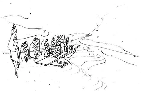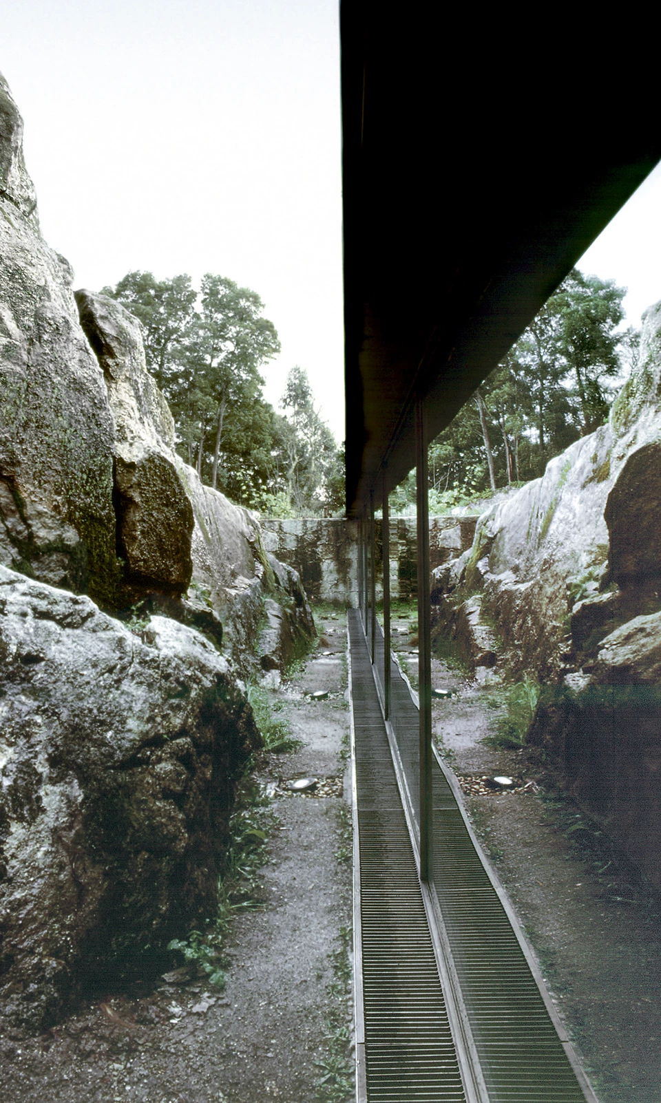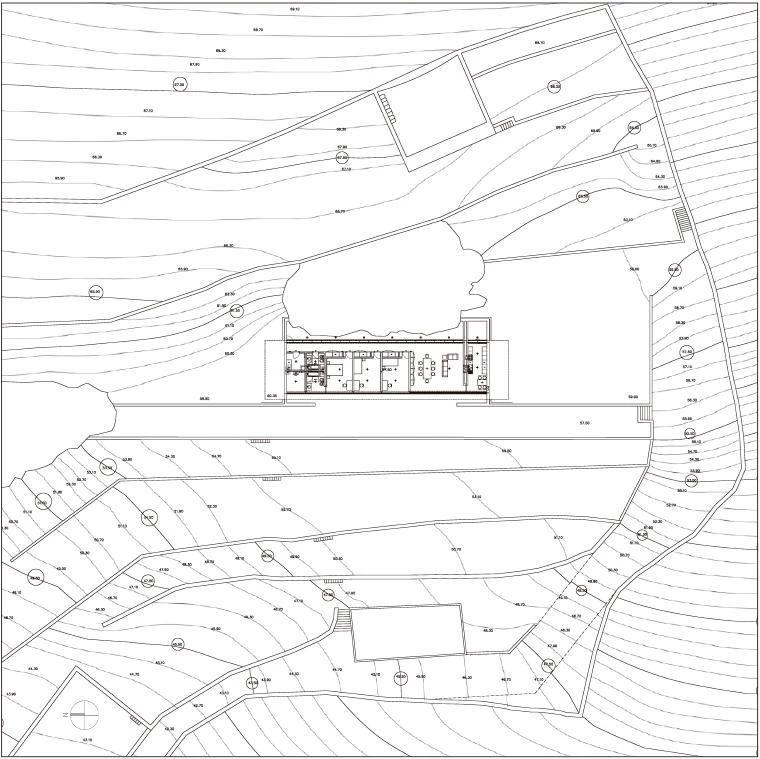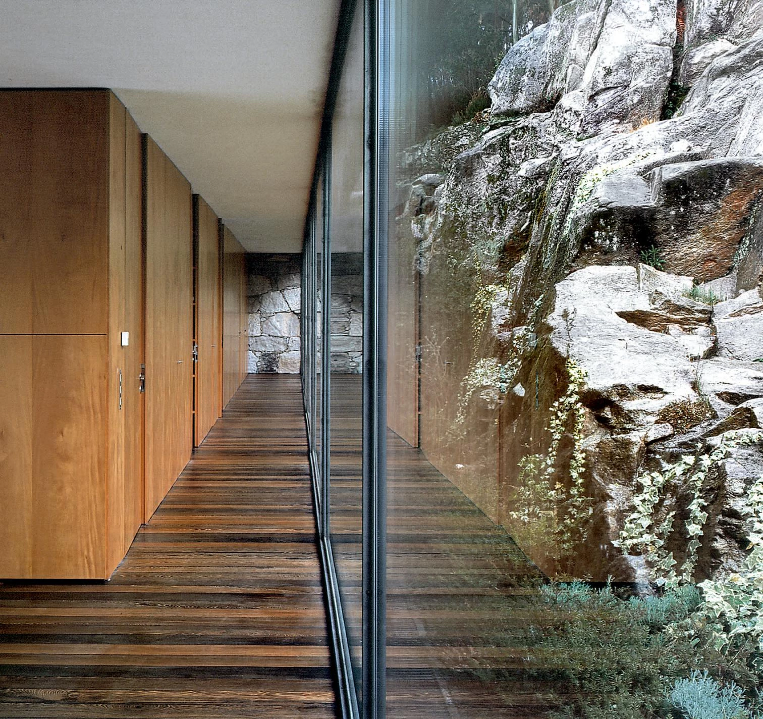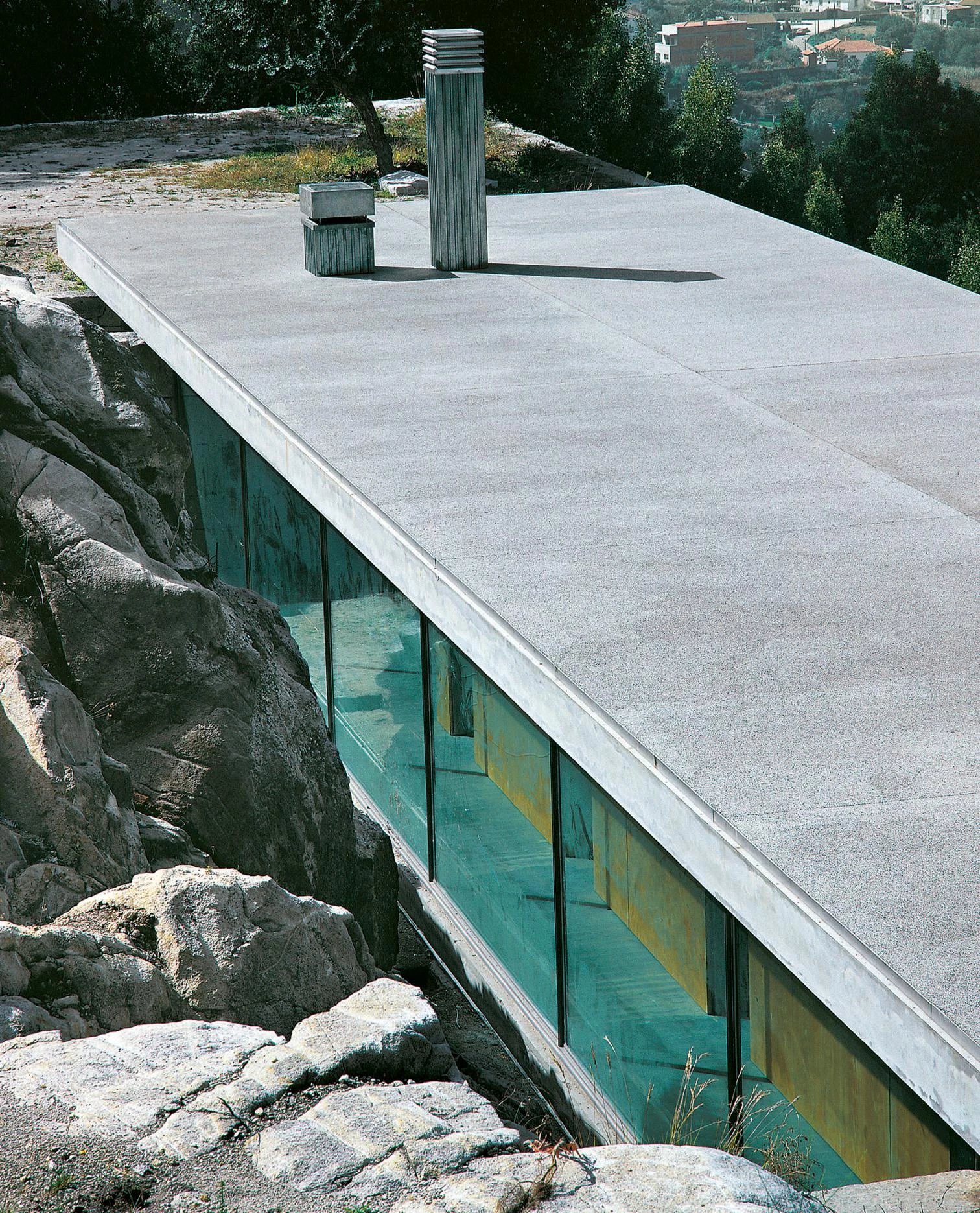 The main idea of the project is to adapt to the slope blending with the existing terraces: a similar proposal to the experience of the House in Baião (1990-1993), but in this case it had the added difficulty of the proximity of the terraces, with steps that were too narrow and low to be built upon. For this reason, one of the first decisions was to remodel the hillside by building fewer terraces, but broader ones, held by stone retaining walls. The house is inserted in one of those terraces, excavated to accommodate the program between two parallel glass walls and generating with it two radically different facades: one, lined up with the stone wall of the terrace and with views of the sea; and the other, interior, oriented towards the courtyard of irregular contours which is the result of the excavation.