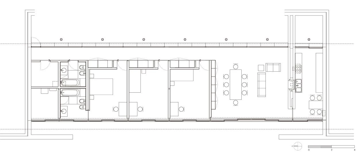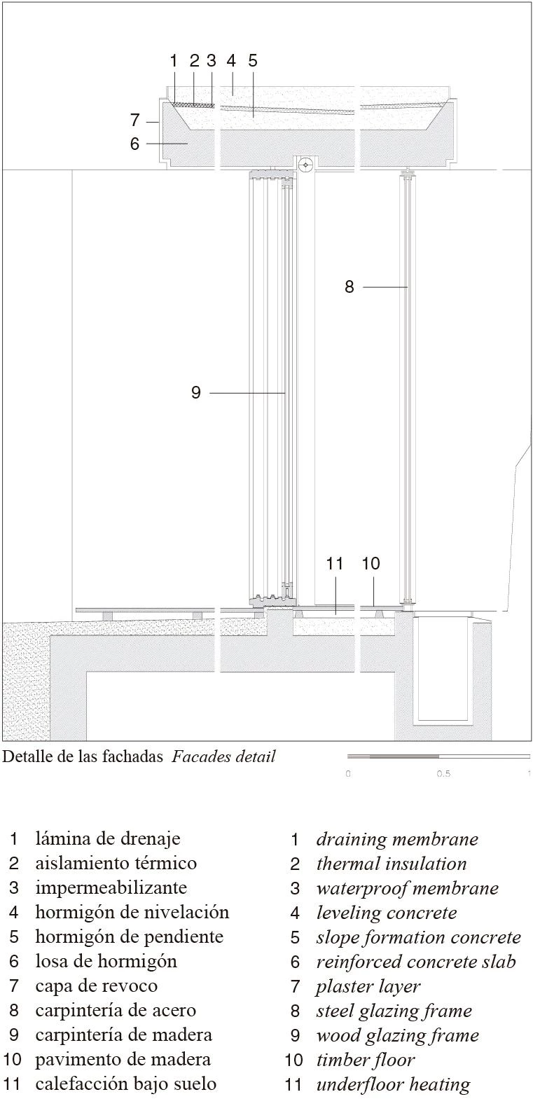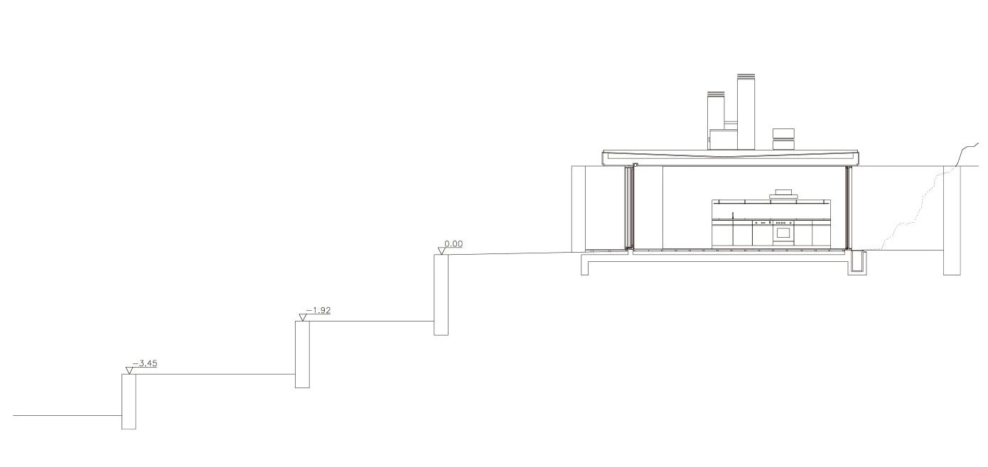 The flat roof is, however, the most important compositive element of the project. Conceived as a formally independent piece, stressed by its condition of ‘cover’ resting on the walls of the terraces, the roof is the fifth facade that can be seen from high up on the hill. Constructively speaking, it is formed by a concrete slab with a waterproof layer, thermal insulation and a rigid gravel layer. Upon it rest, as small objects on a table, the necessary chimneys and mechanical systems, finished in stainless steel. In this way, the slab restores the original topography of the terrain, turning the dwelling into an intervention on the territory rather than an independent element in the landscape.