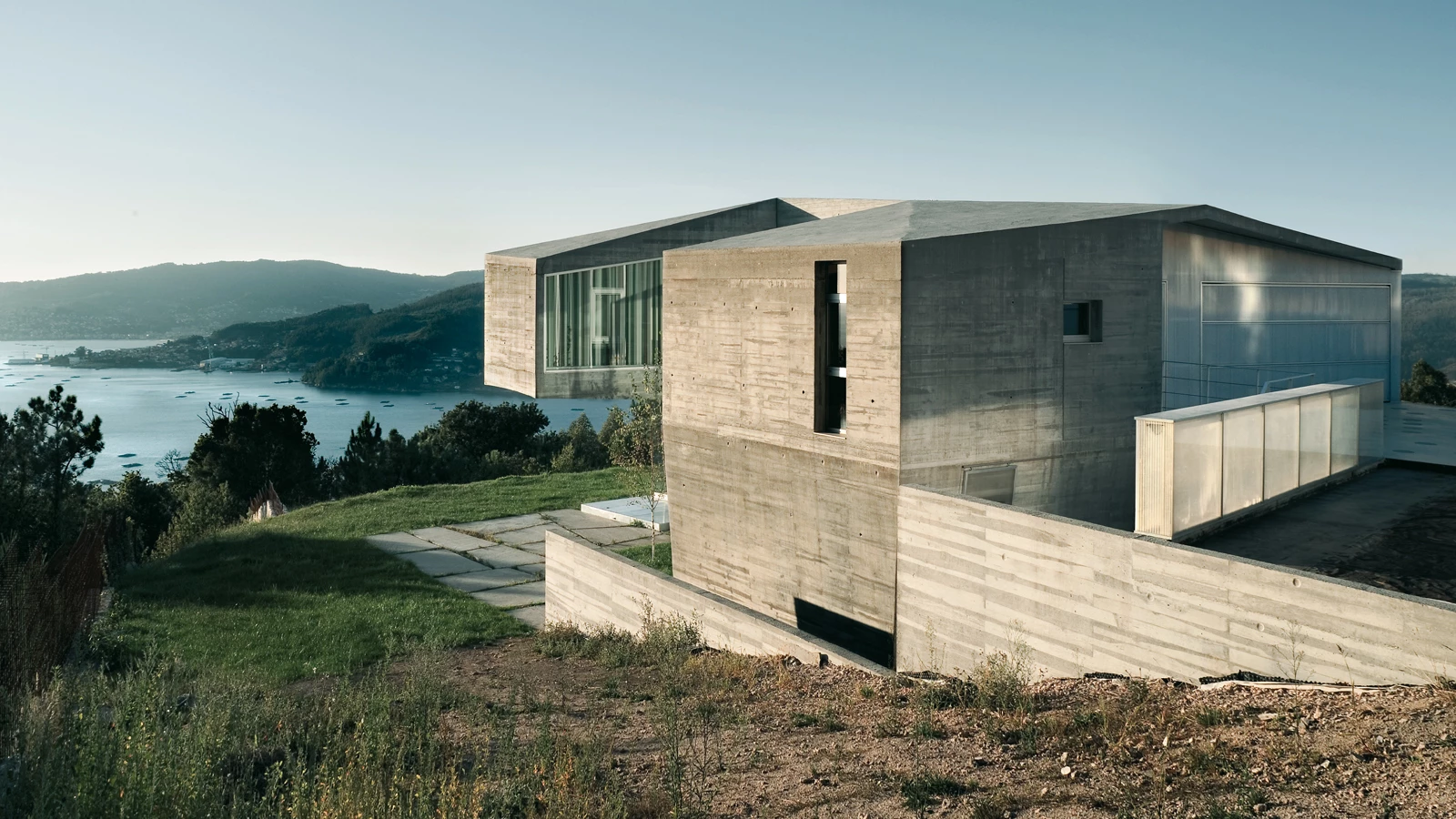Developed on two levels, the program is distributed between the top floor that includes the more social areas and the entrance on a C-shaped floor. This contour generates cross perspectives through the large glass surfaces covering the central void and tucks the living room into a cantilevering piece to appreciate the changing surface of the ria. The zone that is more closely connected to the terrain accommodates storage areas and an arrangement of bedrooms that permits a comfortable margin for transformation. A layer of concrete folds to round off the structure and acts as a retaining wall, generating at the same time spaces for different uses... [+]