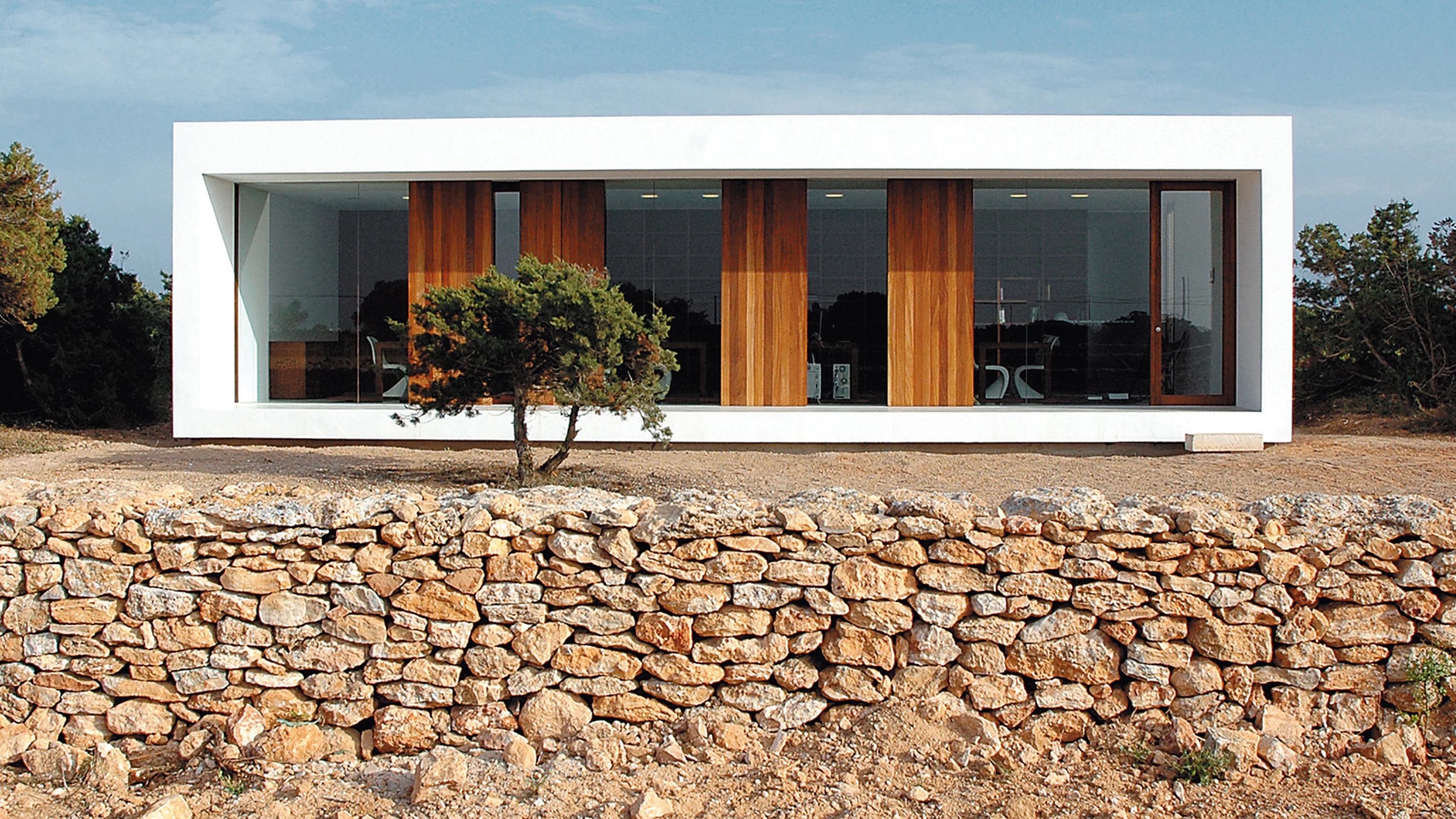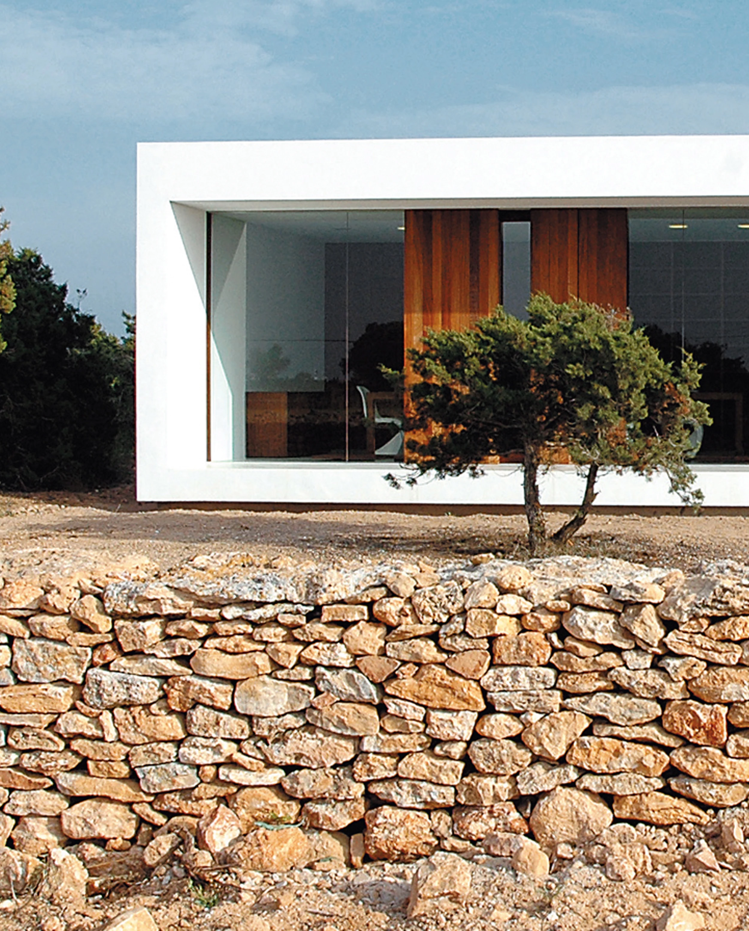 More than three hectares of fields of wheat and barley and a small woodland of savins, rosemary and junipers on a practically flat topography configure Es Pujol de s’Era, a place that depicts well the landscape of the Balearic island of Formentera. The existing vegetation and a fragment of an old stone wall determine the dimensions, orientation and total height of the new structure, the austere geometry of which recalls the vernacular constructions of the island. The wall also determines the position of the house on the site and becomes the north elevation of the building, blending it with the landscape. An old water deposit marks the longitudinal axis of the project, acting as an element that sparks a dialogue and tension in the organization of the floor plan. This is a proposal that avoids mimetism and pursues contextuality through the relationships with the environment.