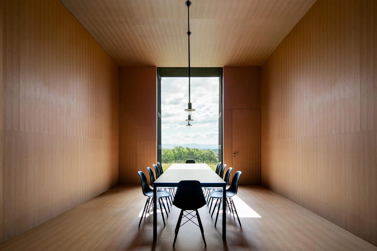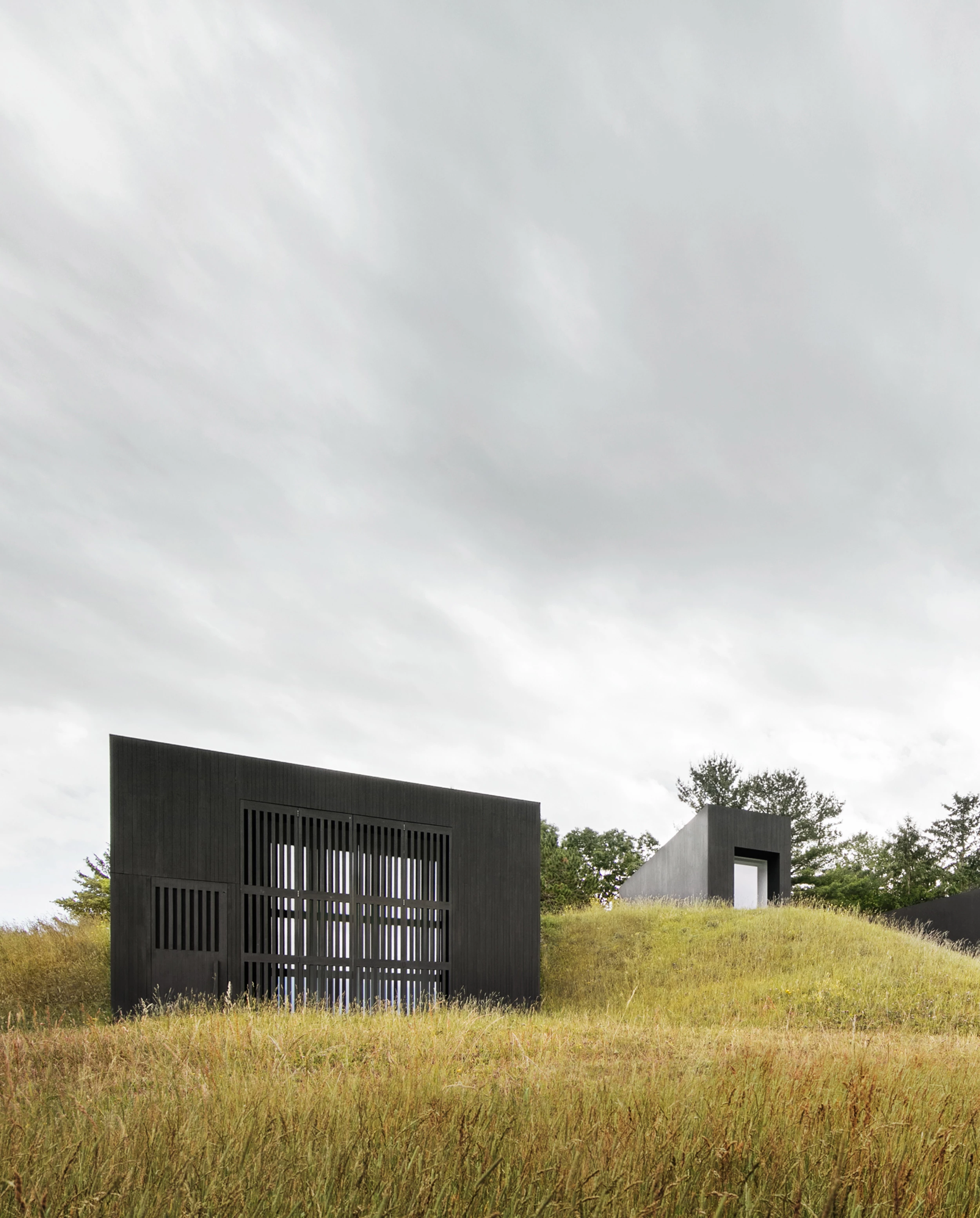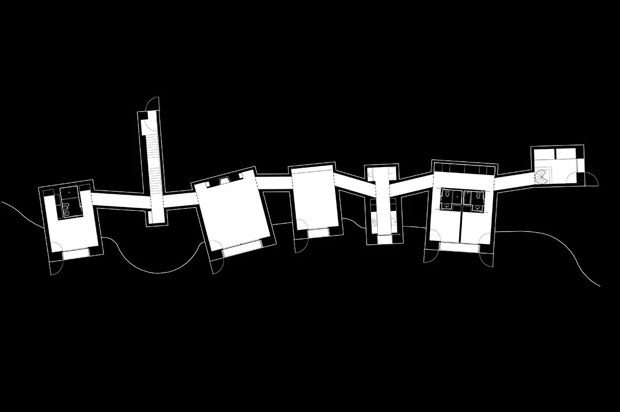 Each structure contains one room. Slightly raised interconnecting underground passages link the rooms spatially and conceptually. A small, elevated entry building leads down and into the passage that connects the house’s four bedrooms, kitchen, living, and dining rooms. Each room is focused on a large, glazed opening that provides spectacular views of the Catskill Mountains and access to the exterior. While on the outside the volumes are wrapped in an abstract black enclosure, a limited palette of colors is used inside, with white-toned walls and black floors, except in the dining room, which is clad in wooden panels.