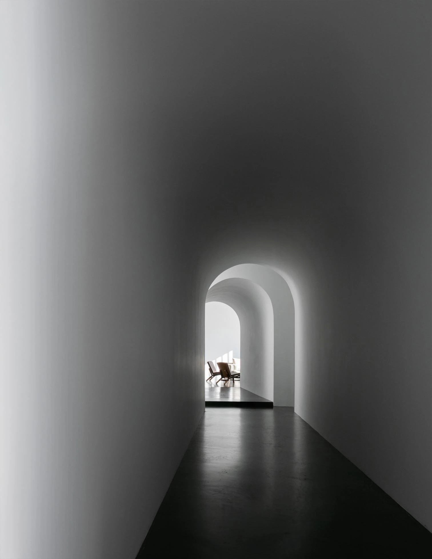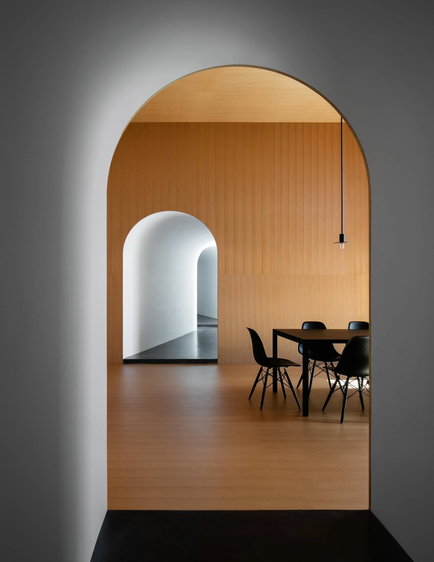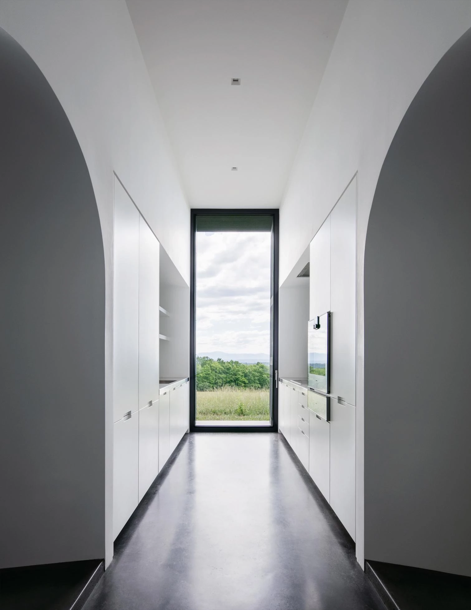 Each structure contains one room. Slightly raised interconnecting underground passages link the rooms spatially and conceptually. A small, elevated entry building leads down and into the passage that connects the house’s four bedrooms, kitchen, living, and dining rooms. Each room is focused on a large, glazed opening that provides spectacular views of the Catskill Mountains and access to the exterior. While on the outside the volumes are wrapped in an abstract black enclosure, a limited palette of colors is used inside, with white-toned walls and black floors, except in the dining room, which is clad in wooden panels.