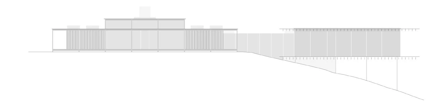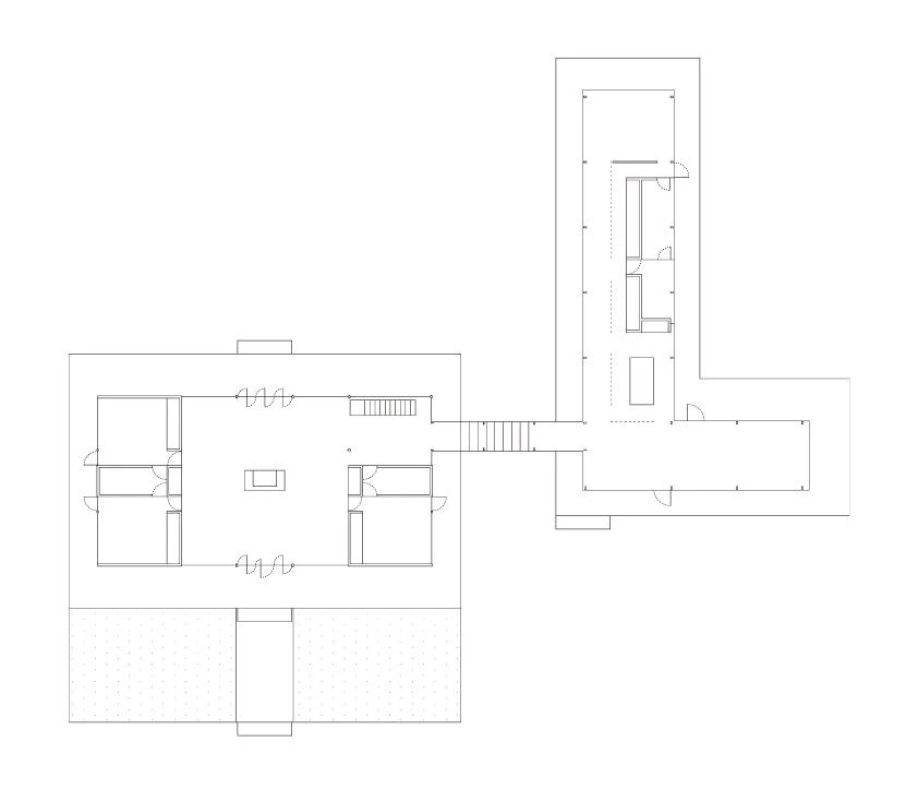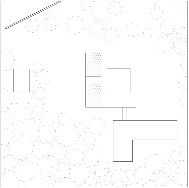 A new piece is added to the site, thus transforming its original isolated position, and is connected by a clear passage to the old volume, presenting in this way a new relation between nature and architecture, and framing private spaces within the woods. Aside from breaking the symmetry of the house, the renovation slightly alters its character with a screen of wood slats that transform the total transparency of the 1950s into a subtle or intimate transparency. The scheme proposes an L-shaped plan, which is considered the prototype of the staggering layout in traditional Japanese architecture, thus allowing two axes to cross, frame varied spaces, create a sense of floating in the corners, and allow one to change consciousness by turning. This effect is intensified here by displacing the columns’ position to the furthermost ends in order to enhance transparency.