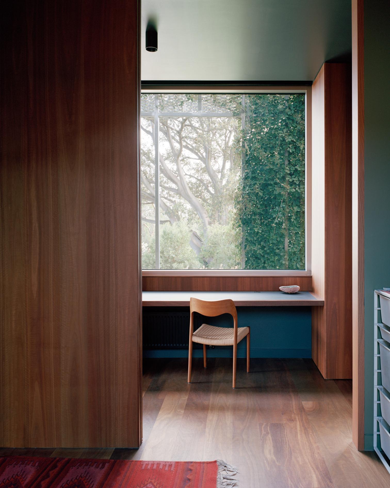 To reinforce the connection with the landscape and take advantage of the northern light, the main volume extends from east to west along the site’s southern edge. A perpendicular axis organizes the livable spaces, which open out to the garden through large sliding doors. The bedrooms are arranged efficiently, connected by a corridor that incorporates desks, lit by large windows that frame the natural surroundings.