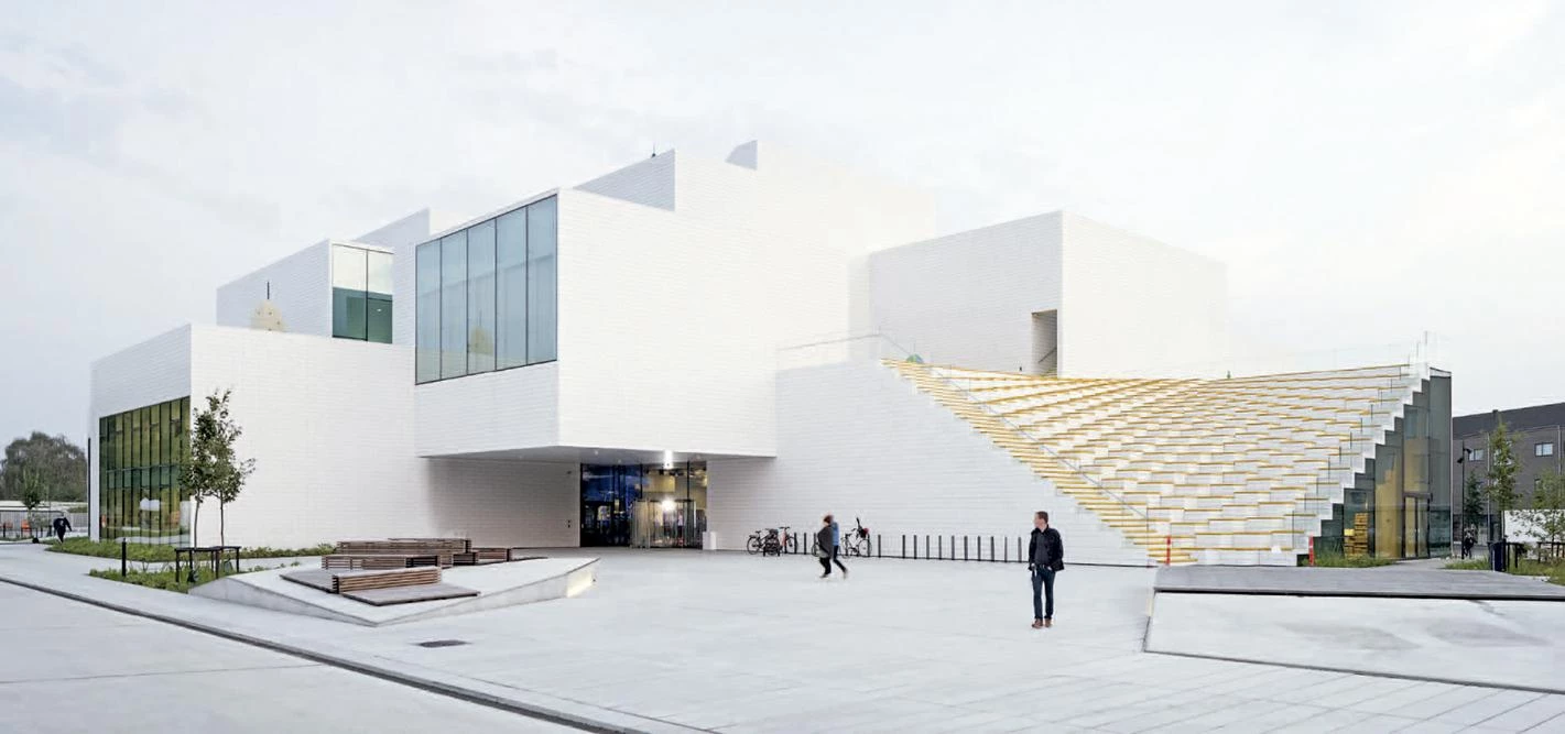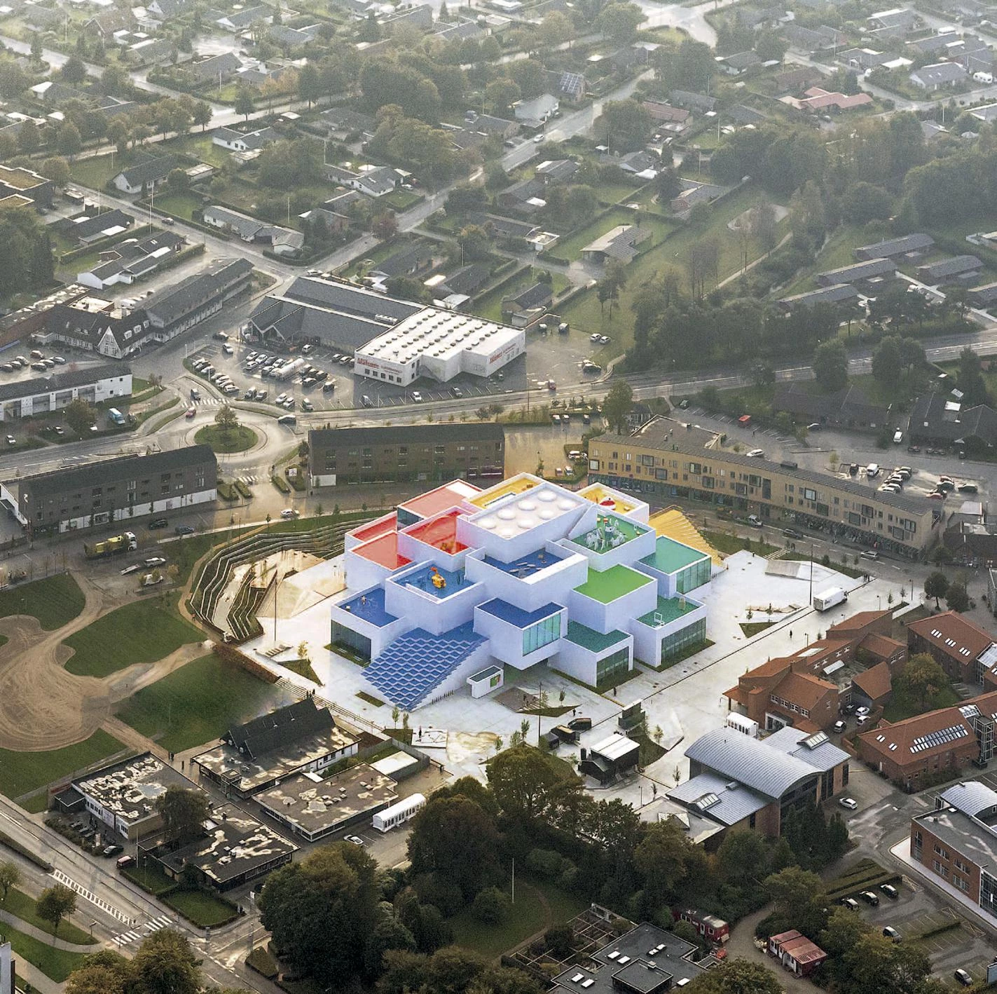 Formed by a stack of blocks whose roofs paint a vibrant chromatic palette, the new Lego headquarters evokes the creative play world of the famous Danish toy company.