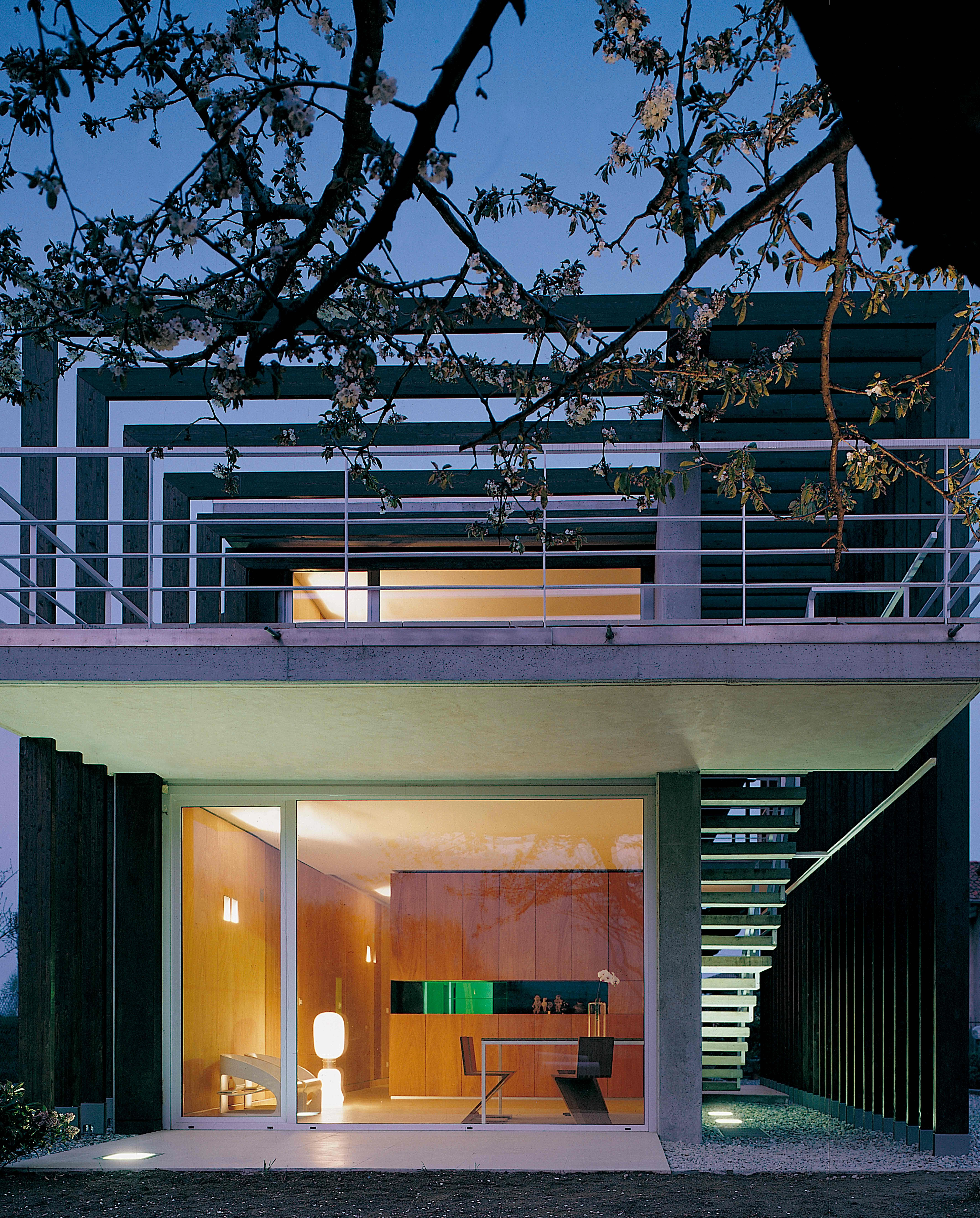 UdA | Architecture and Interior DesignOn a slope cultivated with fruit trees and endowed with views of the Alps, a two-story rural construction needed enlargement through rooms that would complete the day zones of the initial dwelling, on a plot of land occupied by a former barn. The project thus unfolds like a succession of filters orchestrating the spatial sequence that ensues from the closed dark structure of the existing house out to the open landscape. With the bathroom, kitchen and dining room placed at ground level, the living room-study upstairs enjoys a high panoramic view. An exterior staircase connects the garden to the terrace of the upper level and separates the volume of the house from an envelope of vertical fir wood slats that filters the light shining in, reinterpreting the porches and fretwork balconies typical of traditional architecture typologies...