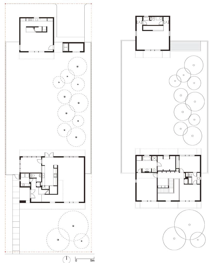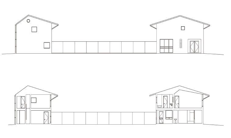 Although the two houses are separate and differ in area and volume, they both share several correspondences such as the exterior materials – mainly facing brick in an earthy tone –, the constructive detail of the roof overhangs that jut out of the facade and rest on metallic braces, and large windows with steel frames among others. Each house faces a different orientation of the garden within their shared bounded domain, opening up generously to the exterior and expanding their respective interior spaces.
