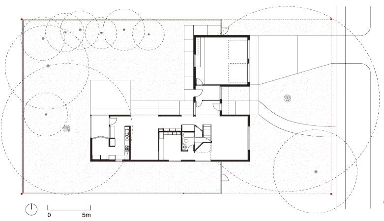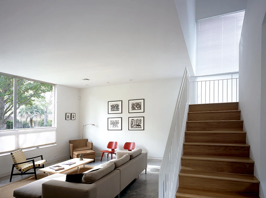 The 2,600 square foot house is located near Memorial Park, Houston’s largest nature reserve and public park. The house is carefully fitted amid existing trees. One of these, a matured live-oak tree prominently sited at the front of the property, is fully integrated with the architecture as a welcoming and all hovering canopy.