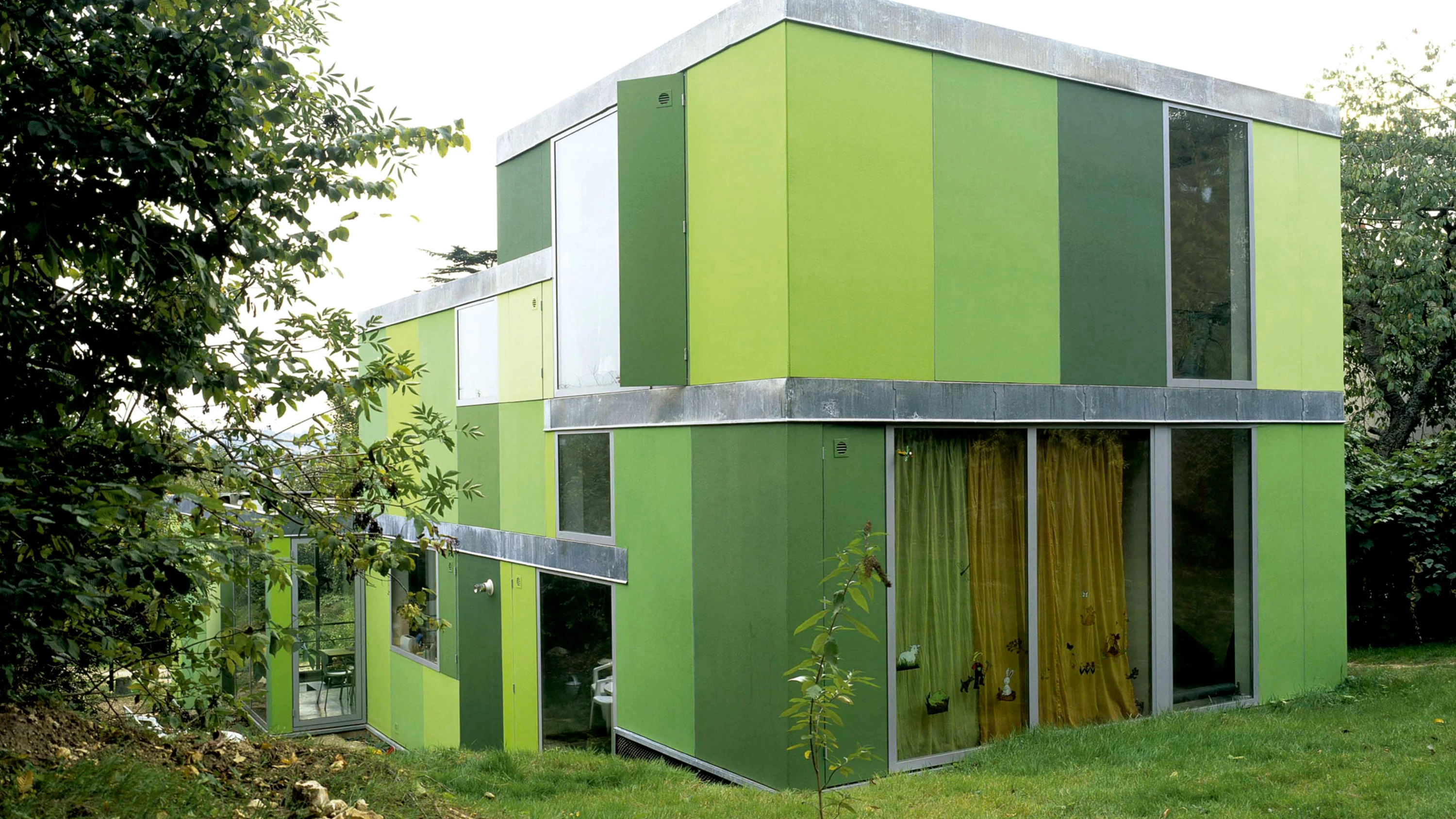 In the Marshy lands of the French region of the Marne, amidst a wooded vegetation of apple, cherry and pine trees, this green metallic house feeds on the landscape with the purpose of making itself invisible. The long plot, with a strong slope of fifteen percent, determined the position of the house, a series of cubes at different levels that follow one another in a north-south direction, so maintaining a plot occupation which recalls the old agricultural uses of the area.