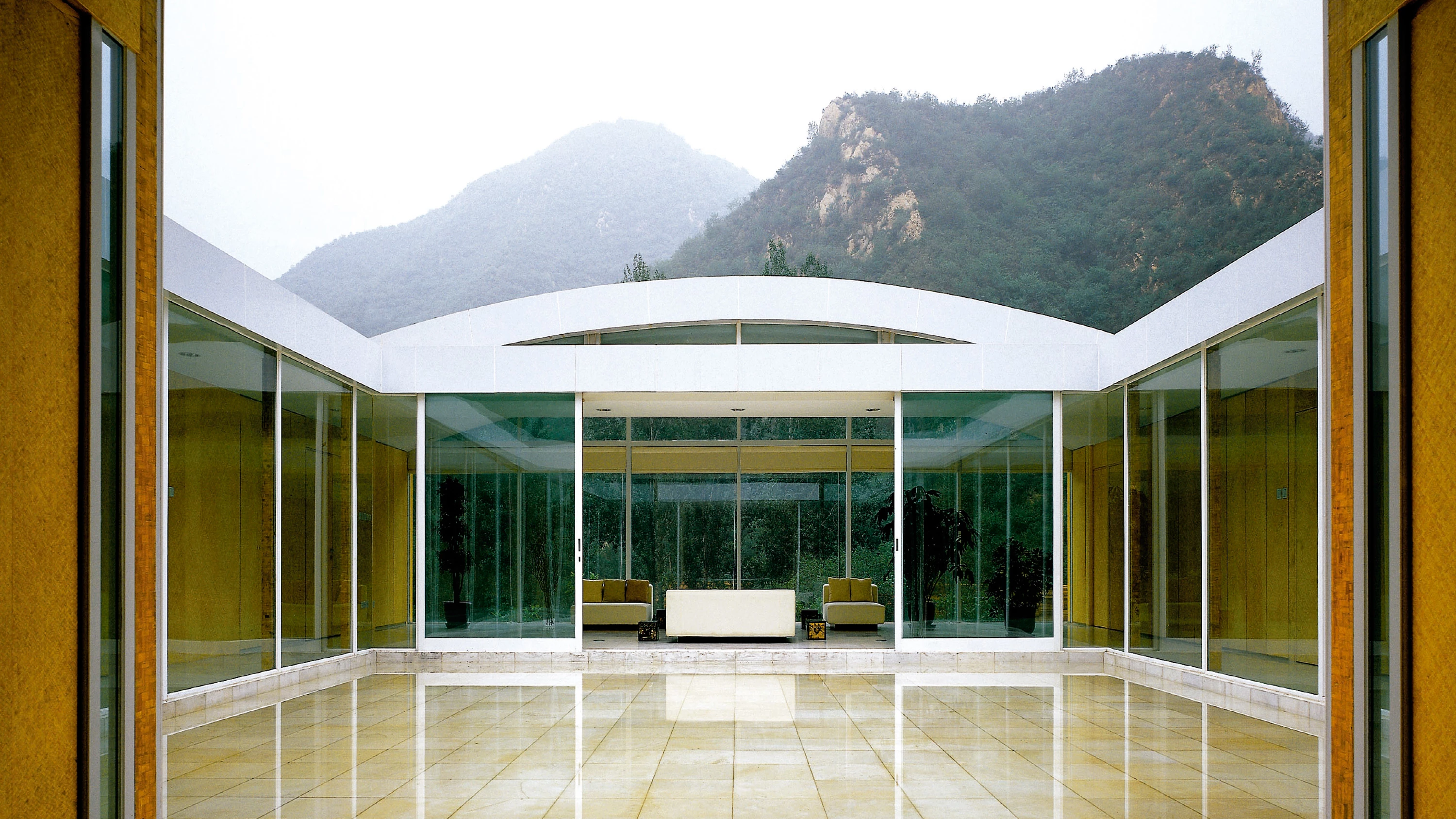 The first sketches of this house took shape after visiting the site, located in the lower area of the complex and close to the point of arrival to the Great Wall Commune. The design consists of a one-story building with a squared floor plan around an also squared courtyard, a style that is not very far from that of vernacular residential architecture. The entrance, on the southern side, leads to a hallway from which one can see an exterior courtyard – whose base, according to the project, should be covered by a layer of water, although some problems during construction have made this impossible for the time being–; rooms, kitchen, dining room and services follow one another in a ring around the courtyard, linked by a corridor which is interposed between courtyard and rooms, completely glazed and through which one can circulate without obstacles. The bay on the northern end is partition-free, linking the domesticated exterior of the courtyard with the natural one of the mountains.