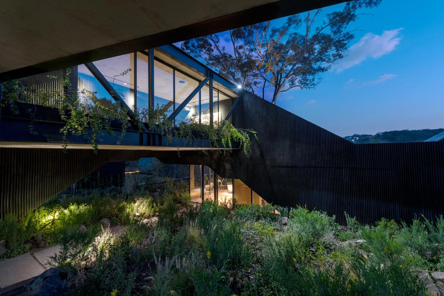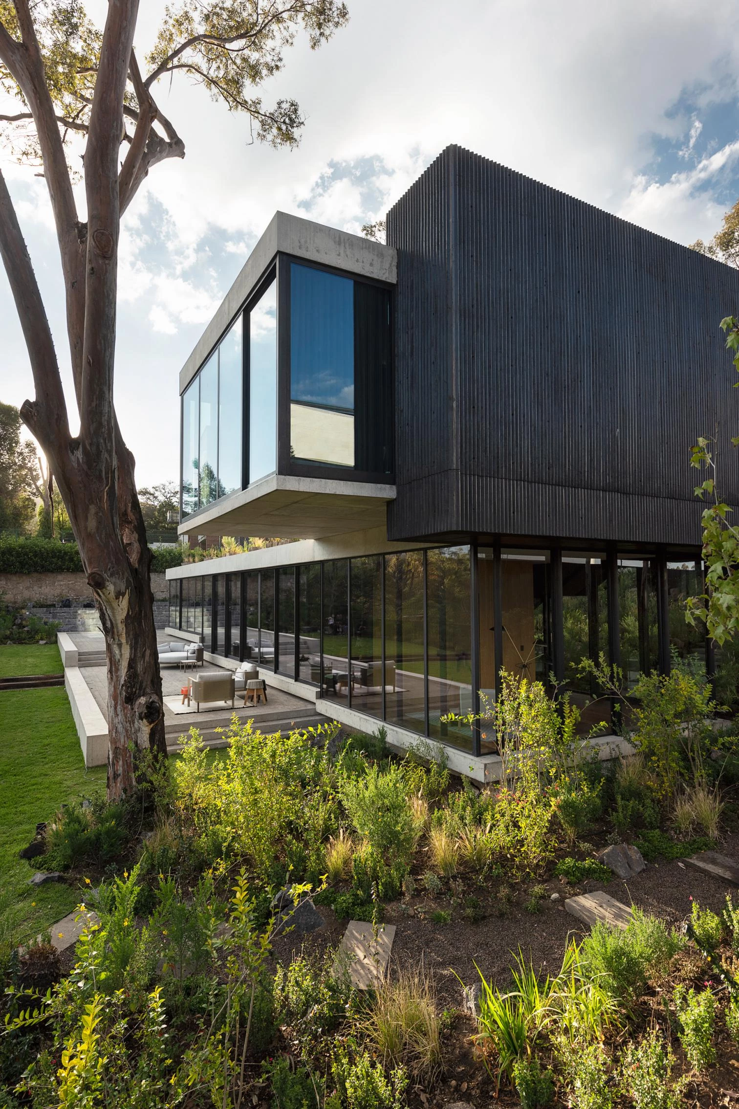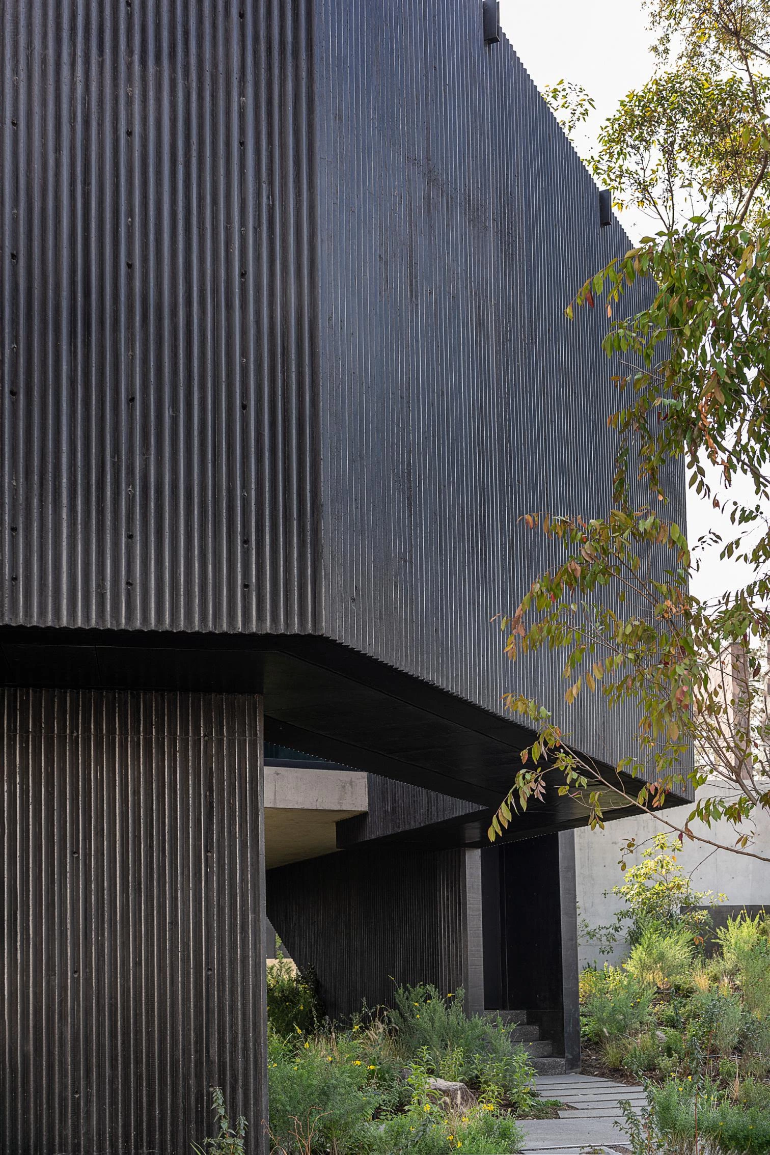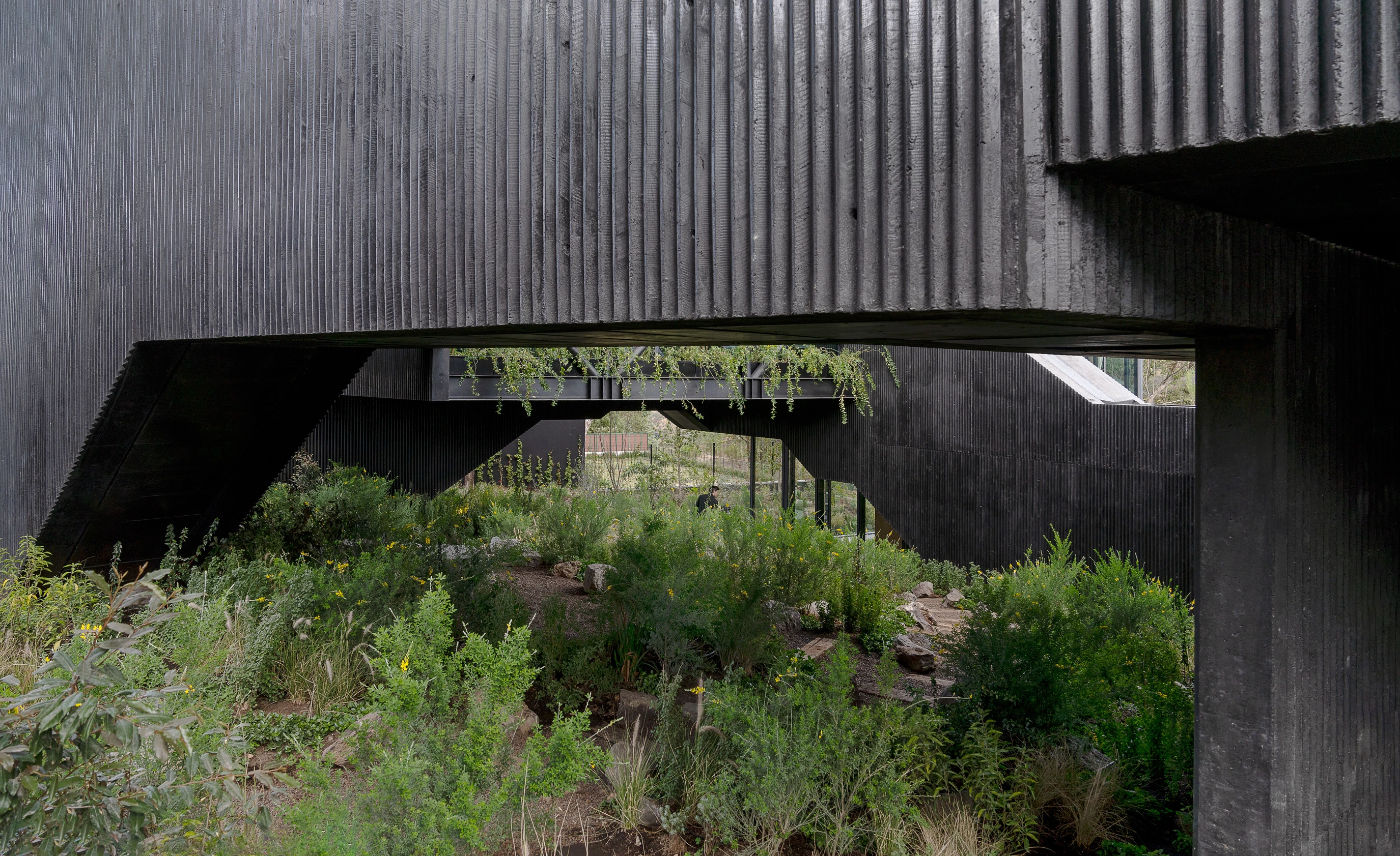 Located in Hacienda de Valle Escondido, a locality under the jurisdiction of the municipality of Atizapán de Zaragoza, in Mexico, this building transforms the traditional residential program into a scheme of labyrinthian routes by means of stairs and circulation elemente. The house of grooved black concrete presents various toplit entrances in shade. The solid volume is elevated, freeing up a garden abounding in lush vegetation. This snaking element embraces the courtyard over which the rooms hover.