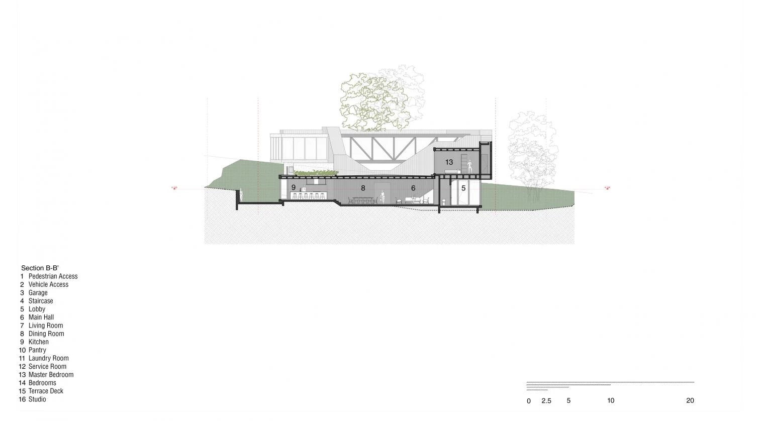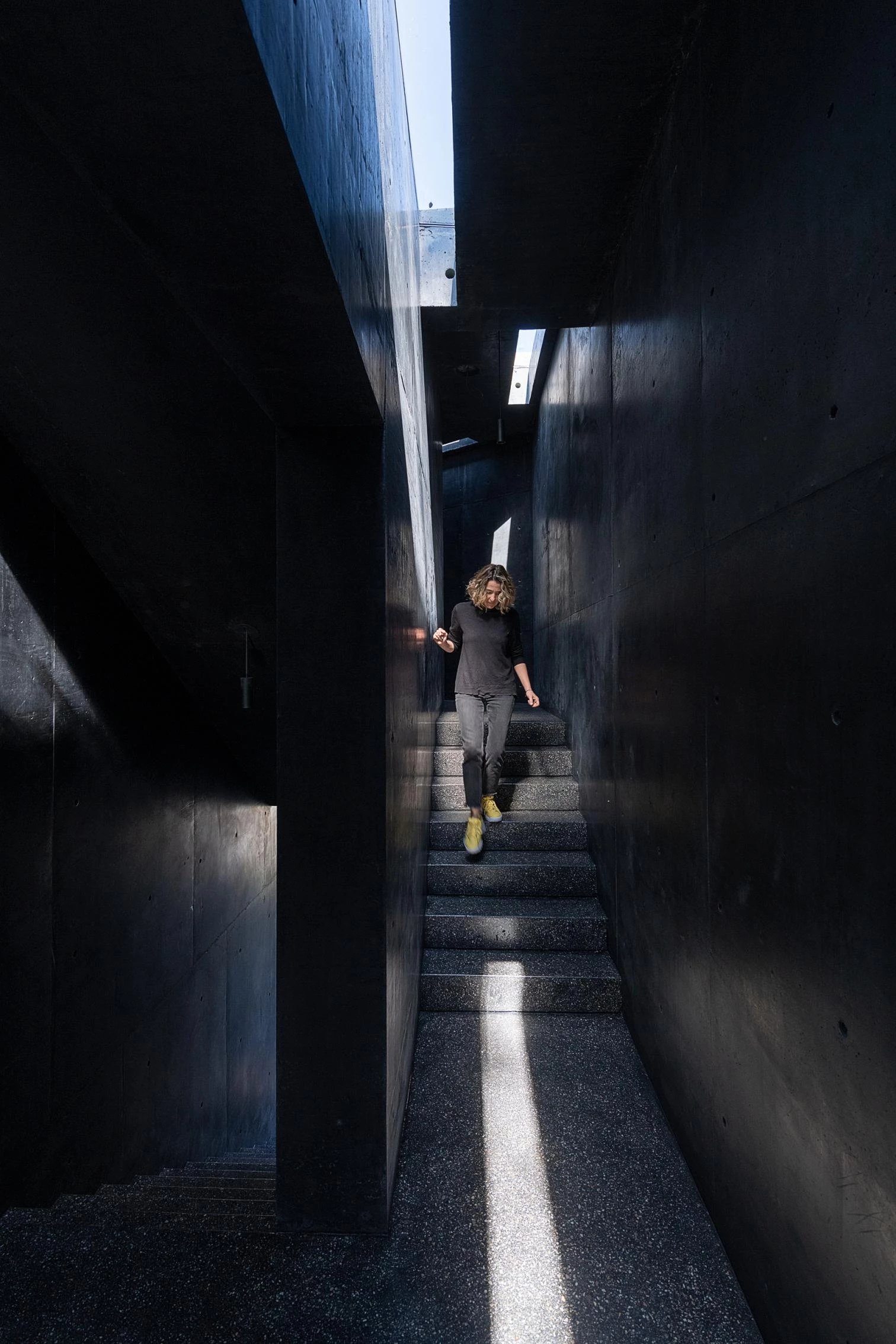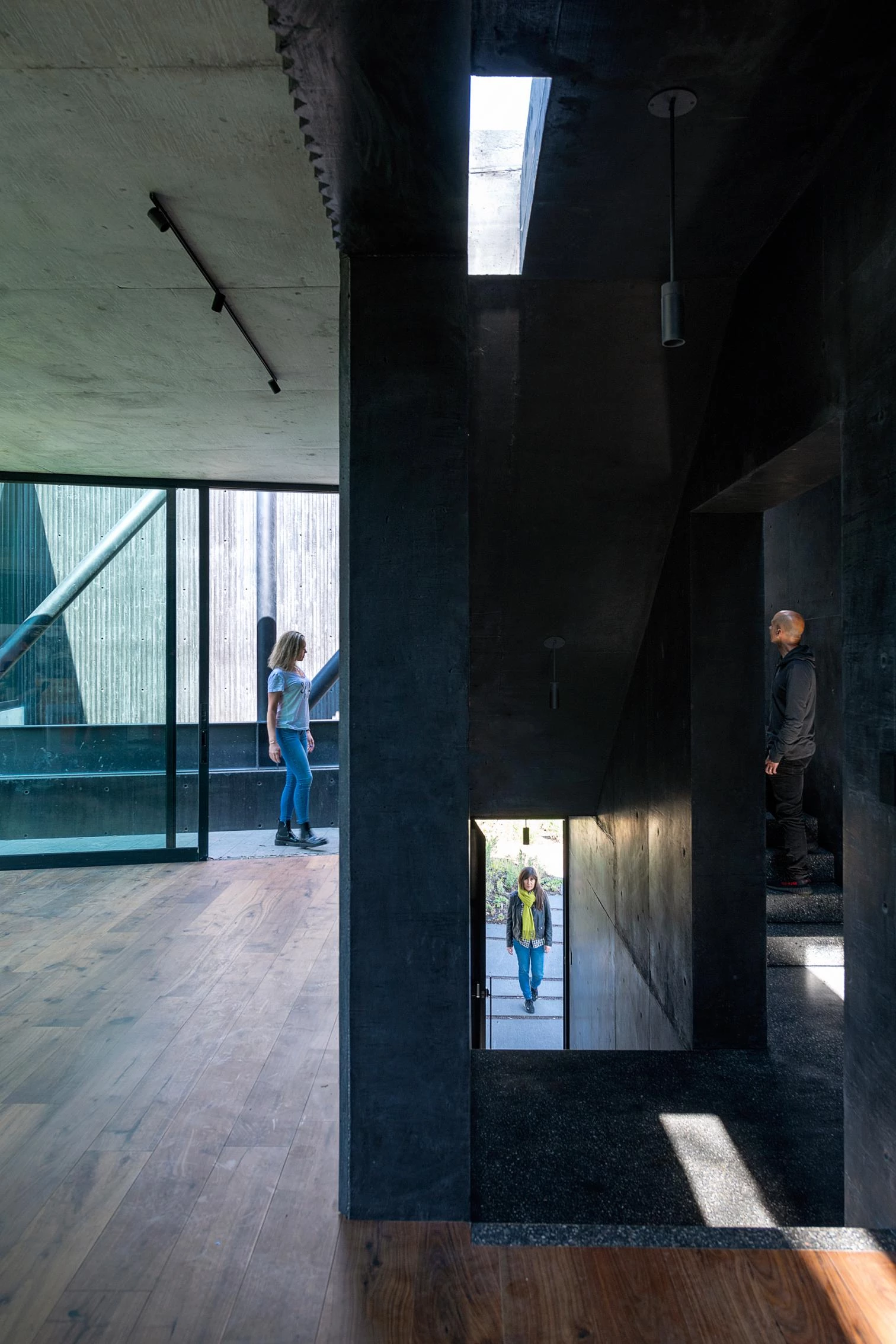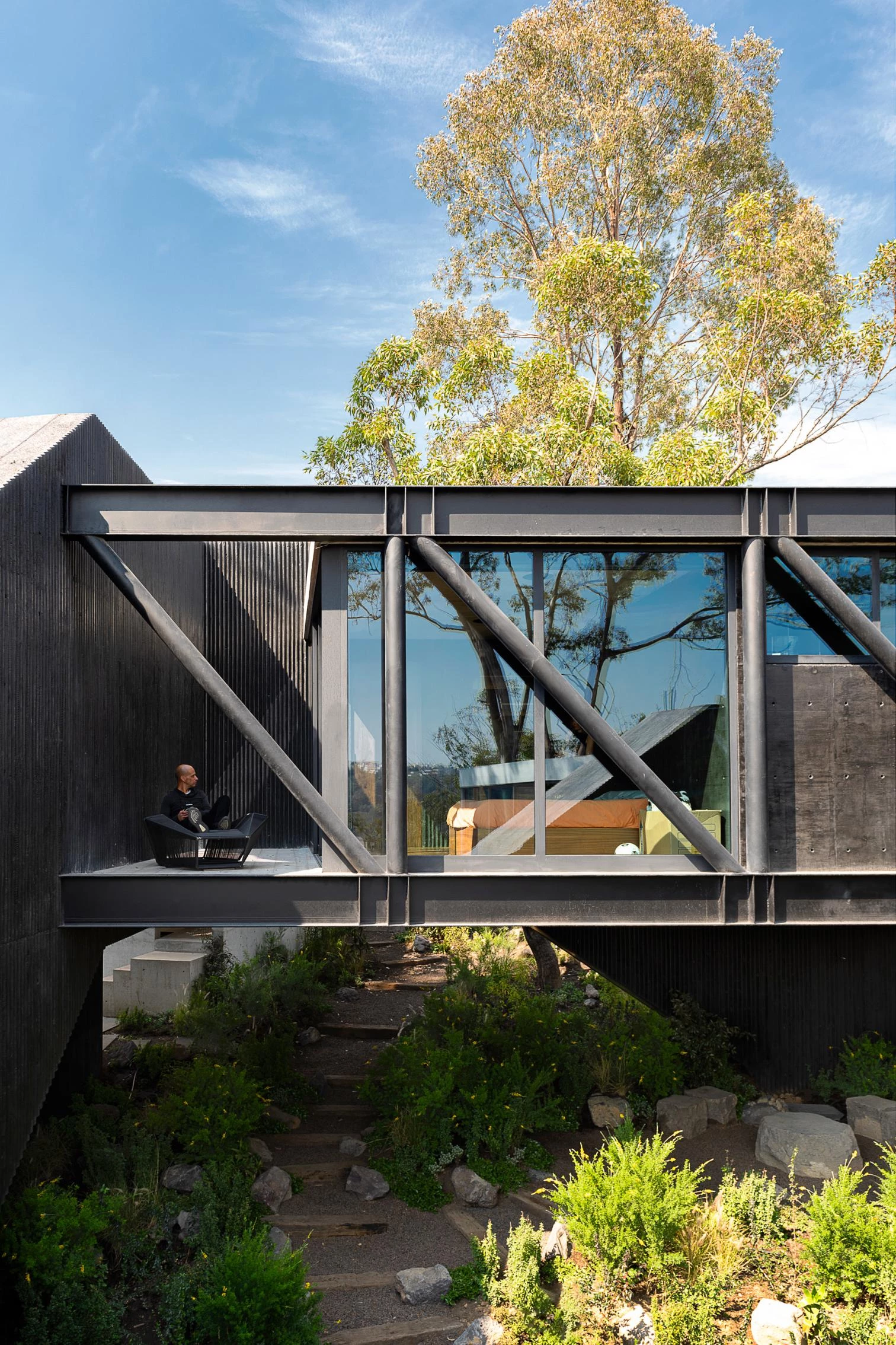 Located in Hacienda de Valle Escondido, a locality under the jurisdiction of the municipality of Atizapán de Zaragoza, in Mexico, this building transforms the traditional residential program into a scheme of labyrinthian routes by means of stairs and circulation elemente. The house of grooved black concrete presents various toplit entrances in shade. The solid volume is elevated, freeing up a garden abounding in lush vegetation. This snaking element embraces the courtyard over which the rooms hover.