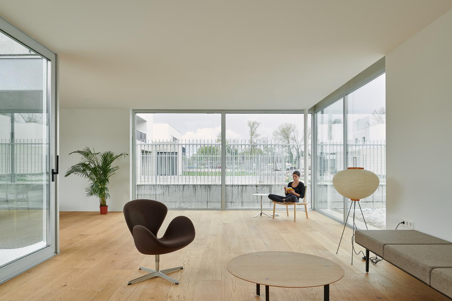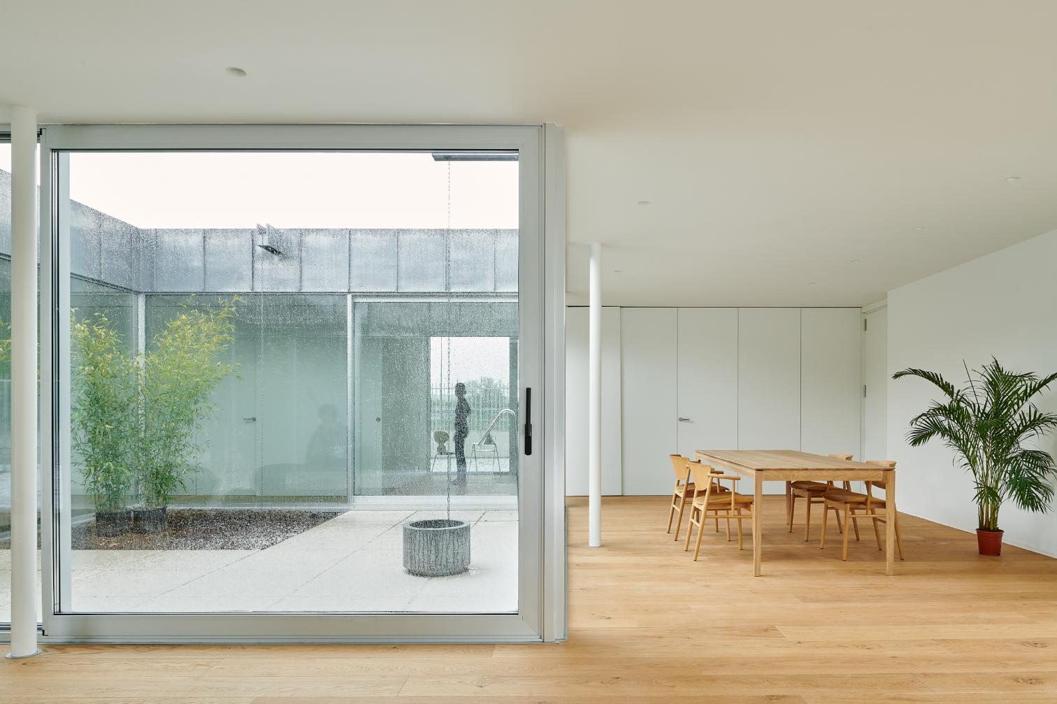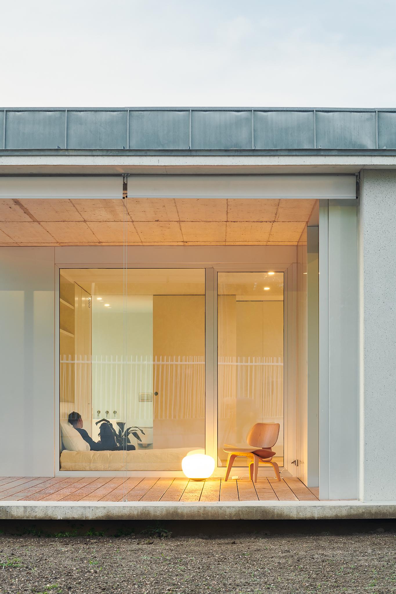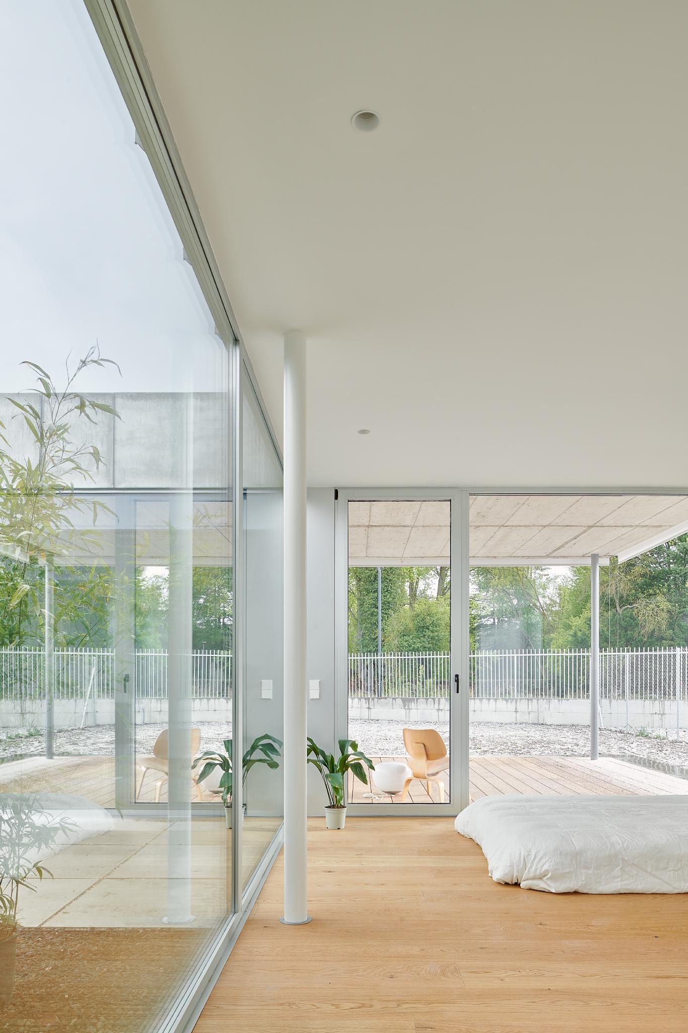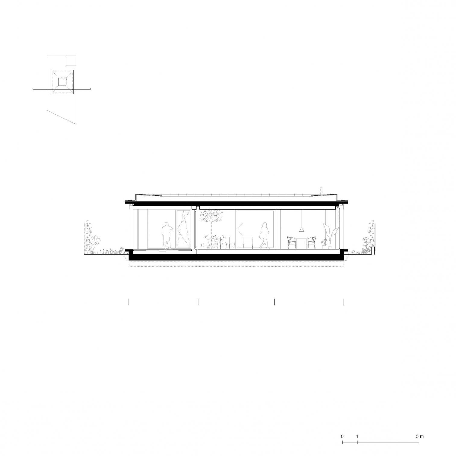 This house stands on a flat rectangular plot and is designed as an open and flexible domestic space, adaptable to changing needs over time. The simple single-story construction unfolds in a composition of two squares: the larger one, measuring 15x15 meters, is divided into nine 5x5-meter squares; the smaller one, with 6.5-meter sides and located to the northeast, harbors the garage and services.