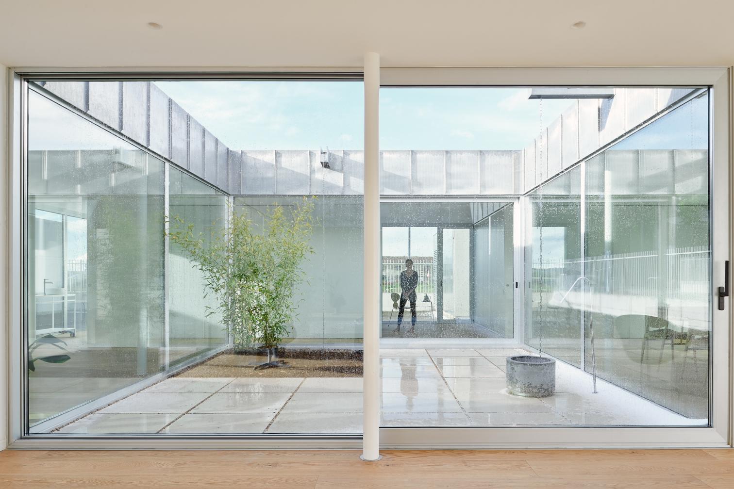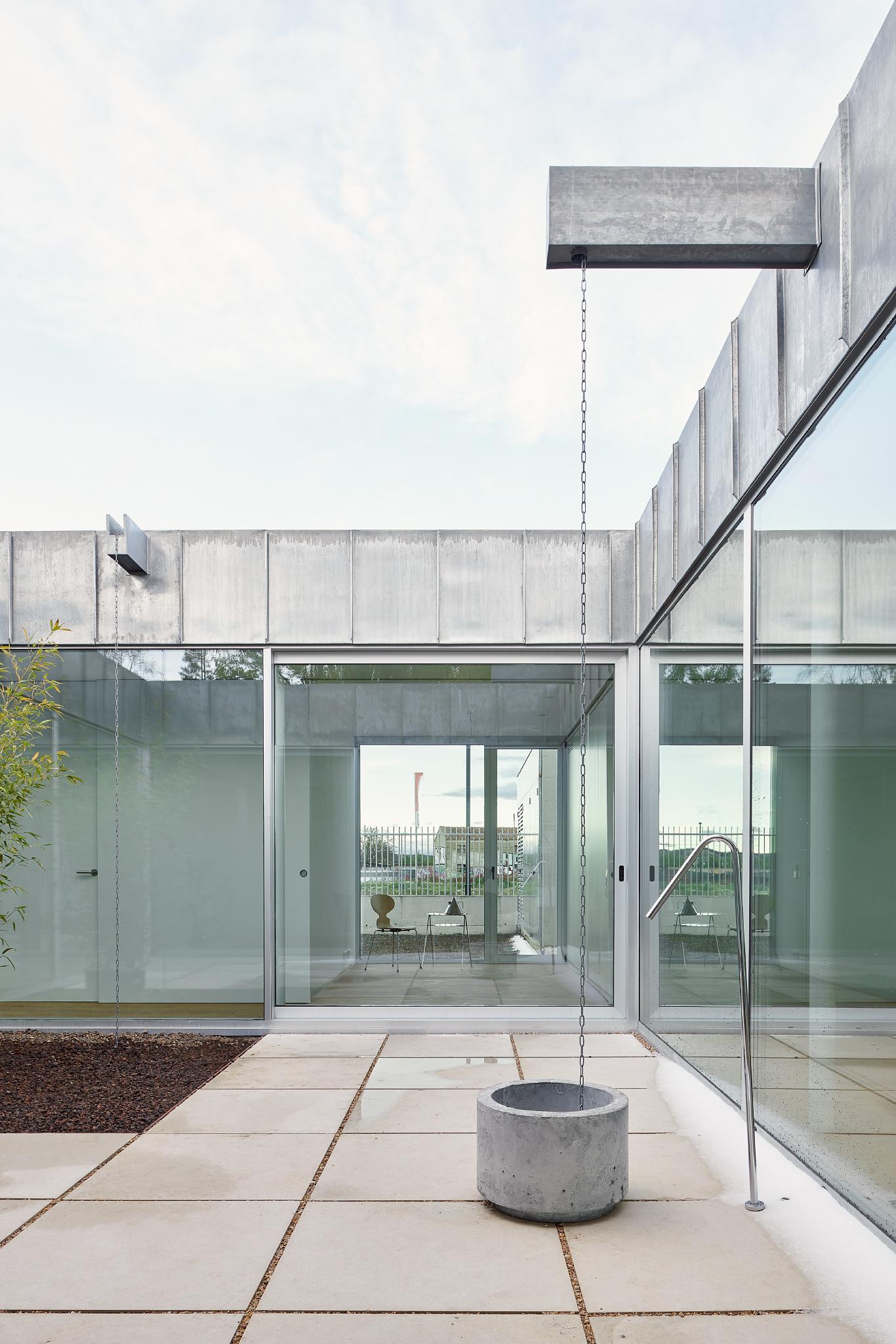 The heart of the project is a 5x5-meter patio that guts the main piece at its center and visually links all the spaces of the house. It also functions as an impluvium, channeling rain from the zinc roof into two gargoyles for irrigation and to transfer water to a circular fountaion.