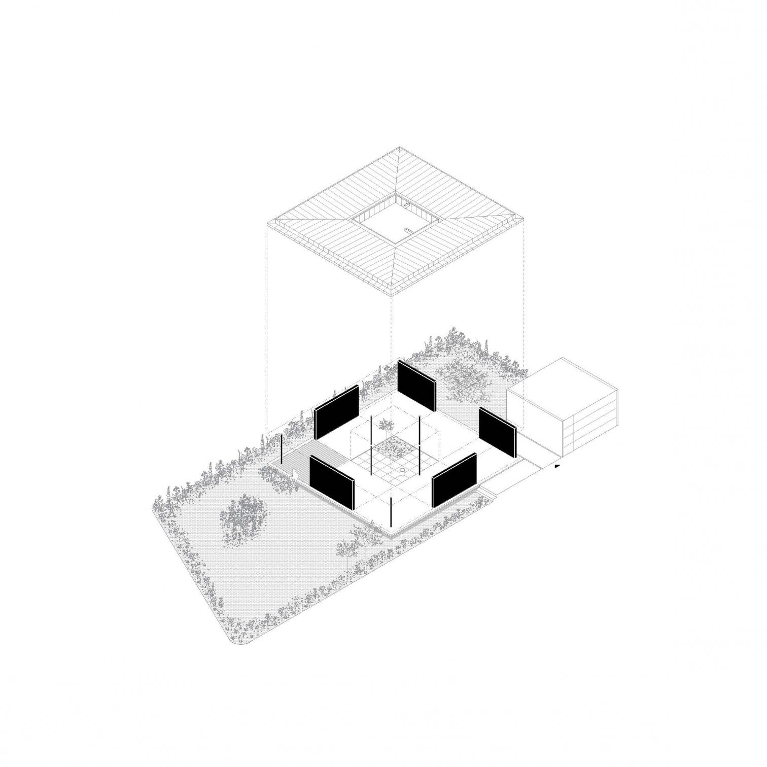 The building’s structure presents five walls of precast concrete and six lightweight steel columns. The four that surround the courtyard face the blind perimetal walls of the house, avoiding the corners of the patio. The remaining two, located at the southeast and southwest corners, occasionally serve as braces.