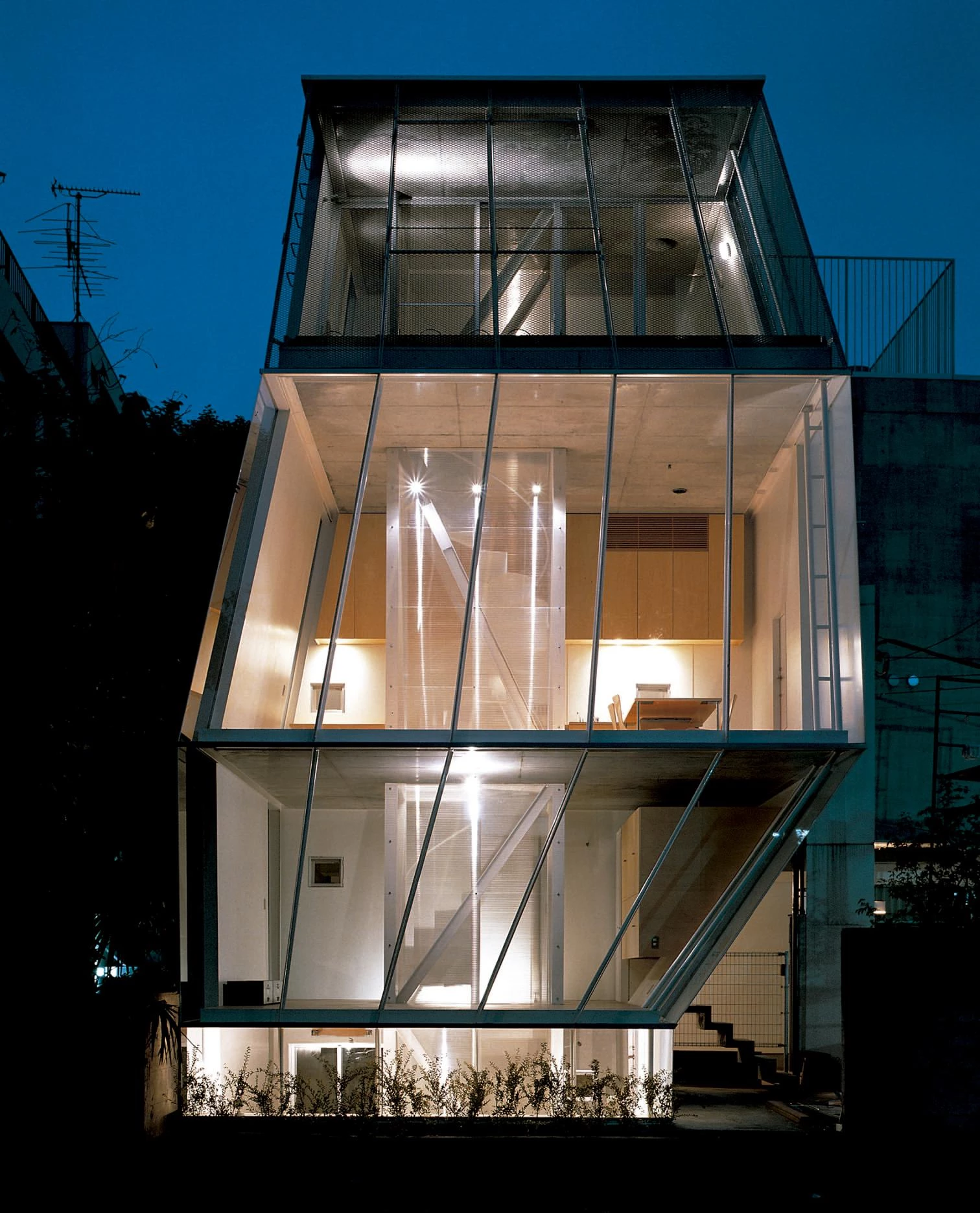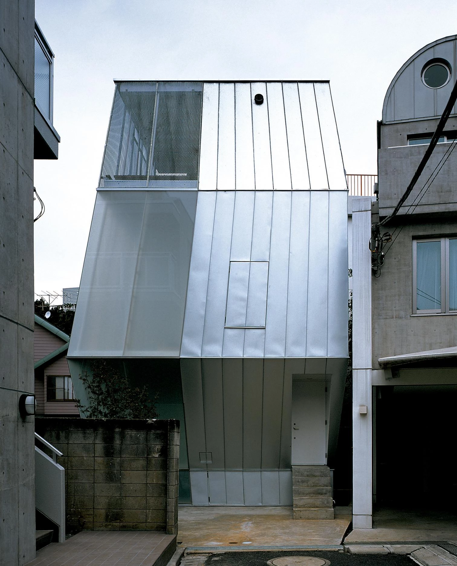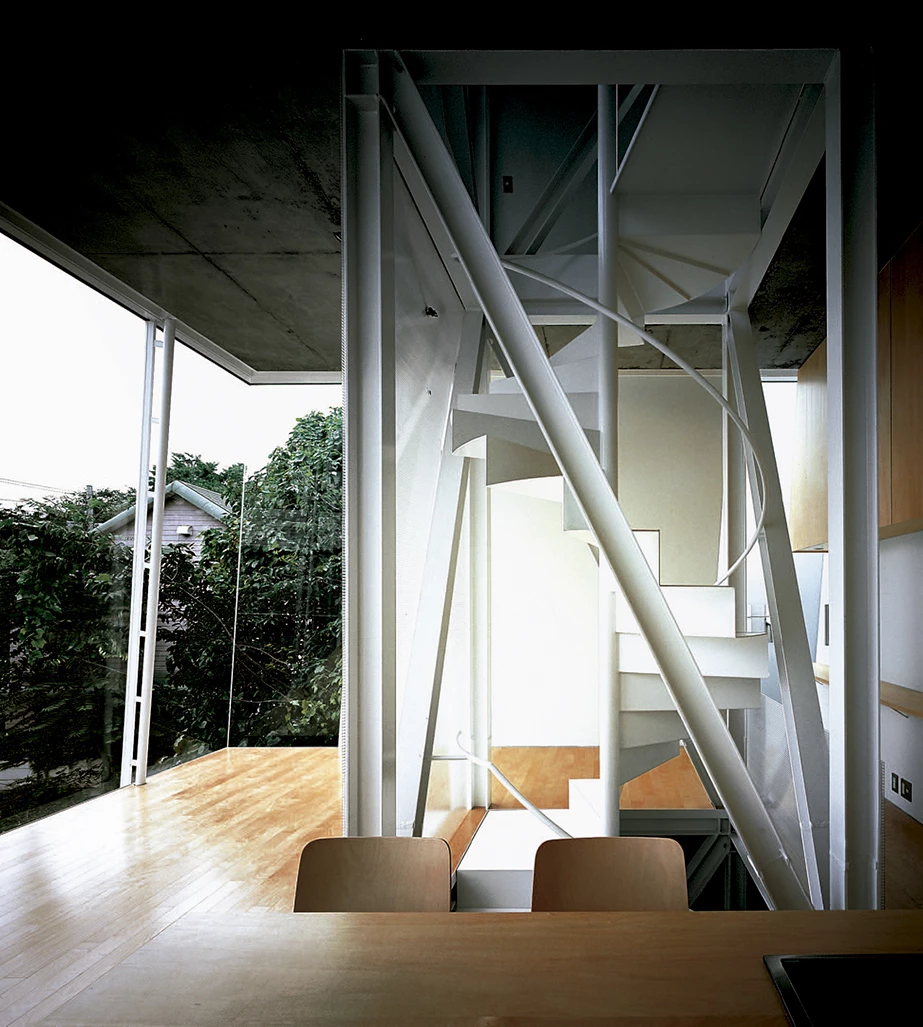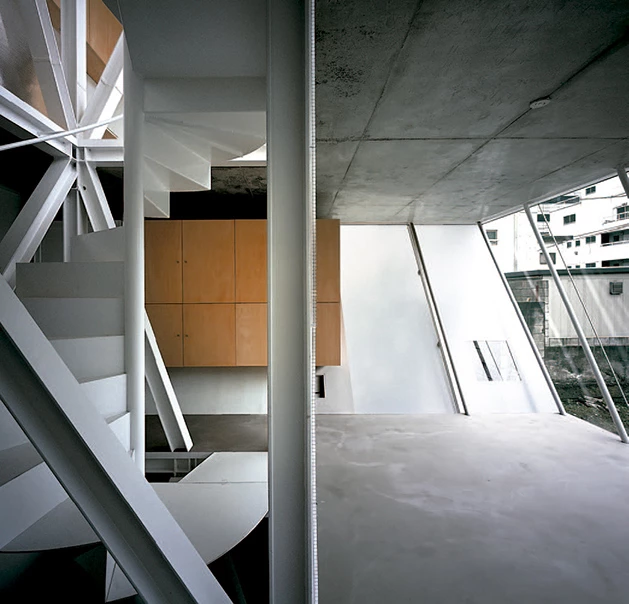 In the dense and indifferent fabric of the center of Tokyo the price of land is so high that building costs are not as significant in comparison. This situation has a clear influence on the built landscape, which changes at a speed that would be unthinkable in other city centers. This small house for a Sony executive, his wife and son, goes up at the end of a short cul-de-sac in the affluent neighborhood of Aoyama, on such a small site that it was necessary to exploit in the upper floors every square centimeter of the allowable imprint.