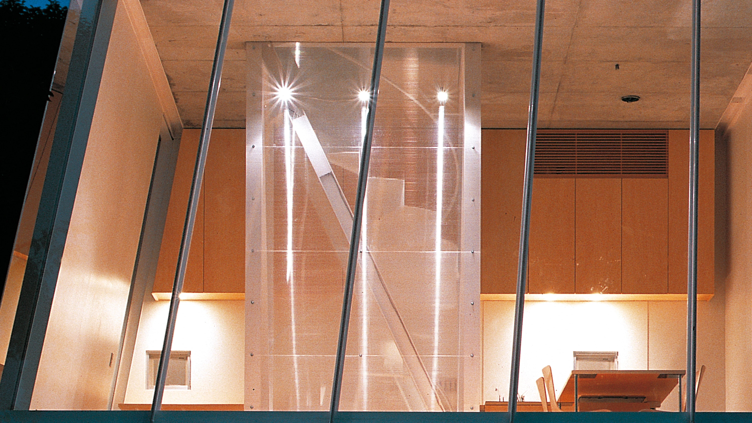 The volume rises as a small and angular beacon that is wrapped in skins of different transparency depending on the relationships with the neighboring buildings. To south and east, the house is wrapped in opaque zinc sheeting with standing seams and hides a few service hatches; however, the north and west fronts are made almost entirely of glass to open up the interior spaces to the views of the gardens of the adjacent temple. The climate in the Japanese capital is characterized by cold, harsh winters and warm, rainy summers, and the house has only a few operable windows, so the staircase shaft acts as a thermal chimney that moves the warm air upwards, where it is expelled.