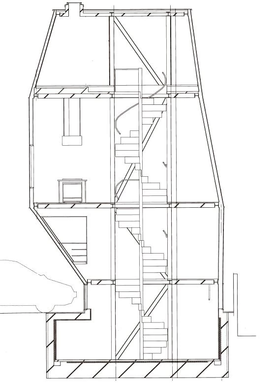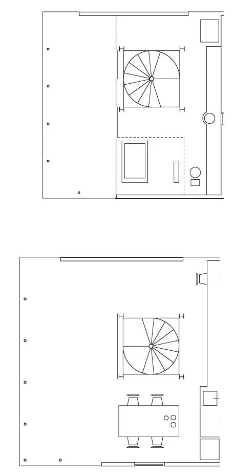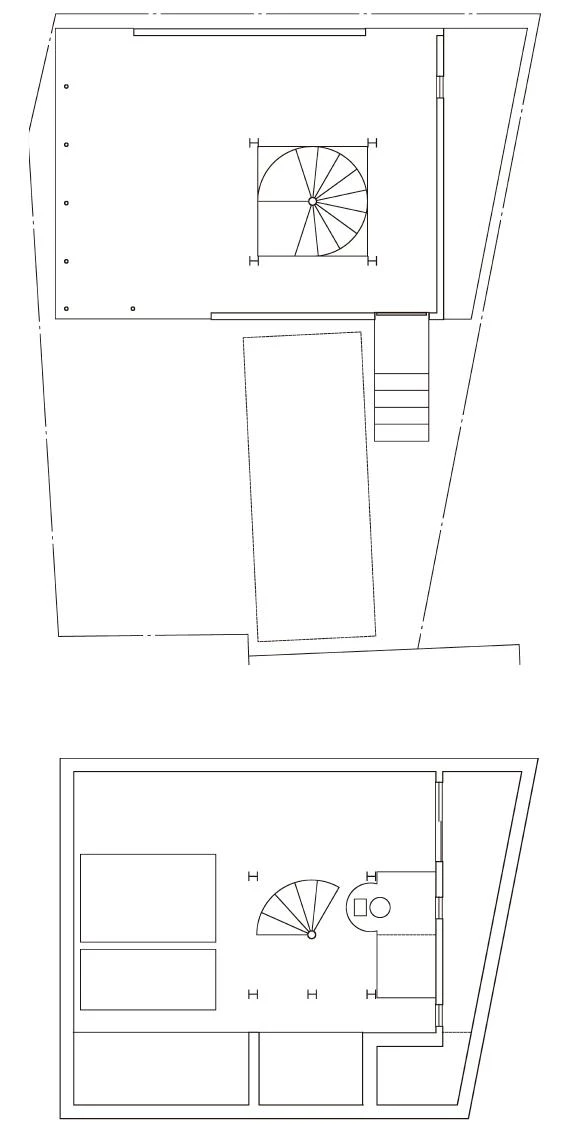 On ground floor only 36 of the 60 square meters available have been occupied, so, in order to accommodate the necessary domestic spaces, the house expands in the middle and tapers in towards the roof. To make the most of the reduced surface of the plot, the house is divided into four floors, each one corresponding to one domestic space, vertically stacking the spaces to form a miniature tower. A spiral staircase organizes and links all four floors, starting at the semi-basement– where the parent’s bedroom is – and followed by the hall and guest bedroom slightly aboveground level. From here one reaches the first floor, with a greater area and height, with the living-dining room and kitchen, and the house ends in the upper floor with a large bathroom and an enclosed roof terrace.