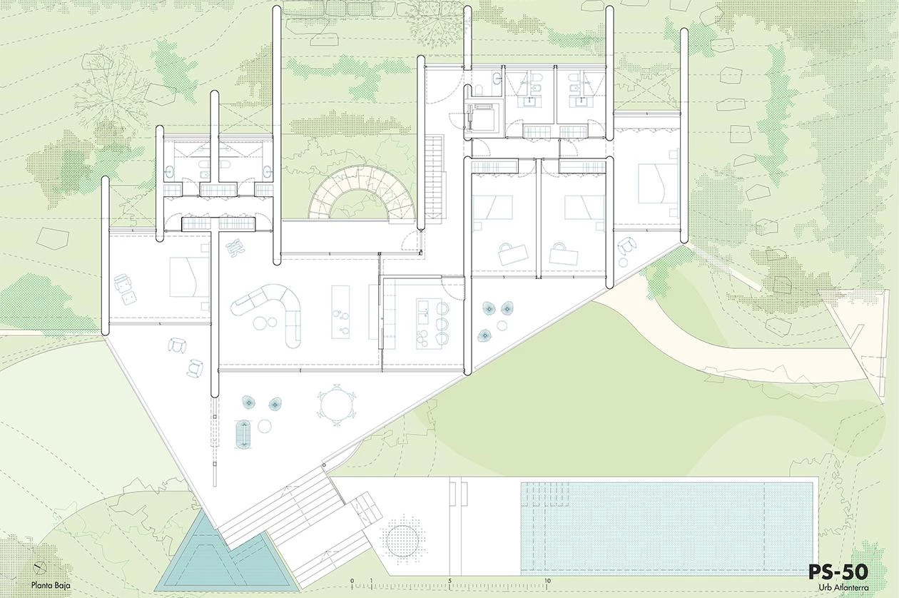 Located in the southernmost part of the Iberian Peninsula, where the Mediterranean Sea and the Atlantic Ocean meet, the lead character in this project is the rugged coastal landscape, concealed here under an intensive green roof that restores the existing vegetation. The zigzag pattern of the roof makes it possible to cover long spans and reduces its own weight, as well as conveying a sense of near-impossible lightness, almost like that of a fabric blowing in the wind. A series of parallel walls organizes the house plan. Their placement allows the organization of uses, as well as managing the changing easterly and westerly winds. The access to the house is in the lower level, through a courtyard that opens to the sea and from which cascading terraces and stairs lead to the swimming pool and garden. In the upper level, behind a generous helical staircase, a lush garden sheltered from the wind functions as a transition space with the domestic interior. The material palette chosen – lime stucco walls, horizontal concrete surfaces, reflective steel, and dark window and door frames – makes the house difficult to see from the sea, as it sits hunkered down among the vegetation, mimicking the colors of the natural surroundings.