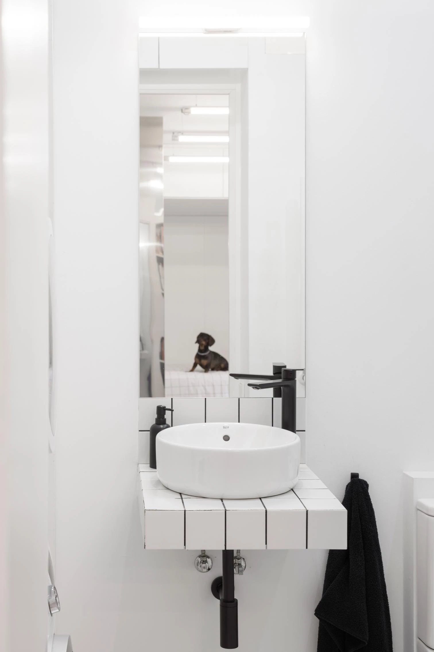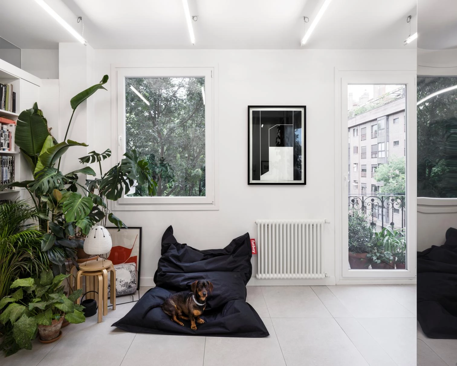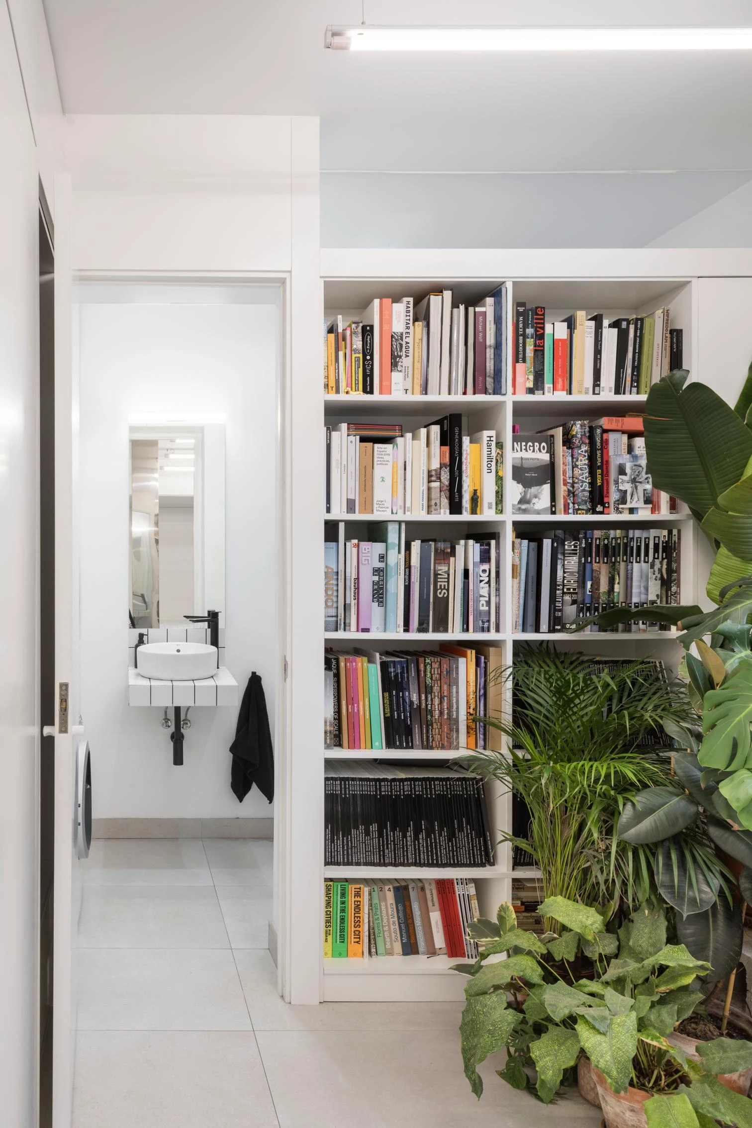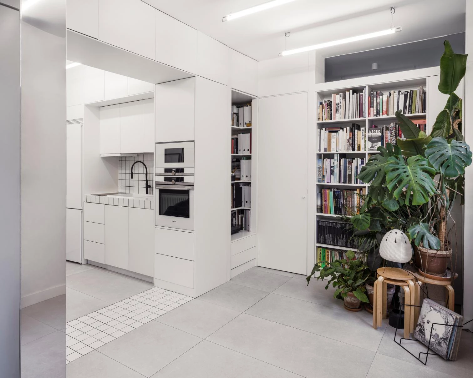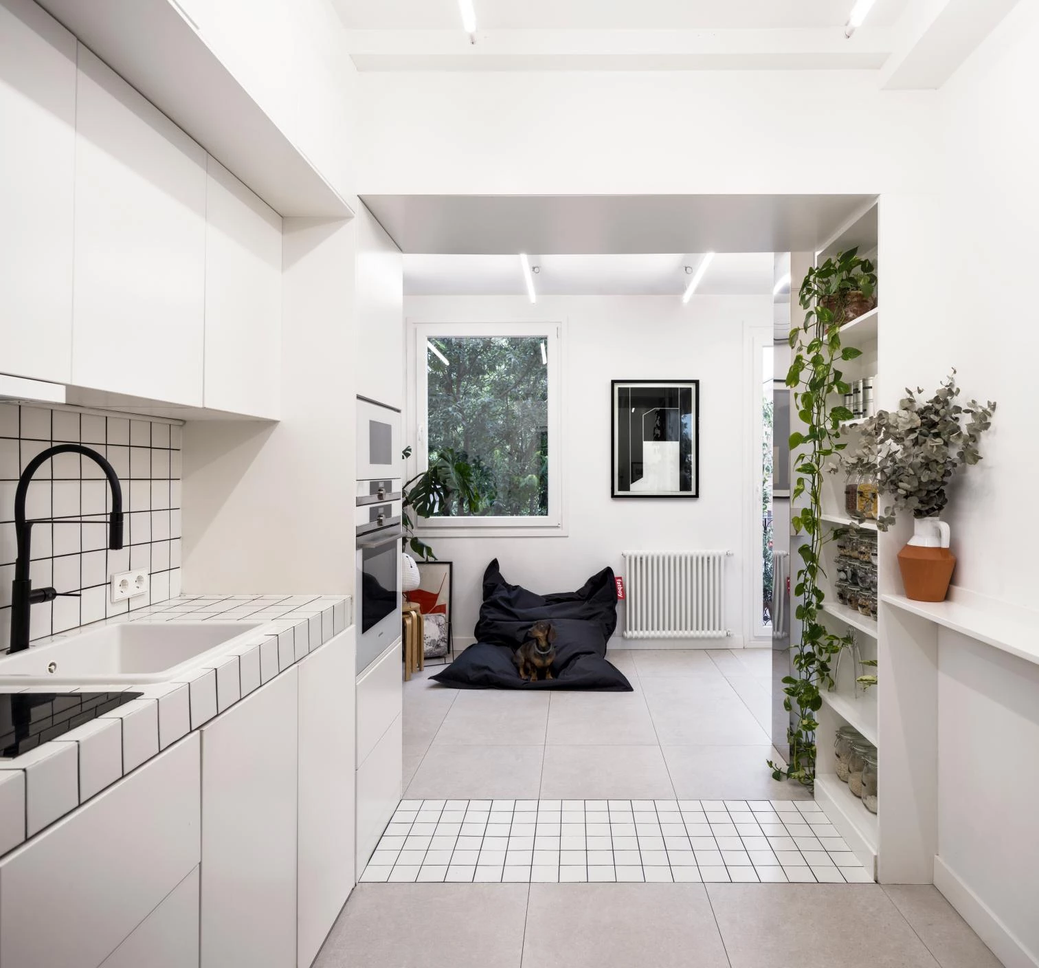 The presence of a mighty poplar tree in front of the windows was a cue to make the dwelling open out to it. This required restoring the original arrangement of openings, which in turn was an opportunity to replace the frames with single-layer, more impermeable joinery. Also contributing to the bright interior is a palette of materials – a combination of ceramic floors, white-lacquered wood, and tiles for humid areas – that is neutral, nuanced only by the people and belongings gathered to form the household.