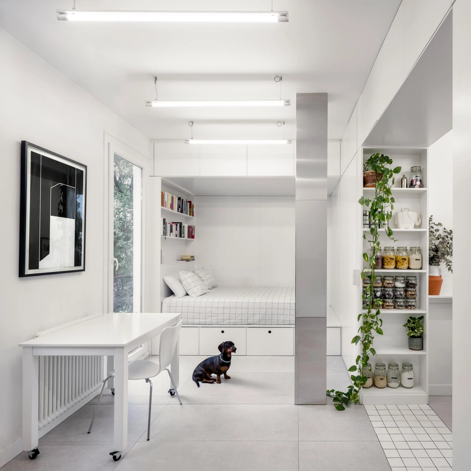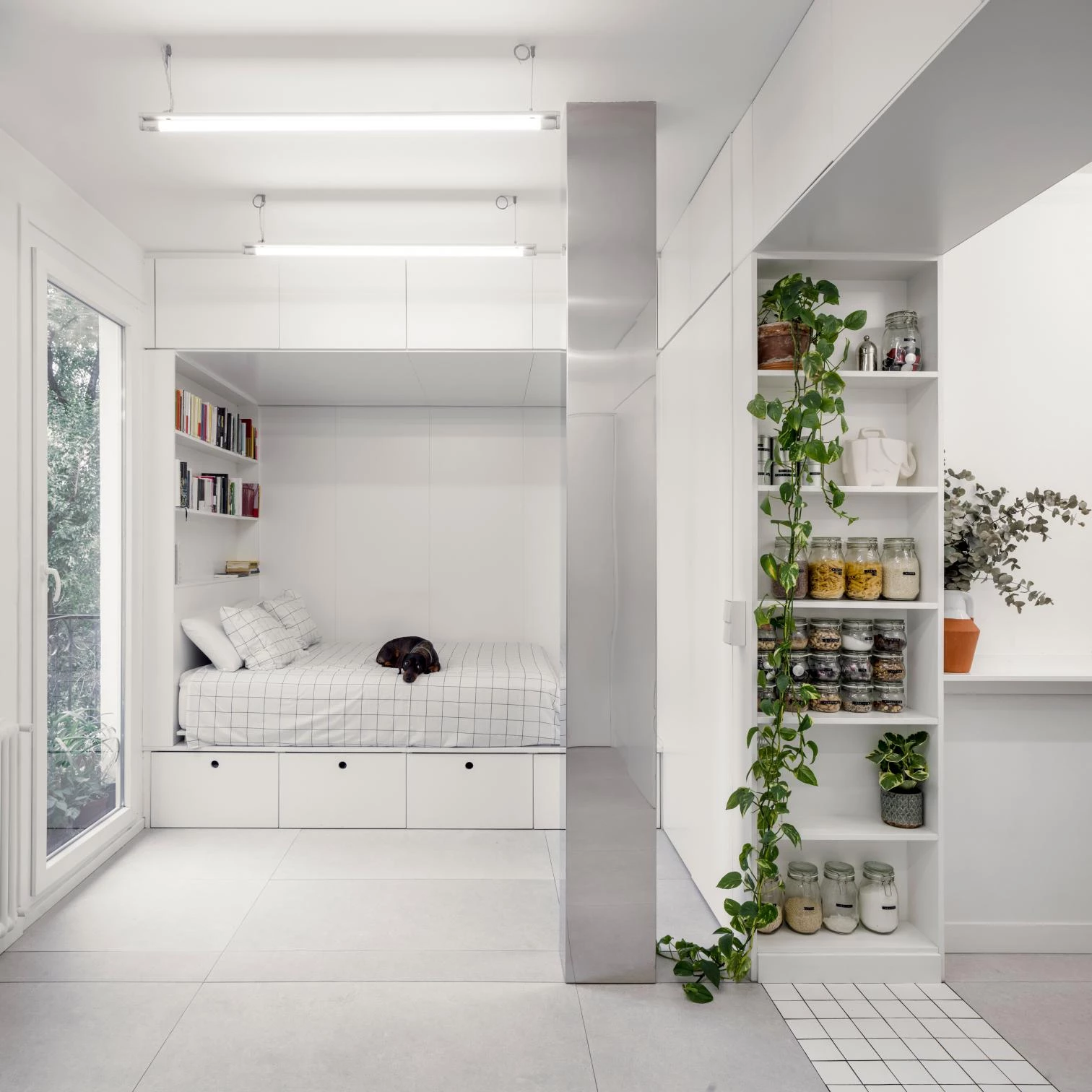 A small flat by the Manzanares River has been renovated to accommodate young members of a family that has occupied it since the building’s construction in the 1920s. It was partitioned into several rooms like a larger apartment, and the reduced dimensions called for a thorough revamp, freeing up space as much as possible and reconciling the tightness of before with the new life of a couple and their dog.
