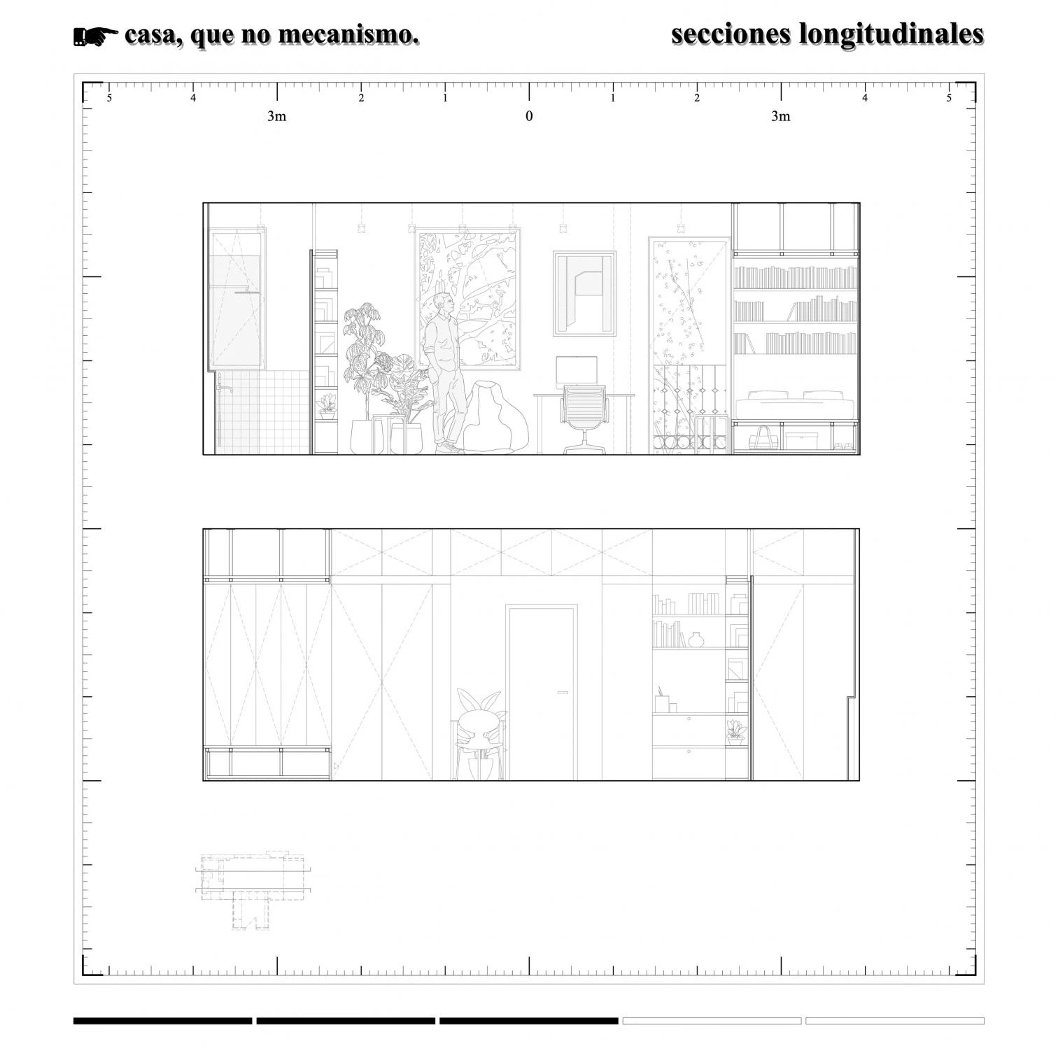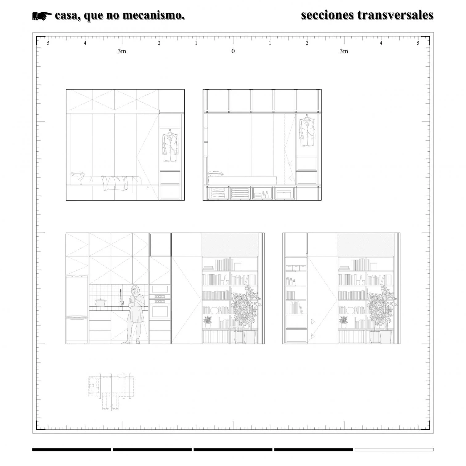 Although many schemes for minimal housing rely on a catalog of mobile designs – packageable or mechanized – this one chooses to pursue the comfort of a more static dwelling. Without active furniture, all functional and storage space is concentrated along the perimeters, forming a user-friendly suite of closets, countertops, and shelves. In a single room for the entire program, only the bathroom is set apart, relocated behind a door set between shelves.