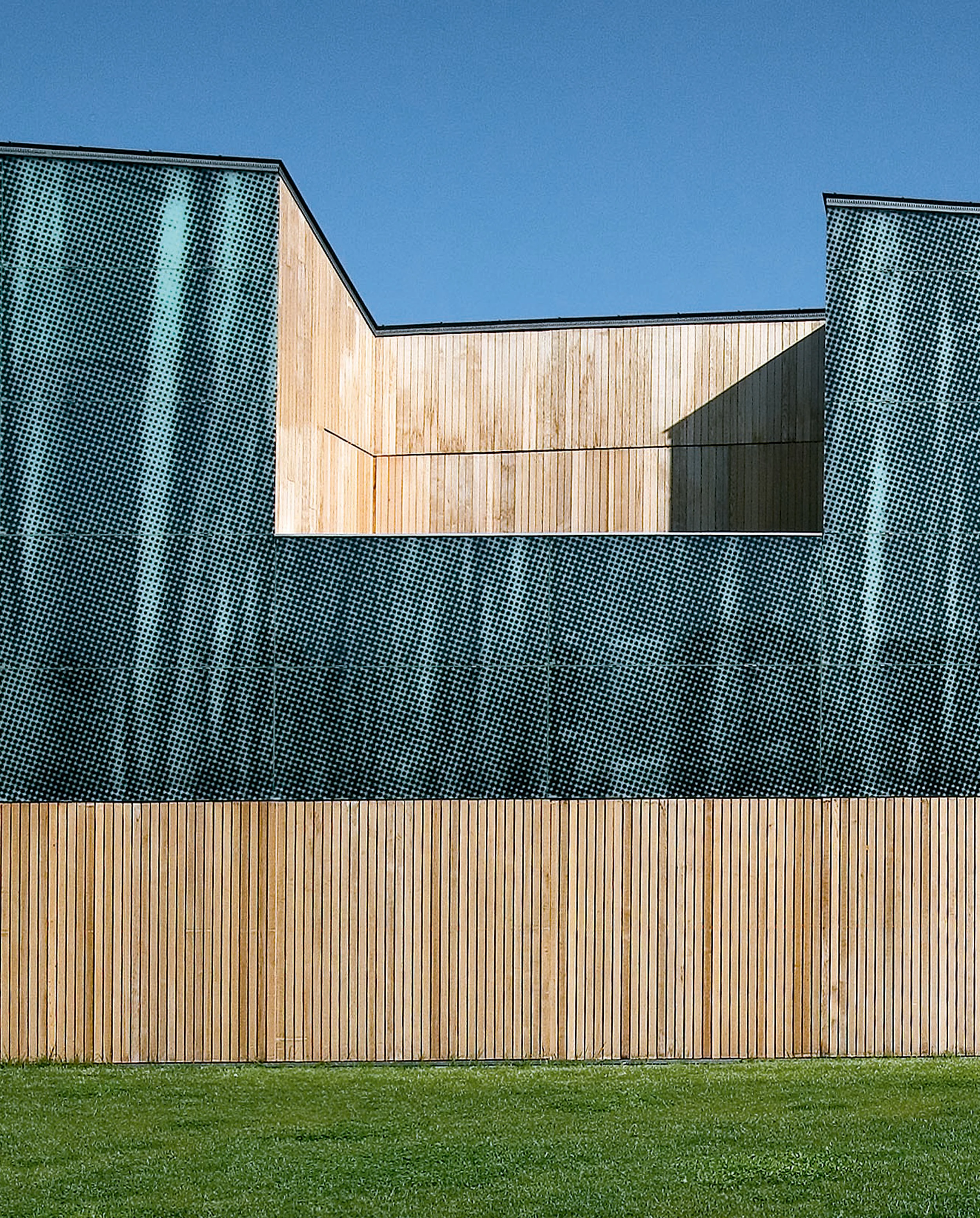 Un bosque de bambúes serigrafiado en una lámina de poliéster ha aportado la imagen que se despliega por las cuatro fachadas, pero sólo es entendido como tal desde puntos de vista alejados. Con el acercamiento, la imagen se deshace, aparece el punteado y cobran intensidad los reflejos. En los huecos, las contraventanas de madera alteran con su movimiento la imagen monolítica del volumen, facilitando la expansión del espacio interior.