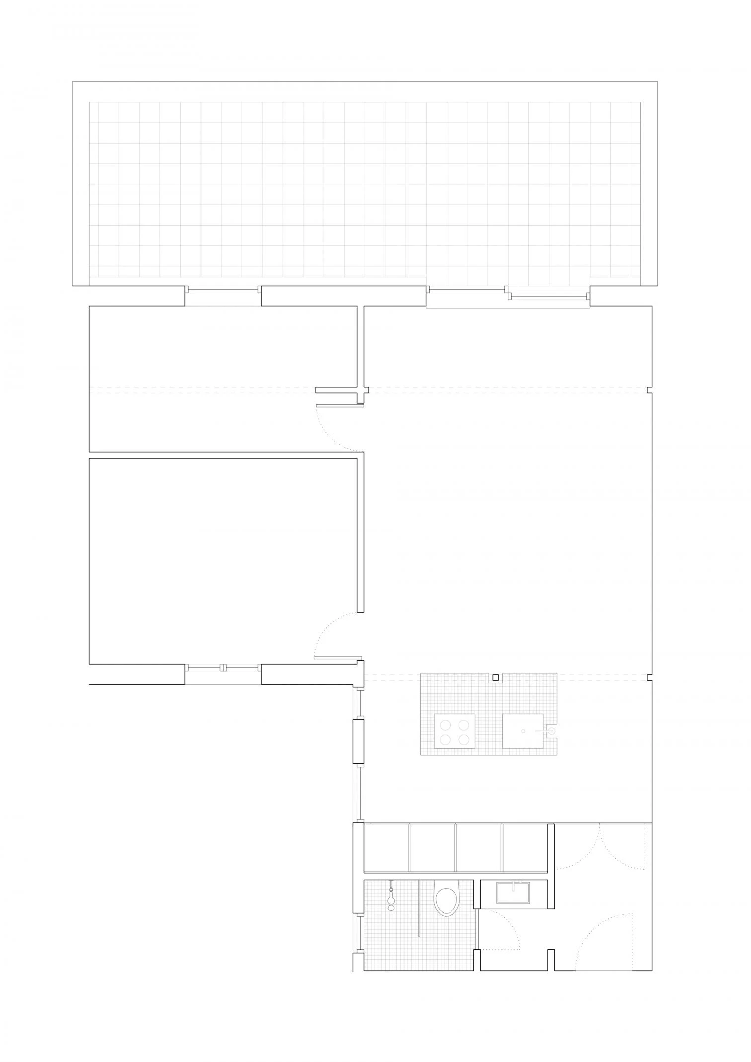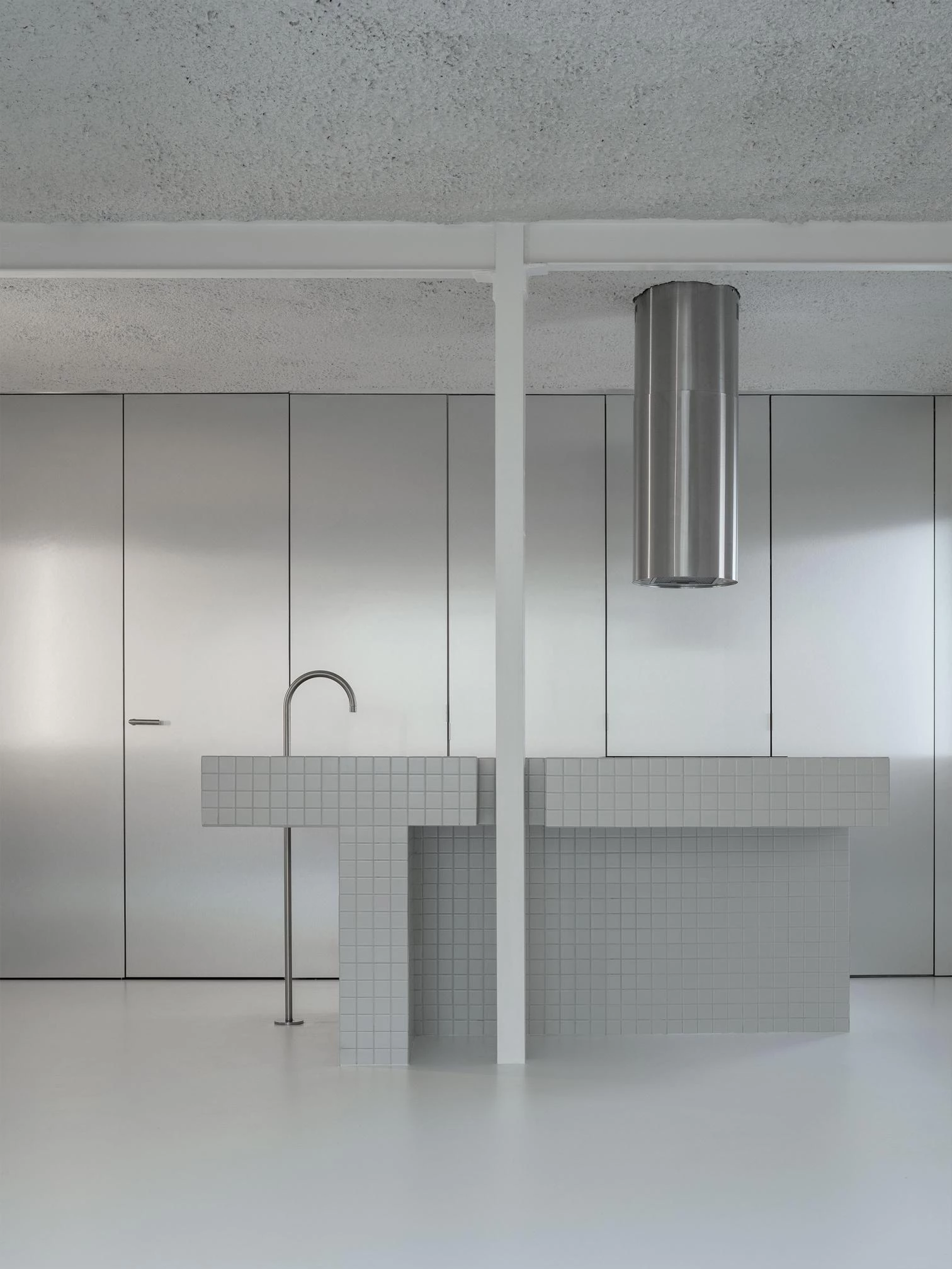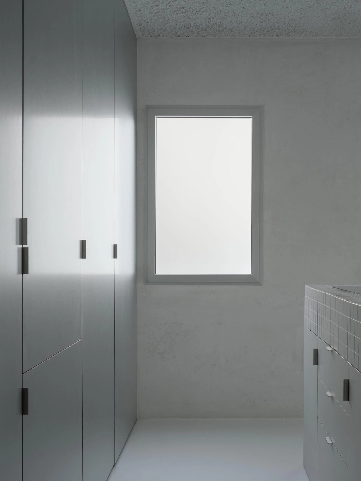 This project in Madrid’s Carabanchel district creates an 85-square-meter unfinished space that the inhabitants can renovate on a limited budget, saving on construction costs. The bareness allows future interventions where expensive finishes are unnecessary. While maintaining the apartment’s original layout, up goes a wall clad in aluminum and equipped with technical systems, containing plumbing and electrical services besides storage space for the kitchen and bathroom. Structurally the flat presents a grid of beams and pillars. The continuous floor of reflecting epoxy resin strikes a contrast with the cavernous look of the plaster ceiling. The kitchen and the bathroom are clad in ceramic tiles. Red marble details stand out amid grayish tones.