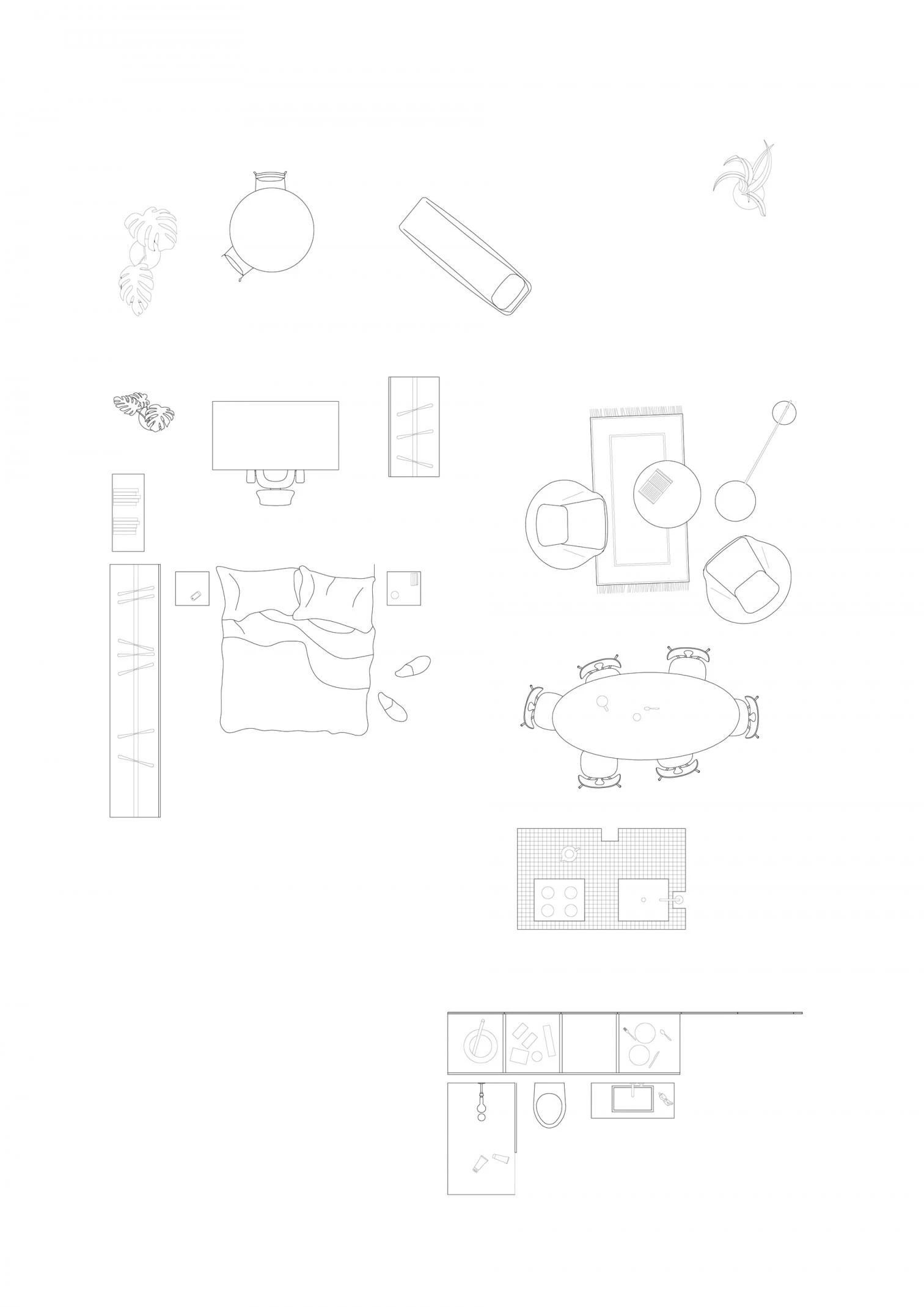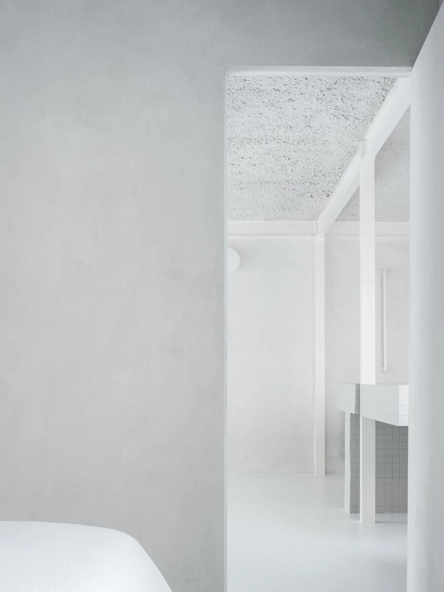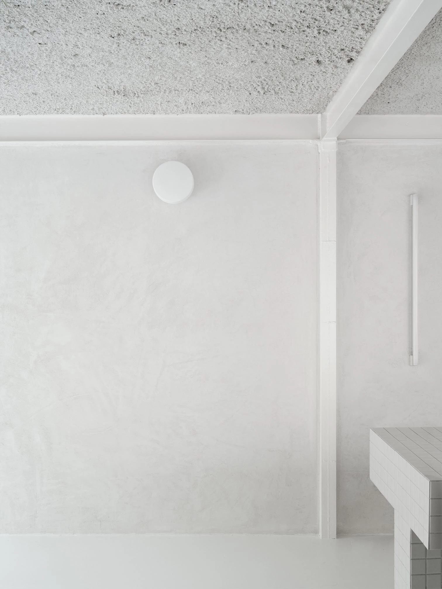 This project in Madrid’s Carabanchel district creates an 85-square-meter unfinished space that the inhabitants can renovate on a limited budget, saving on construction costs. The bareness allows future interventions where expensive finishes are unnecessary. While maintaining the apartment’s original layout, up goes a wall clad in aluminum and equipped with technical systems, containing plumbing and electrical services besides storage space for the kitchen and bathroom. Structurally the flat presents a grid of beams and pillars. The continuous floor of reflecting epoxy resin strikes a contrast with the cavernous look of the plaster ceiling. The kitchen and the bathroom are clad in ceramic tiles. Red marble details stand out amid grayish tones.