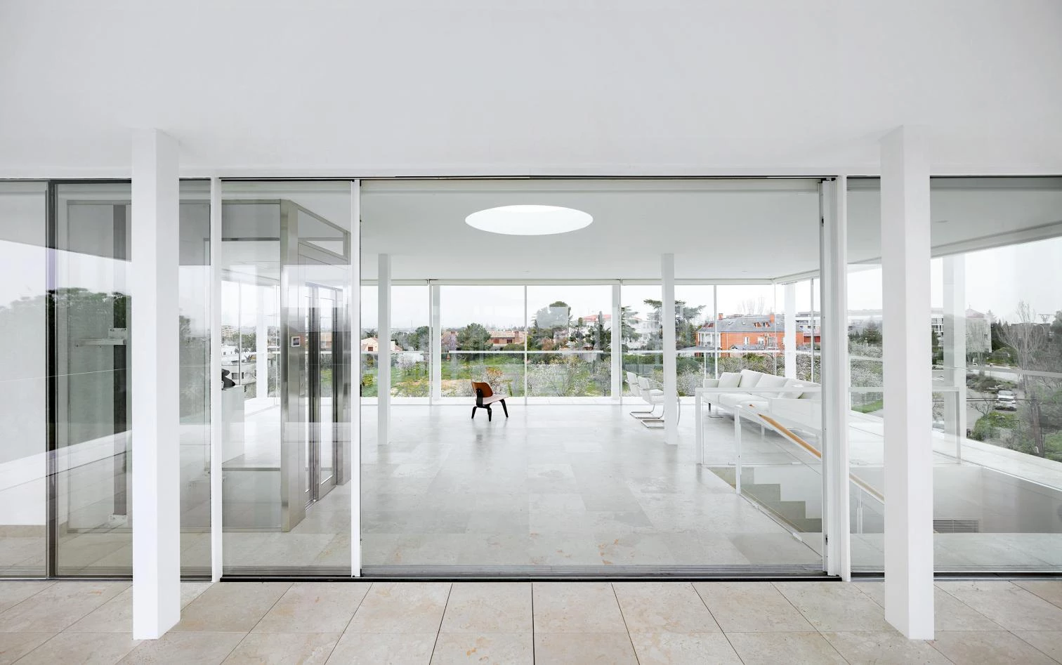 On the south-facing ground floor, a spacious living room is protected by a light veranda. The floor plan stretches on to a pool at the edge. The main entrance is on the north facade. It is flanked by a large kitchen and the dining room. At the center of this level, a 4x4m square is the main foyer, through which the staircase and the elevator are accessed. Upstairs are the bedrooms at all four corners.