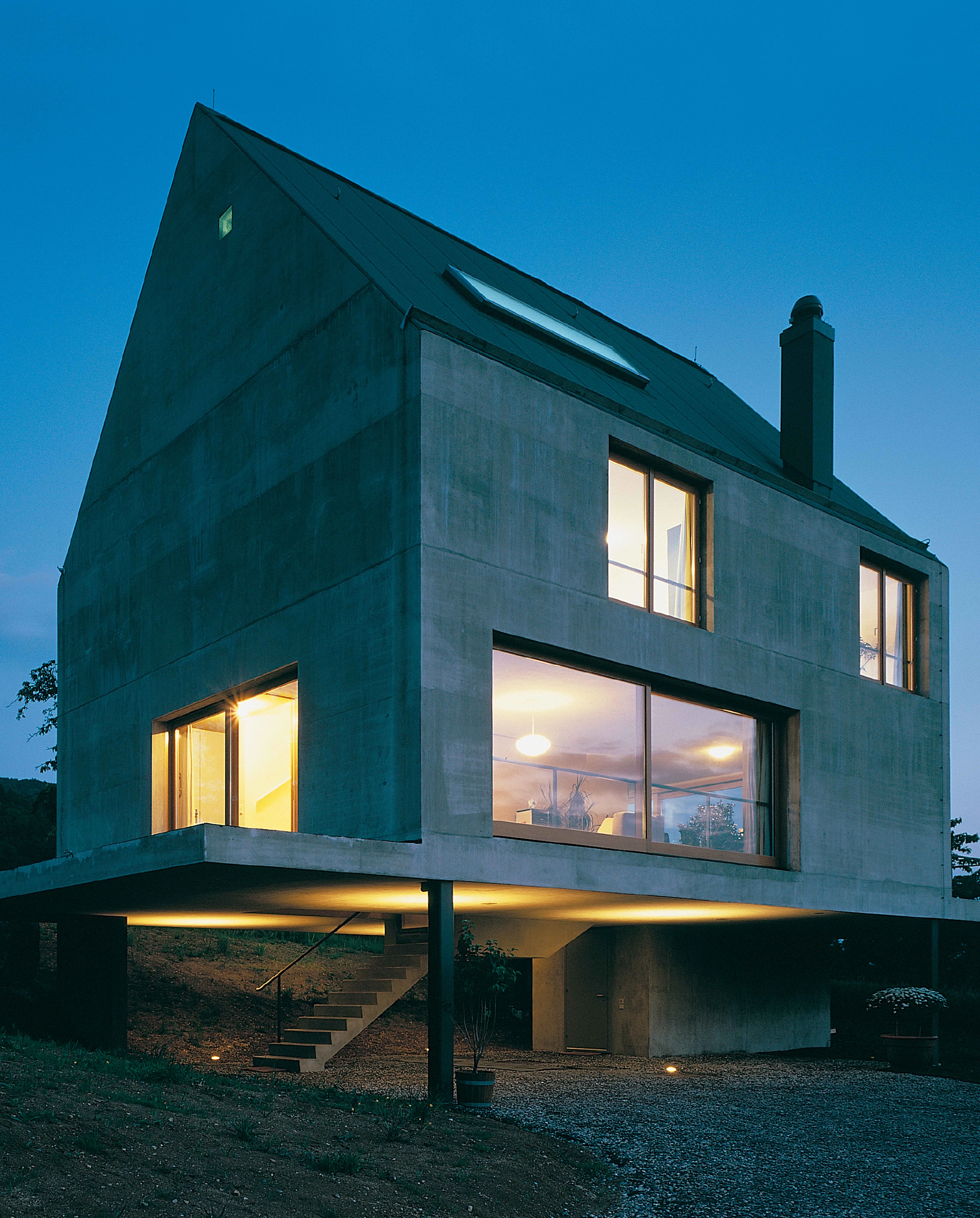 Immersed in the natural water cycle, the compact, abstract image of the house is supported in a material definition that makes the roof chromatically akin to the walls. A clean edge neatly resolves the interface between the concrete walls and the bituminous film that resolves the sloping surfaces. Reduced to its minimum expression, the guttering is replaced by a metal drip strip that guides the rainwater to the edges of the west facade, at the foot of which is the pond. As with the Ricola warehouse building in Mulhouse, the vertical face will gradually acquire a green patina of plant matter and mineral deposits that will blur the edges, making the appearance of the house change as time goes by.[+][+][+]