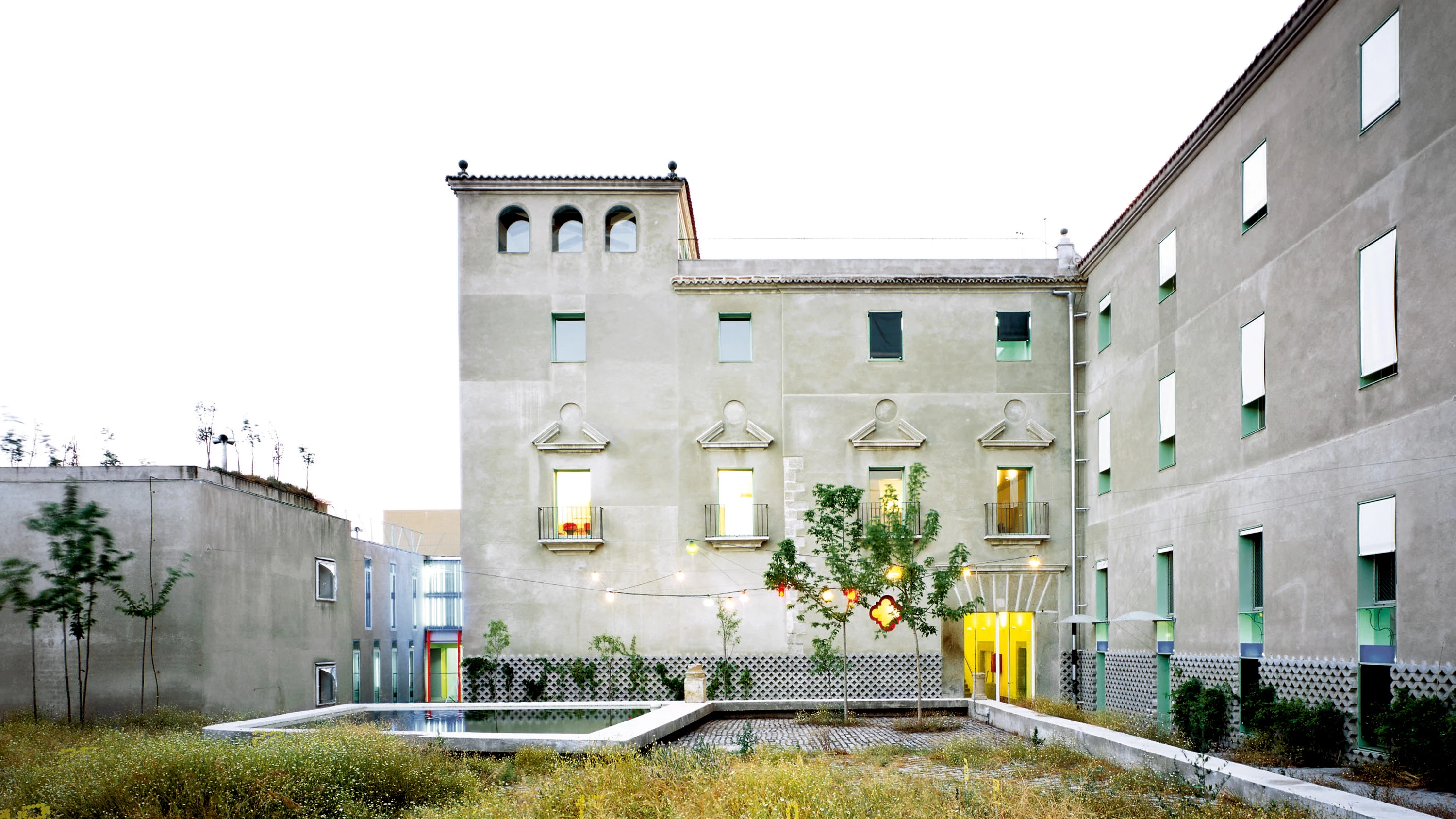 La diócesis de la villa cacereña de Plasencia convocó en el año 2000 un concurso para la remodelación del antiguo Seminario Menor Diocesano —un caserón del siglo XV al cual se habían añadido algunas dependencias en el XIX y que se encontraba en estado casi ruinoso— como casa sacerdotal, lugar de acogida de religiosos jubilados o enfermos y sus acompañantes, donde se concentran los servicios asistenciales. En principio, el proyecto debía facilitar la adaptación de los sacerdotes a una nueva situación: pasar de un entorno rural a uno urbano, de una existencia marcada por la representatividad individual como referente y árbitro social a una vida comunitaria con un reparto de roles menos jerarquizado. Más que con una obra de remodelación al uso, la transformación del caserón se produce mediante pequeñas intervenciones ingeniosas y festivas, que por un lado traen recuerdos sensoriales del campo y por otro invitan a la participación y el uso compartido. Así, en el exterior se encuentran los ‘huertos asignados’ para el cultivo recreativo, las ‘nubes marquesina’ en los huecos que dan al patio, el pavimento de celosía de hormigón que se pliega conformando el talud y el zócalo, o la ‘red de tulipas’ que iluminan la zona de entrada con aire provisional. En el interior, la capilla —a la que se accede lateralmente desde un corredor verde fluorescente— es un espacio transformable que requiere de la intervención de los usuarios para cobrar vida. Así, la sacristía no es una habitación cerrada y opaca, sino una serie de vitrinas- armario de policarbonato accesibles desde el lugar de celebración, el presbiterio es una igualitaria alfombra de césped que se utilizará por turnos, y los ‘bicibancos’ migratorios son asientos fácilmente trasladables por los feligreses. También se han dispuesto otros elementos sobre los que es posible la decisión personal: frente de pajareras para el cuidado de mascotas, cajas de luz para anuncios internos, y un patio pintado con pintura de pizarra como soporte de mensajes escritos con tiza... [+]