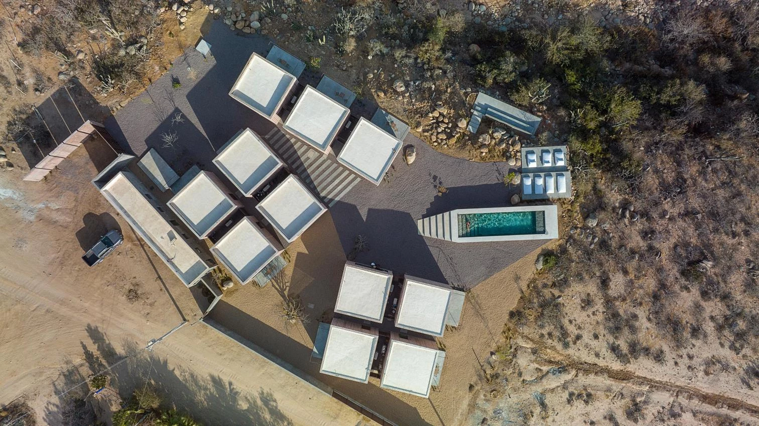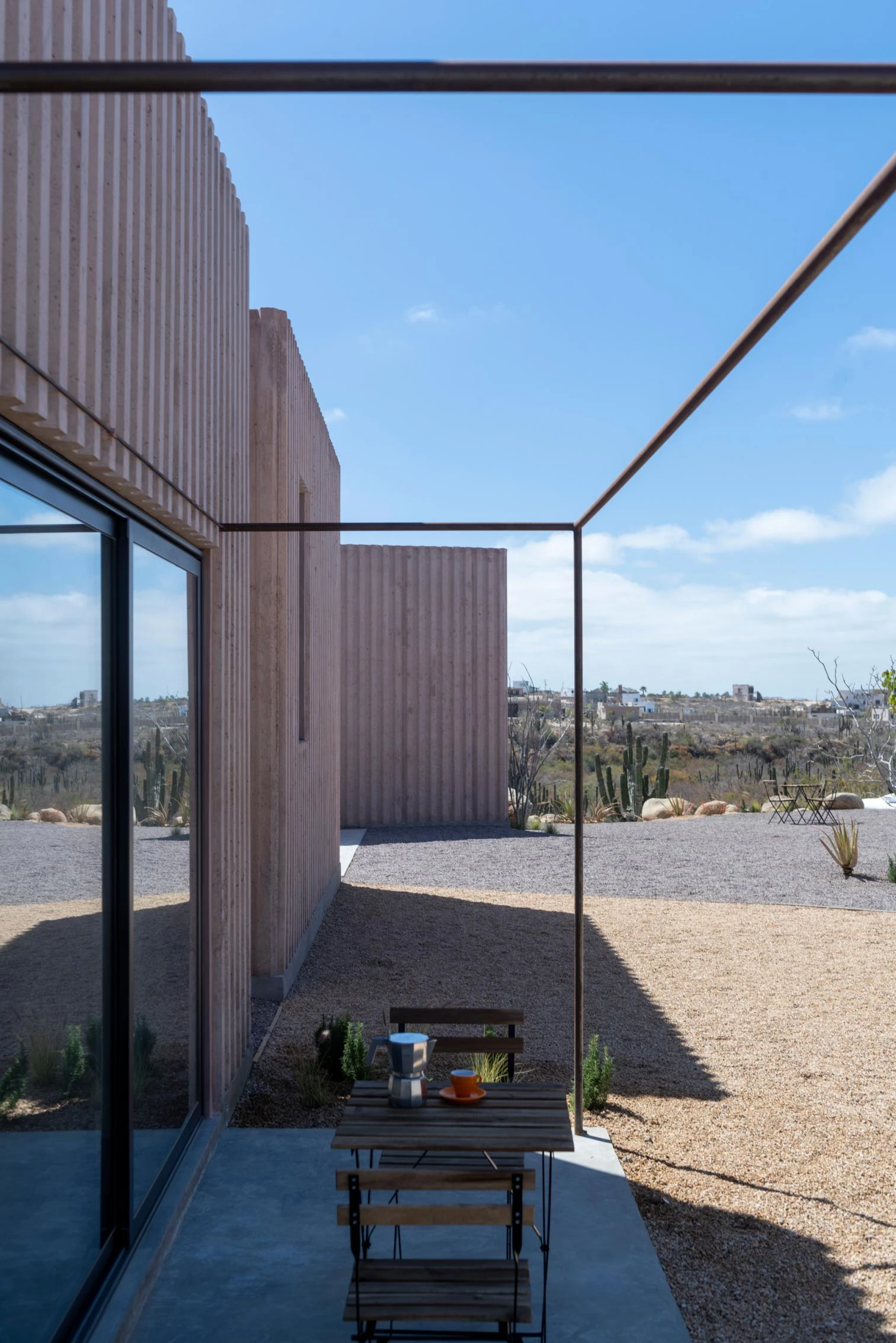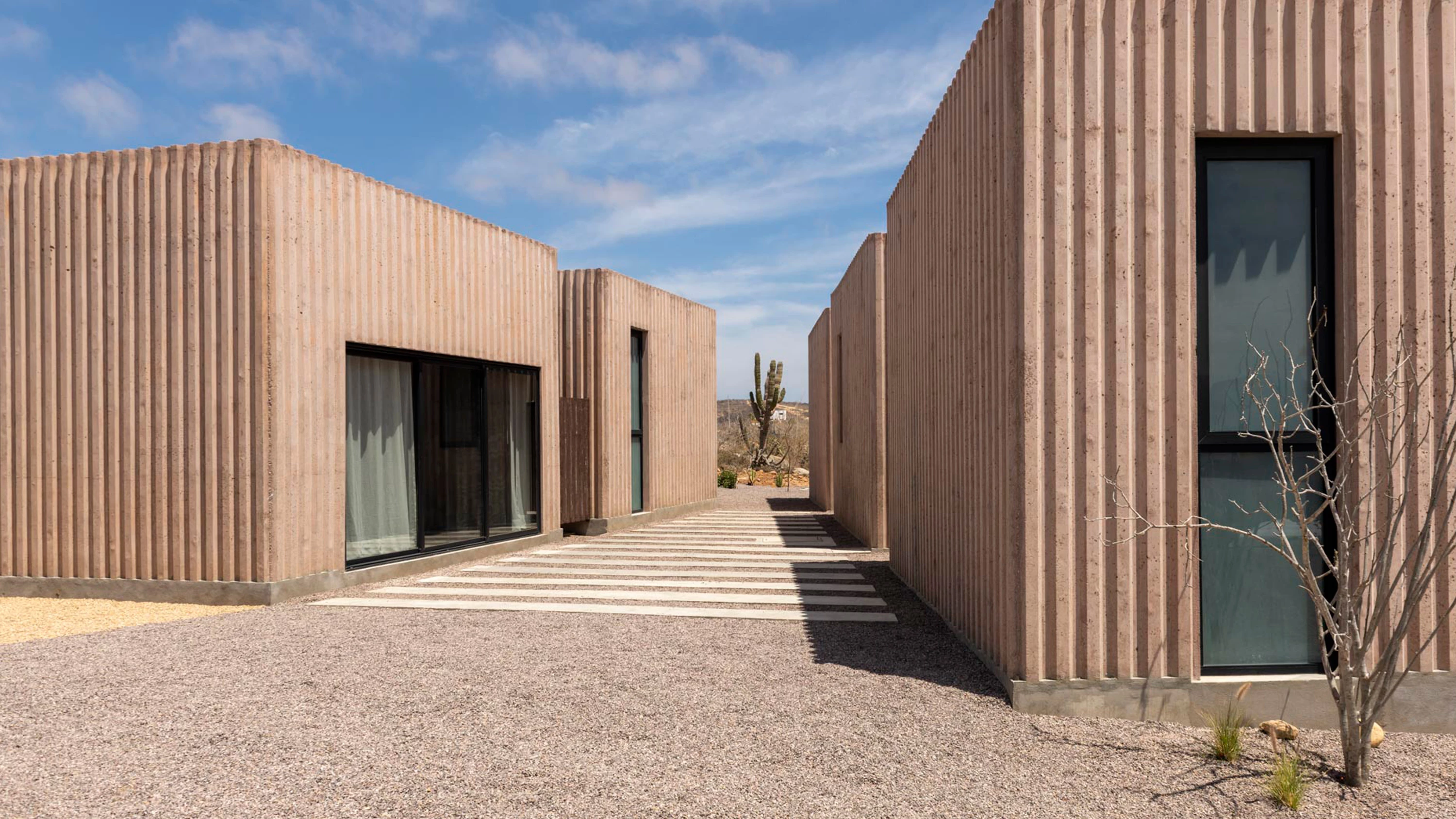 In Todos Santos, in the Mexican state of Baja California Sur, three houses are distributed in 11 standard modules, each measuring 25 square meters. Functioning as a compound, the residential program is fragmented into one-level cubes of identical dimensions, containing a kitchen, a dining room, a living room, and bedrooms with baths. The modular constructions are scattered around, held together along an axis with three patios.