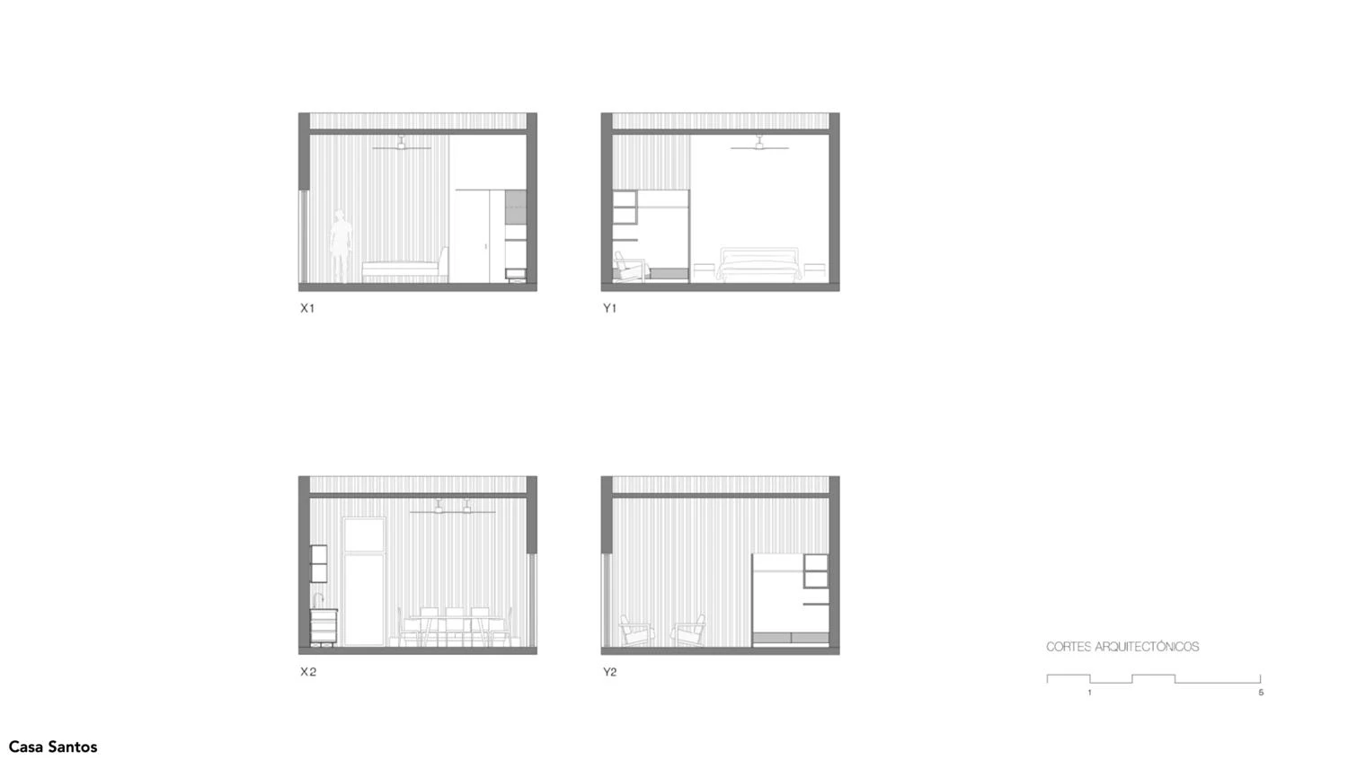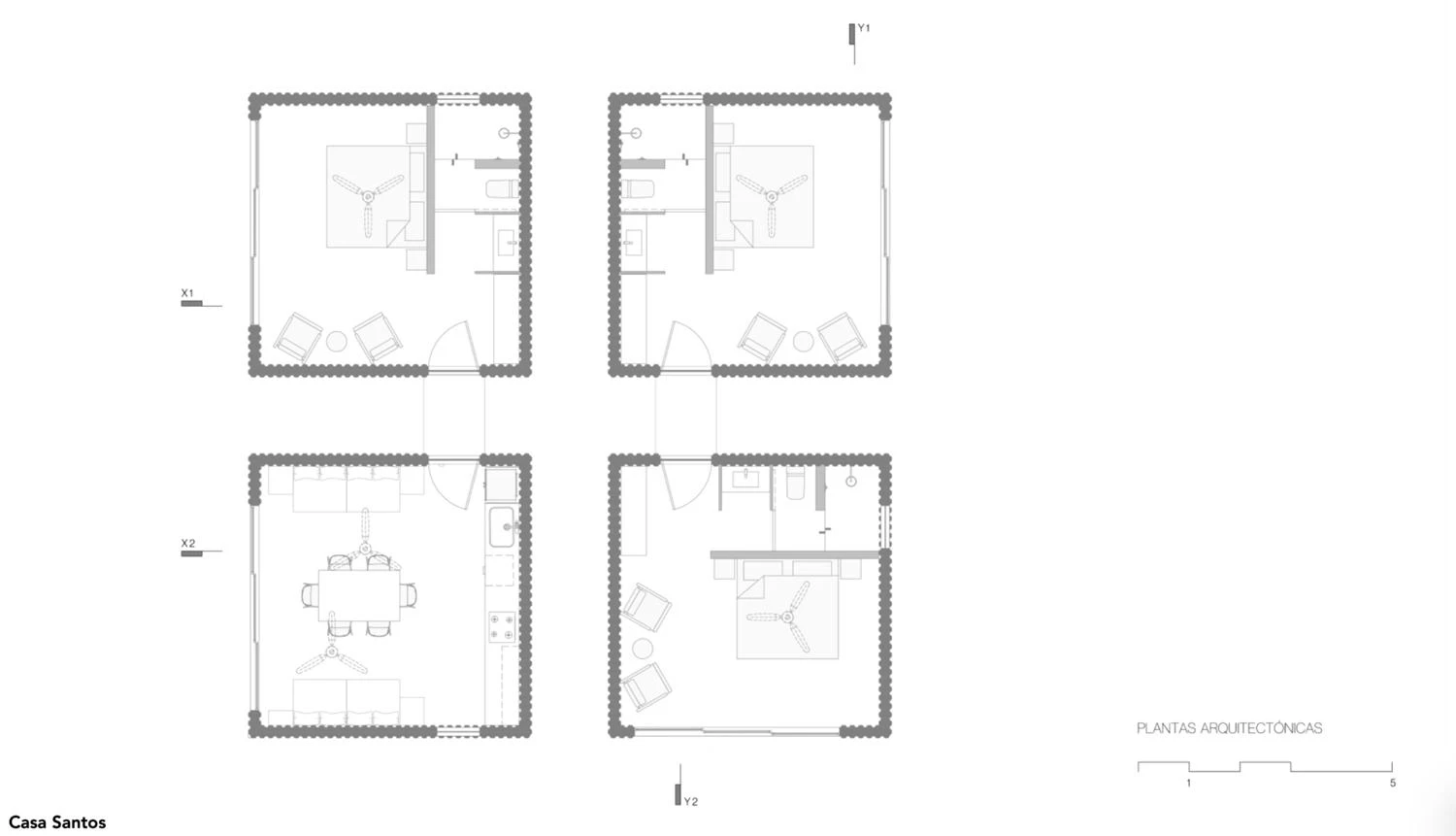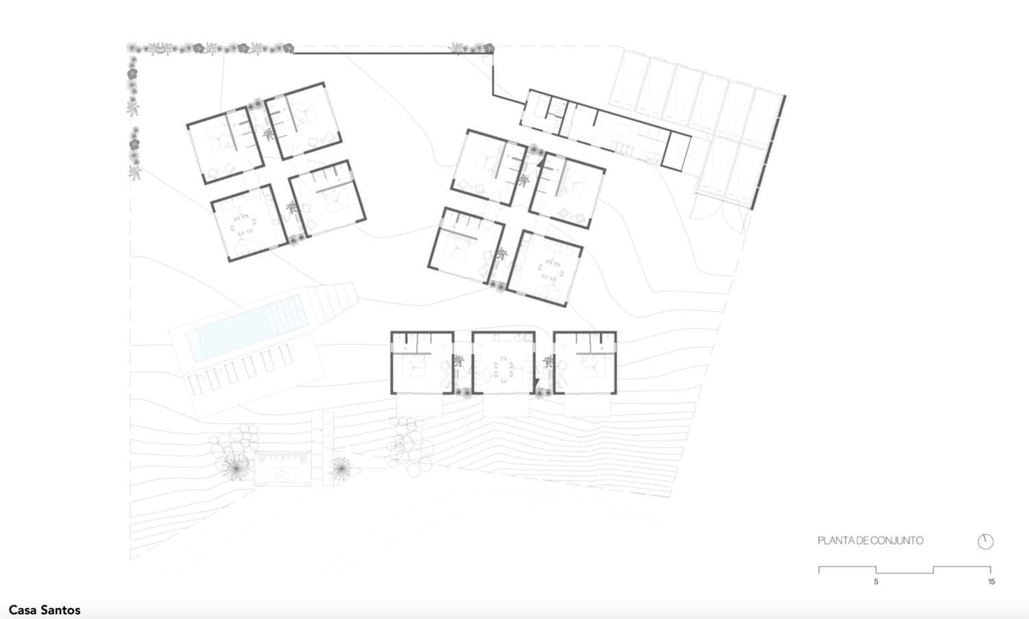 In Todos Santos, in the Mexican state of Baja California Sur, three houses are distributed in 11 standard modules, each measuring 25 square meters. Functioning as a compound, the residential program is fragmented into one-level cubes of identical dimensions, containing a kitchen, a dining room, a living room, and bedrooms with baths. The modular constructions are scattered around, held together along an axis with three patios.