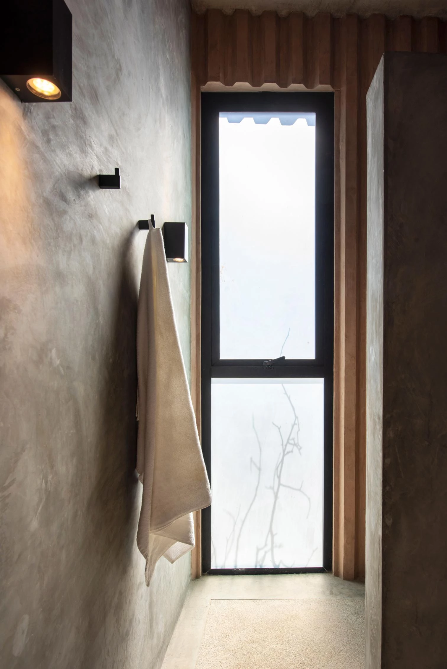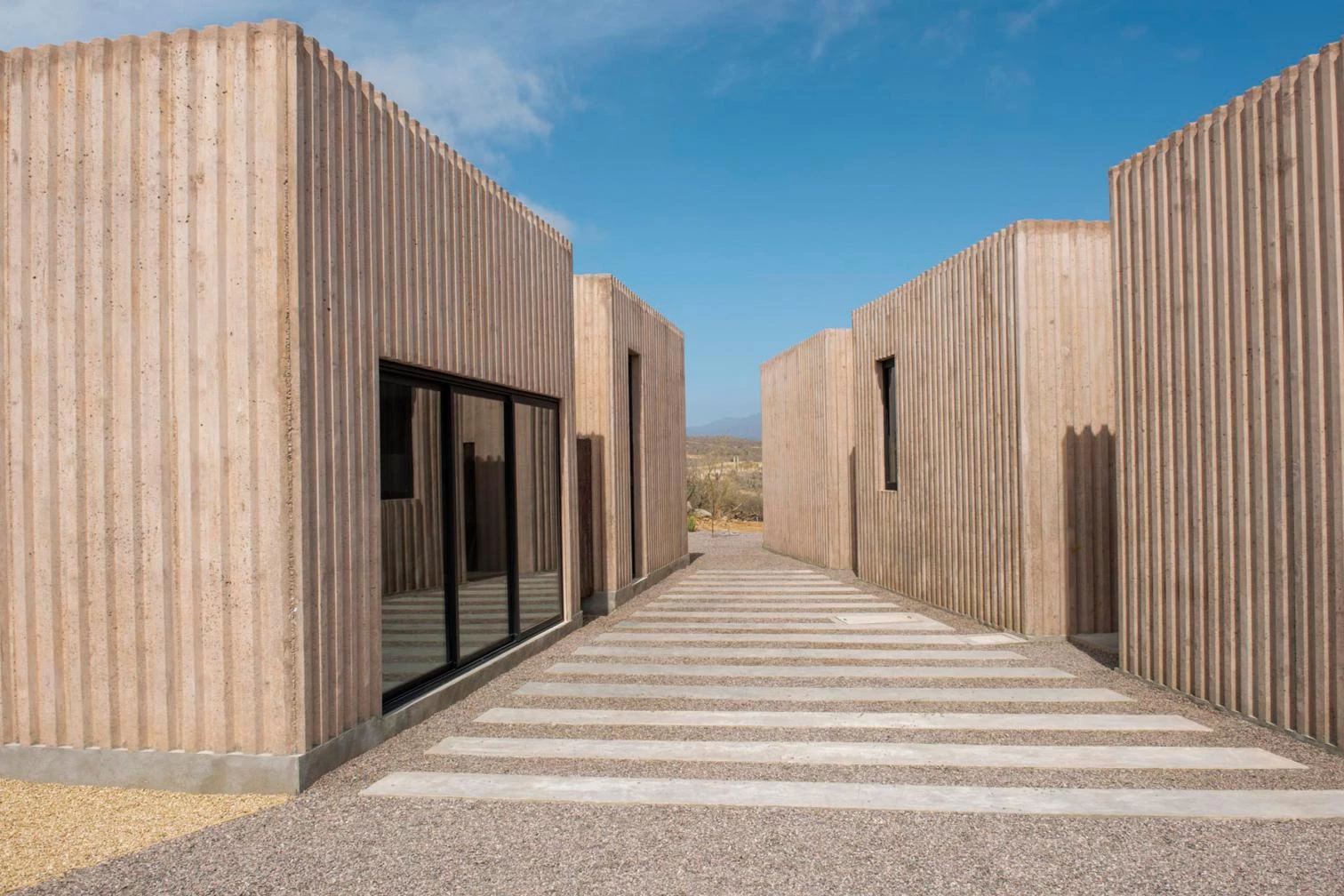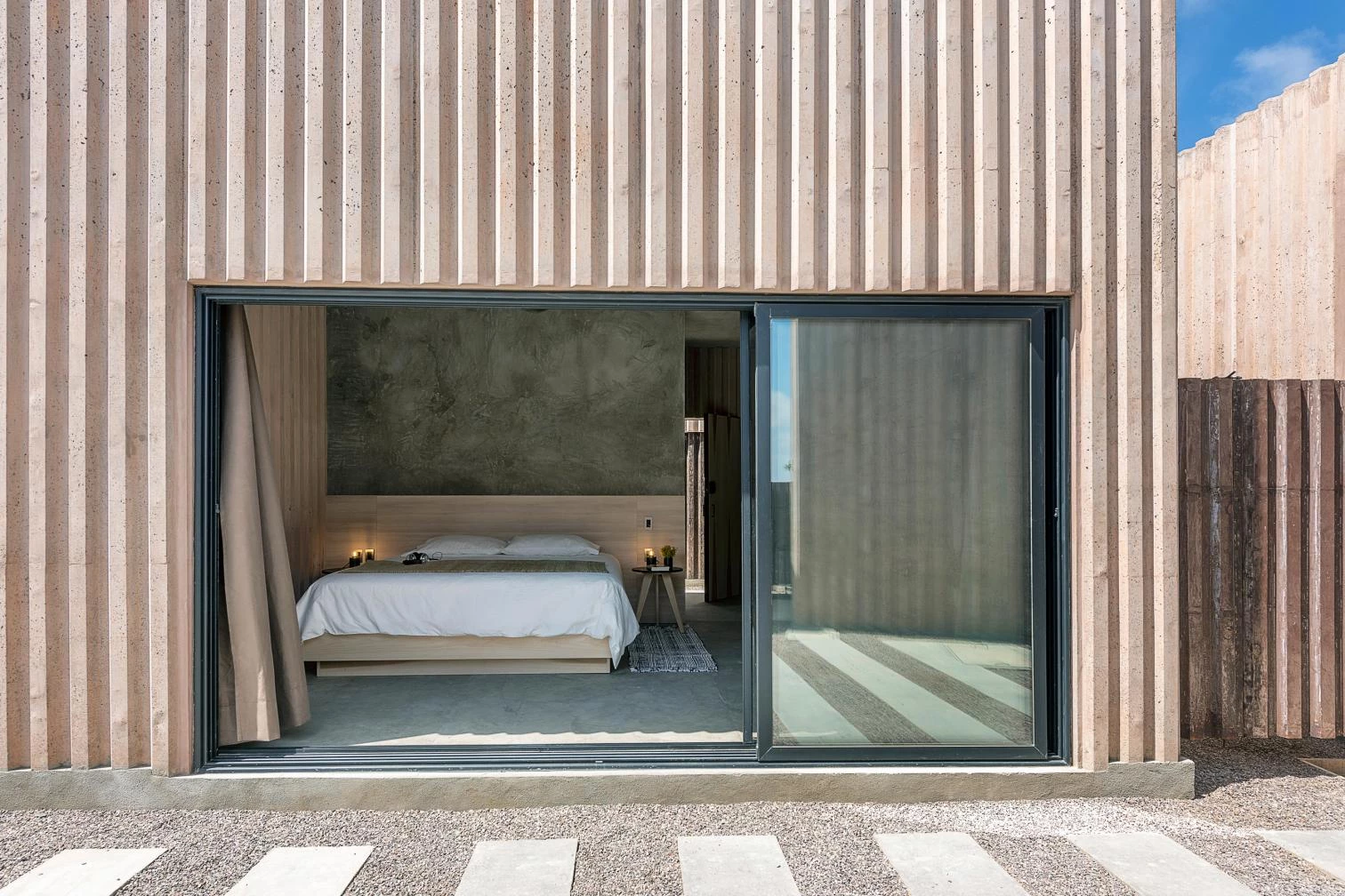 The unifying element is dyed concrete, the grooved surfaces of which work as both structure and finish. The rhythmic striations form shadows, giving thermal protection by reducing daytime heat. The walls indoors have the same texture.