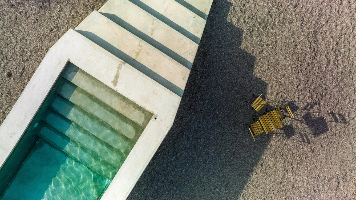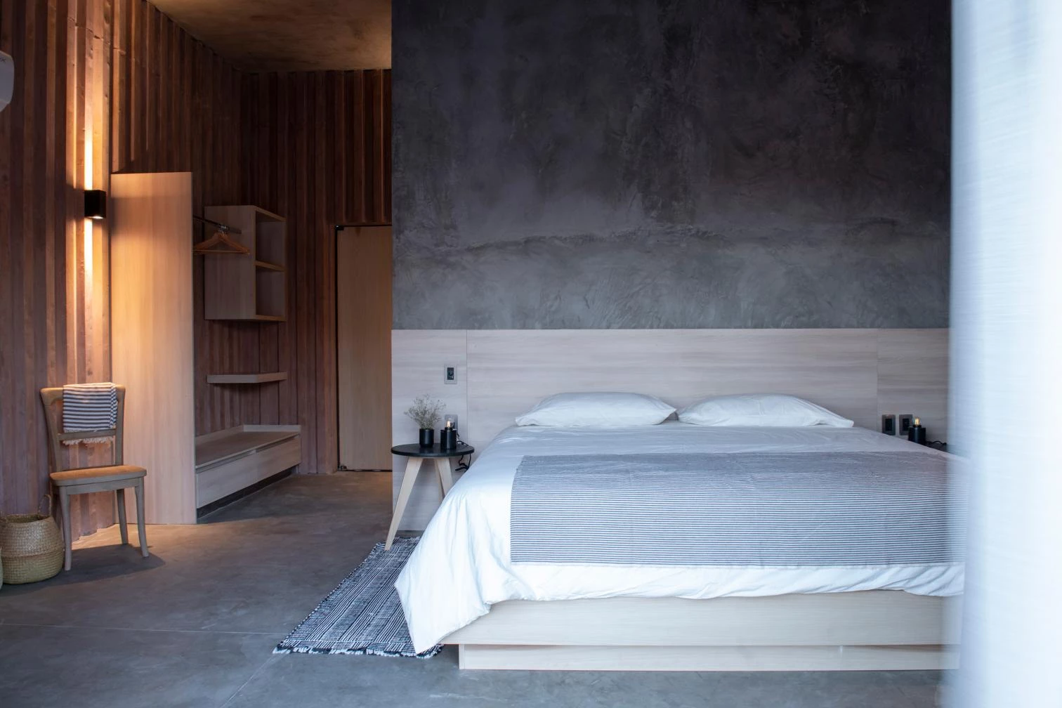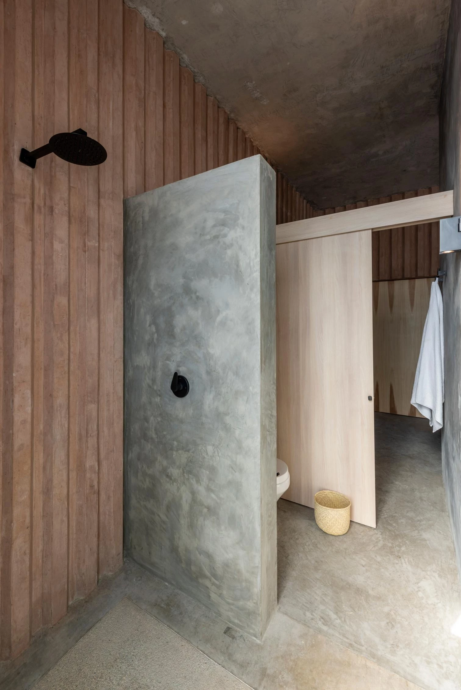 The unifying element is dyed concrete, the grooved surfaces of which work as both structure and finish. The rhythmic striations form shadows, giving thermal protection by reducing daytime heat. The walls indoors have the same texture.