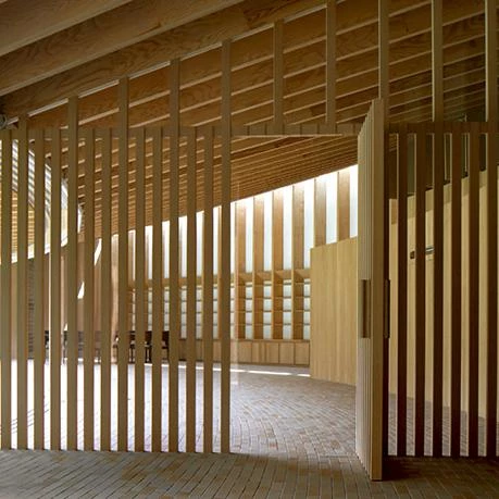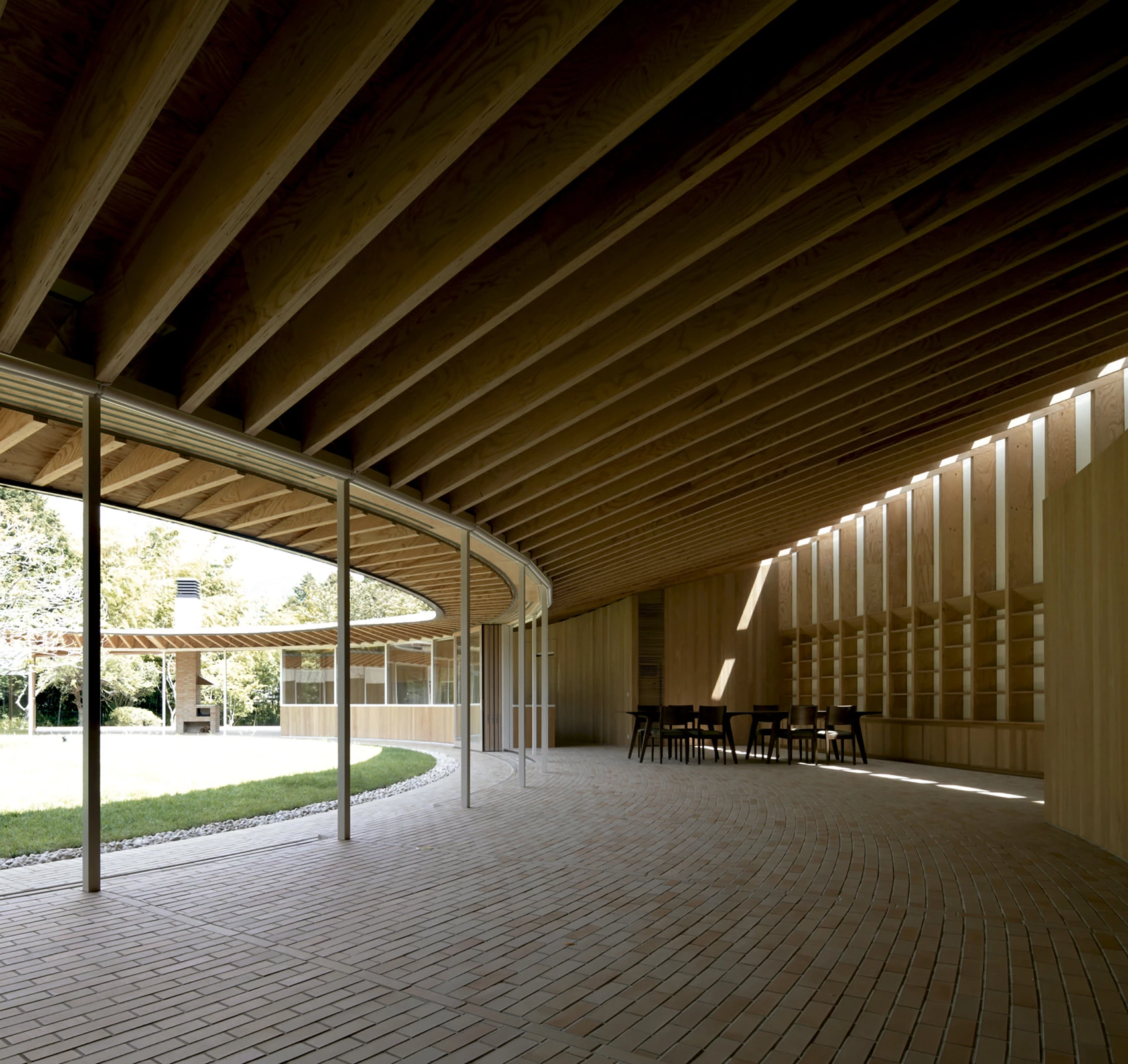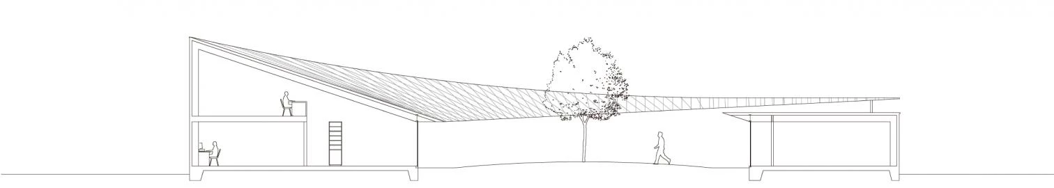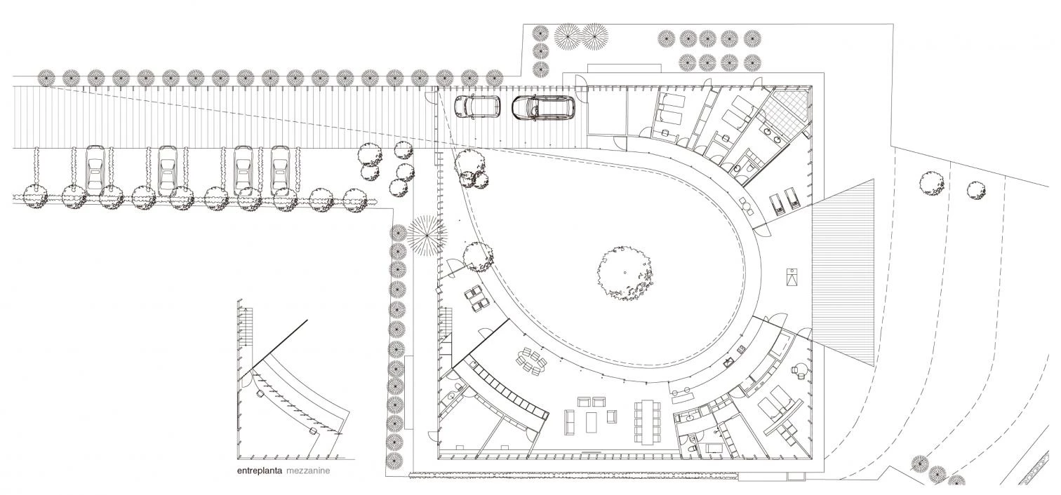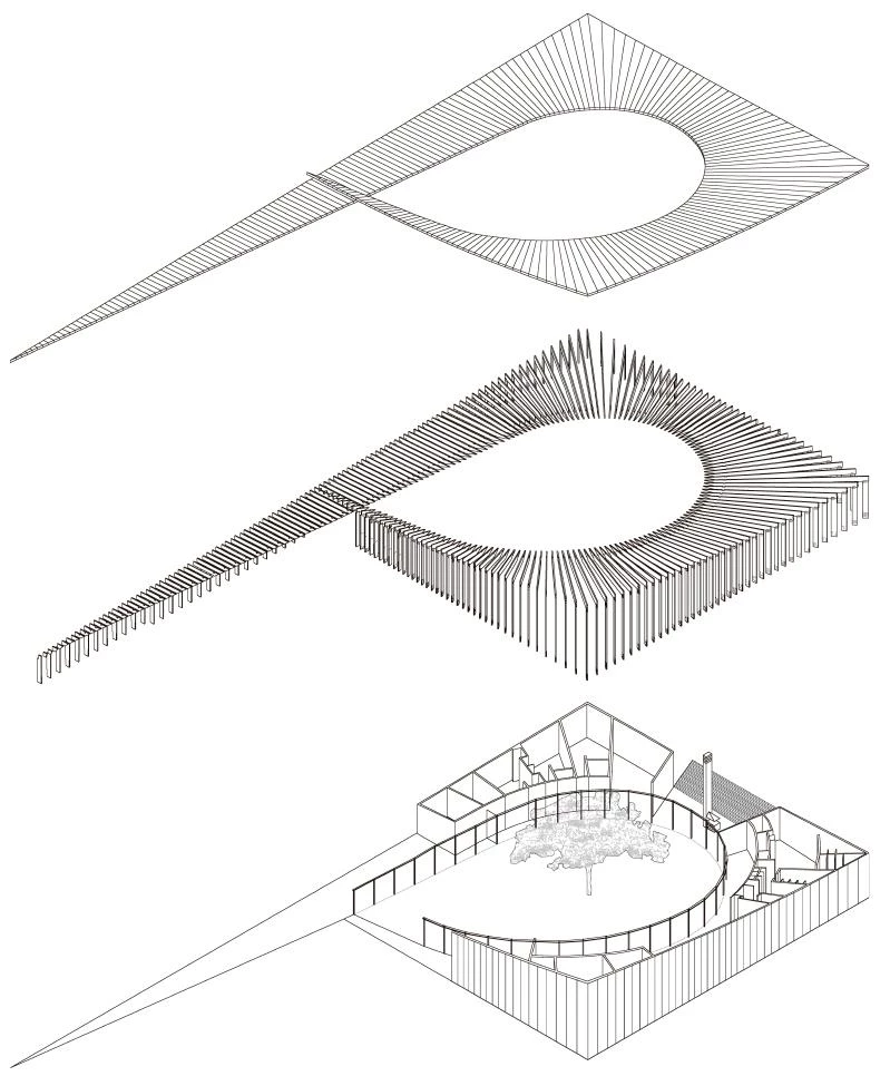 The geometric transition from the square perimeter to the curved interior is possible thanks to a radial distribution of the structure. To ensure a seamless connection between the house and the courtyard, the structure is formed by a series of wood ribs that rest on the outer limit and cantilever towards the central area, so that the number of columns is minimized in the interior facade. The sloping form of the roof makes the height of the building vary from 2.4 meters at the lower point to 7.5 meters in the main living room with a mezzanine. The partitions, stairs, and some furnitures pieces are built with wood slats, continuing the structure that is left exposed.