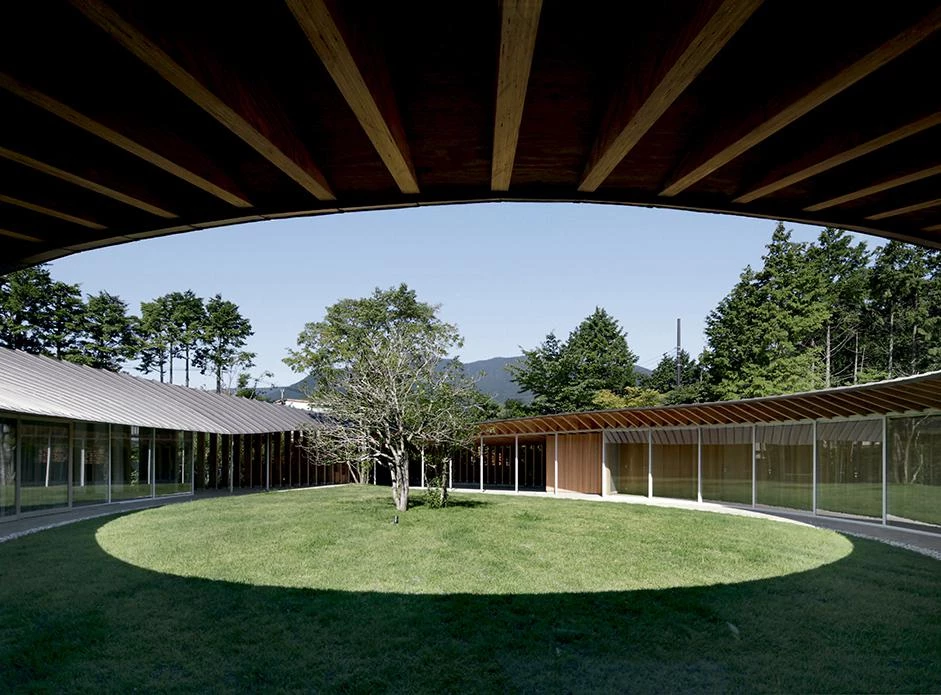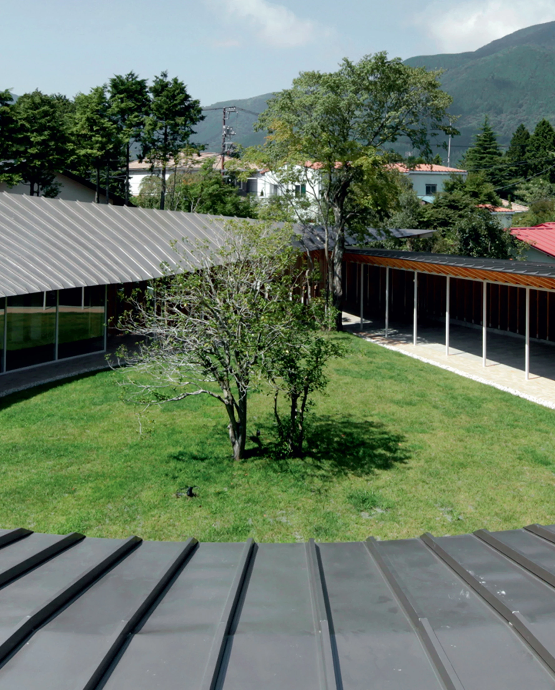 Introspectively laid out around a central courtyard, Sengokubara House is built on a site surrounded by vegetation in Hakone, a city located some one hundred kilometers southwest of Tokyo. The continuous roof, which covers the whole house with a single gesture, starts out at the access like a canopy and gradually extends to close the teardrop-shaped central courtyard. The same roof system – built with standing seam metallic sheet – folds to configure the exterior facade.