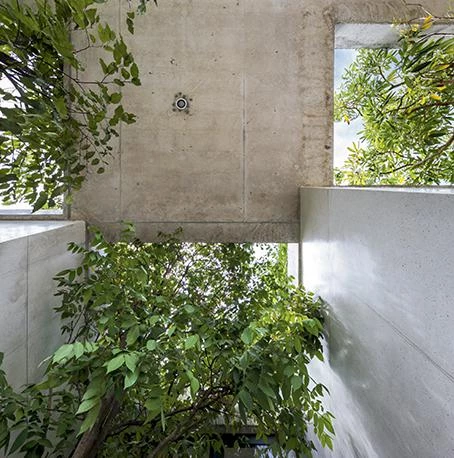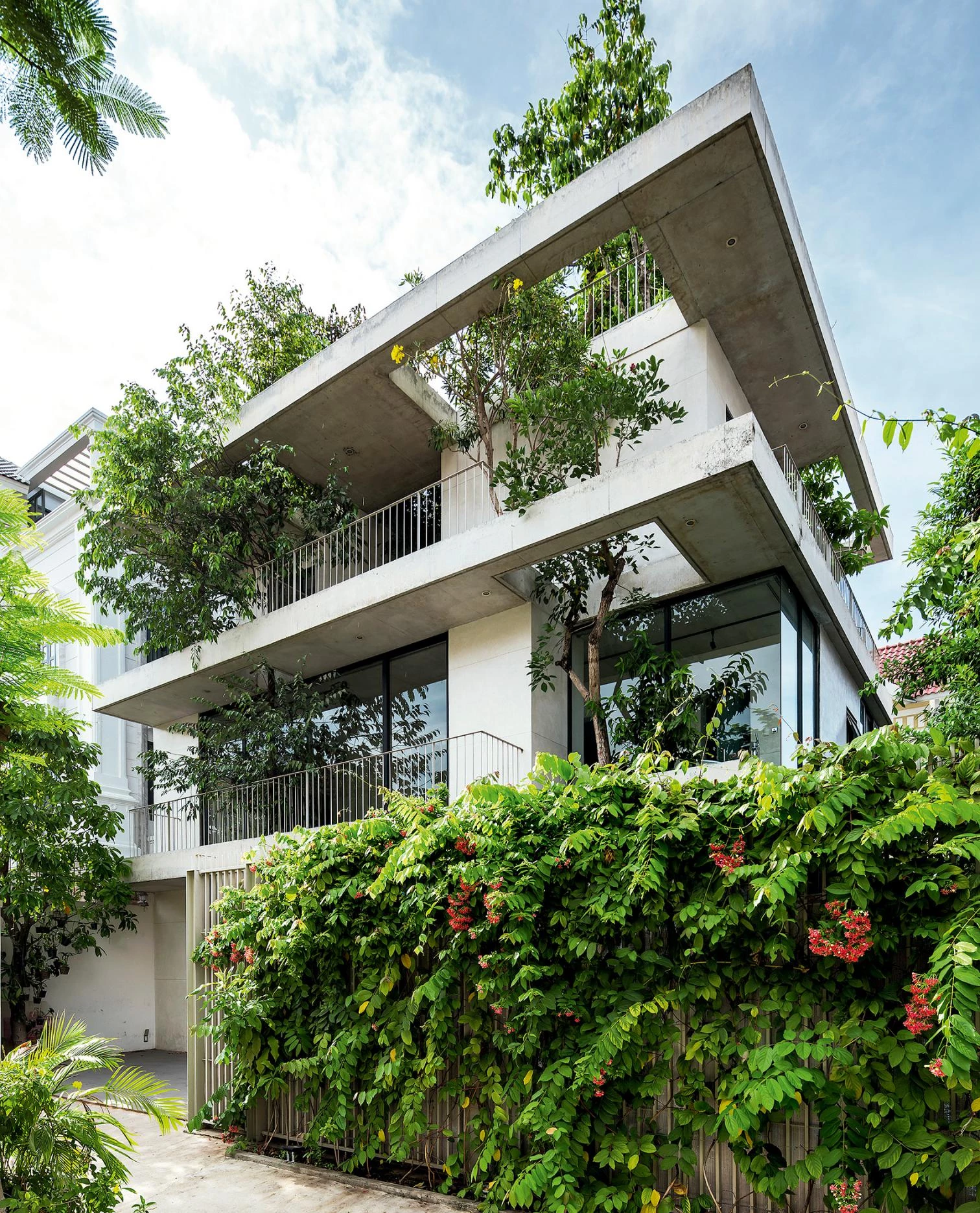 Designed to accomodate three generations of one same family ( a very common arrangement in Vietnamese society), the house consists of stakced concrete platforms perforated with rectangular openings through wich local species of trees rise. In each one of the three levels a series of boxes contain bedrooms, restrooms, storage, and kitchens while the intermediate spaces configure the public and living areas, interwoven with terraces and vegetation. Indoors, the wall surfaces are coveredwith terrazzo, a material used traditionally in Vietnam during the 1980s, and that creates a contrast with the use of concrete, polished on the floors and with a rough texture on the ceilings.