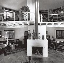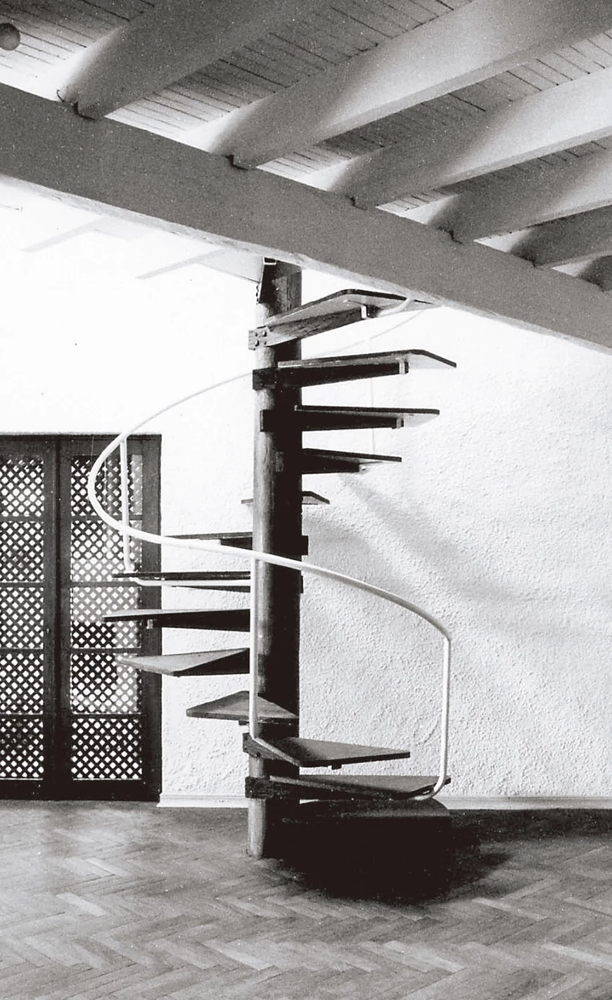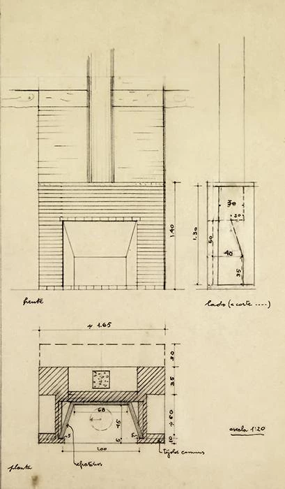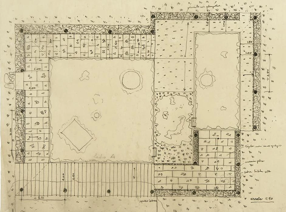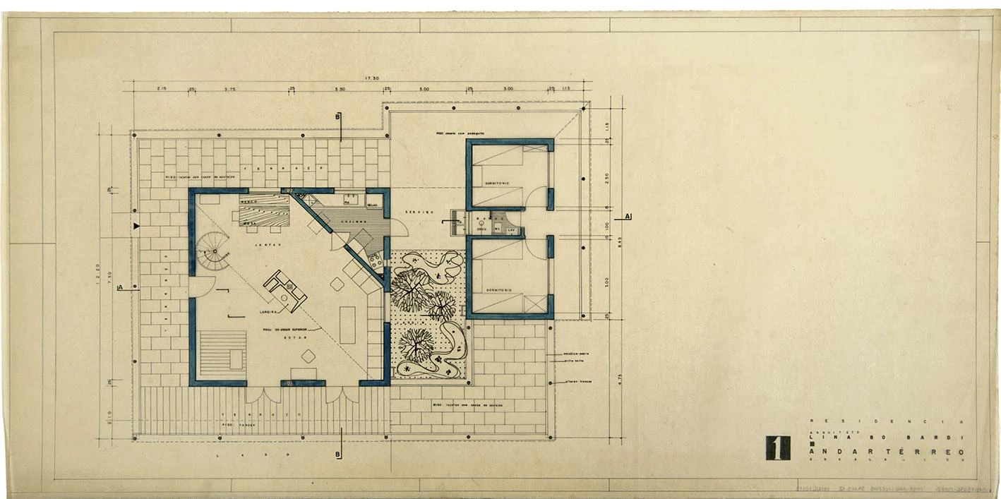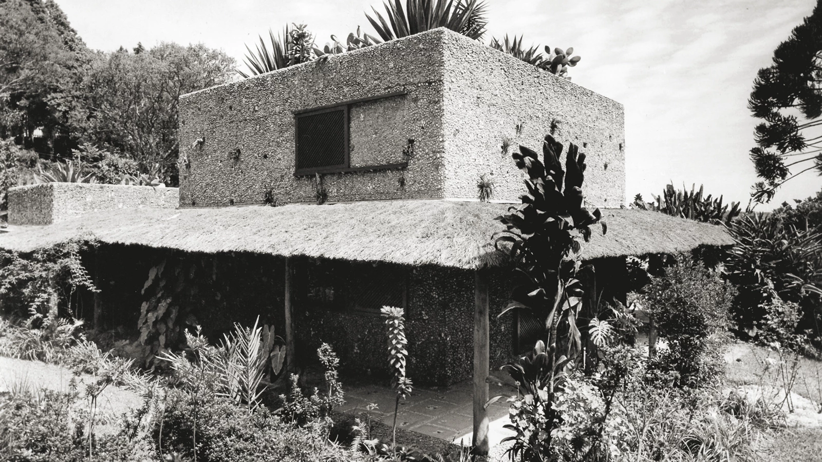 Lina Bo BardiLocated in the residential neighbourhood of Morumbi, at only three hundred meters from the Glass House, the residence for Valéria P. Cirell blends seamlessly with the natural environment. The outside walls, built using traditional building techniques, are covered with small stones and ceramic fragments, generating a continuous front on which vegetation grows. The geometry, however, is not organic but follows an orthogonal scheme, interrupted by a diagonal that traverses the main volume and defines the plan of the rooms. This rational layout is humanized by means of natural and artisanal elements, which evoke the rural world as well as Gaudí’s architecture, which Lina admired. Inside, the white plastered walls contrast with the rough exterior finish.