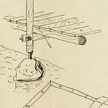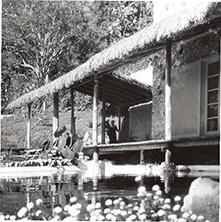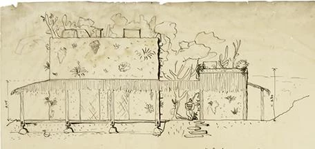 A sheltered straw porch covers the perimeter of the house and links up the main volume of the residence with the volume that contains the service areas. The columns, made out of tree trunks, sink into a small pond like palafittes. Despite its walled-in nature, the house is permeable because it lets air make its way inside through cracks and interwoven screens, which is possible because there are no glass enclosures.