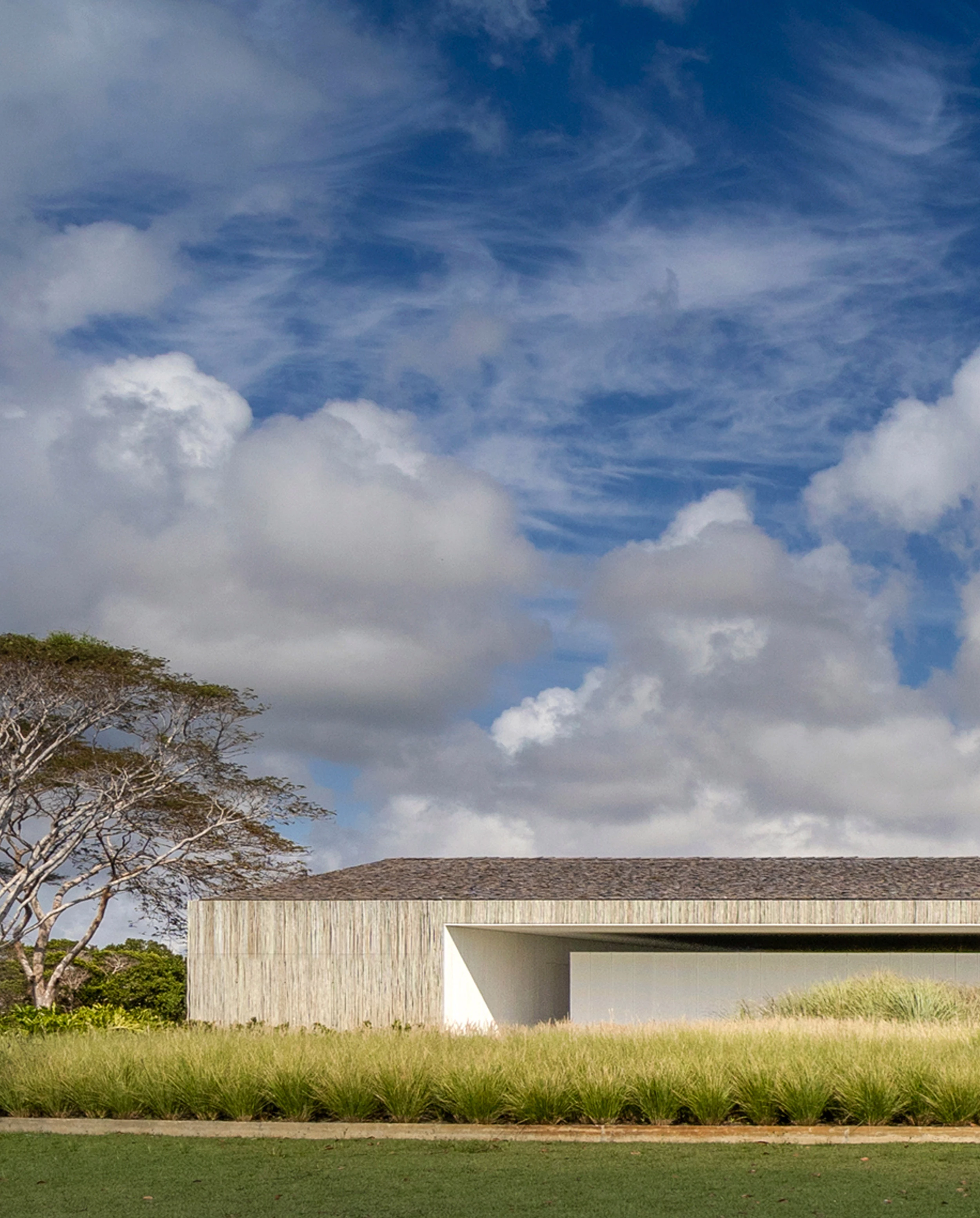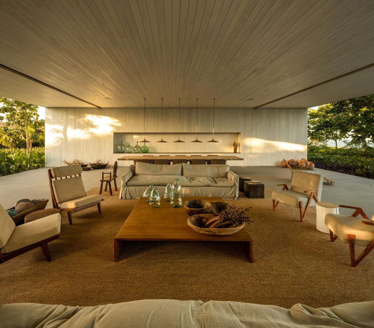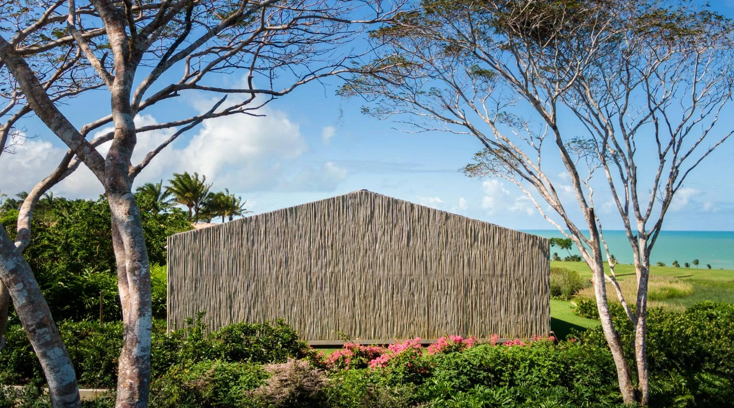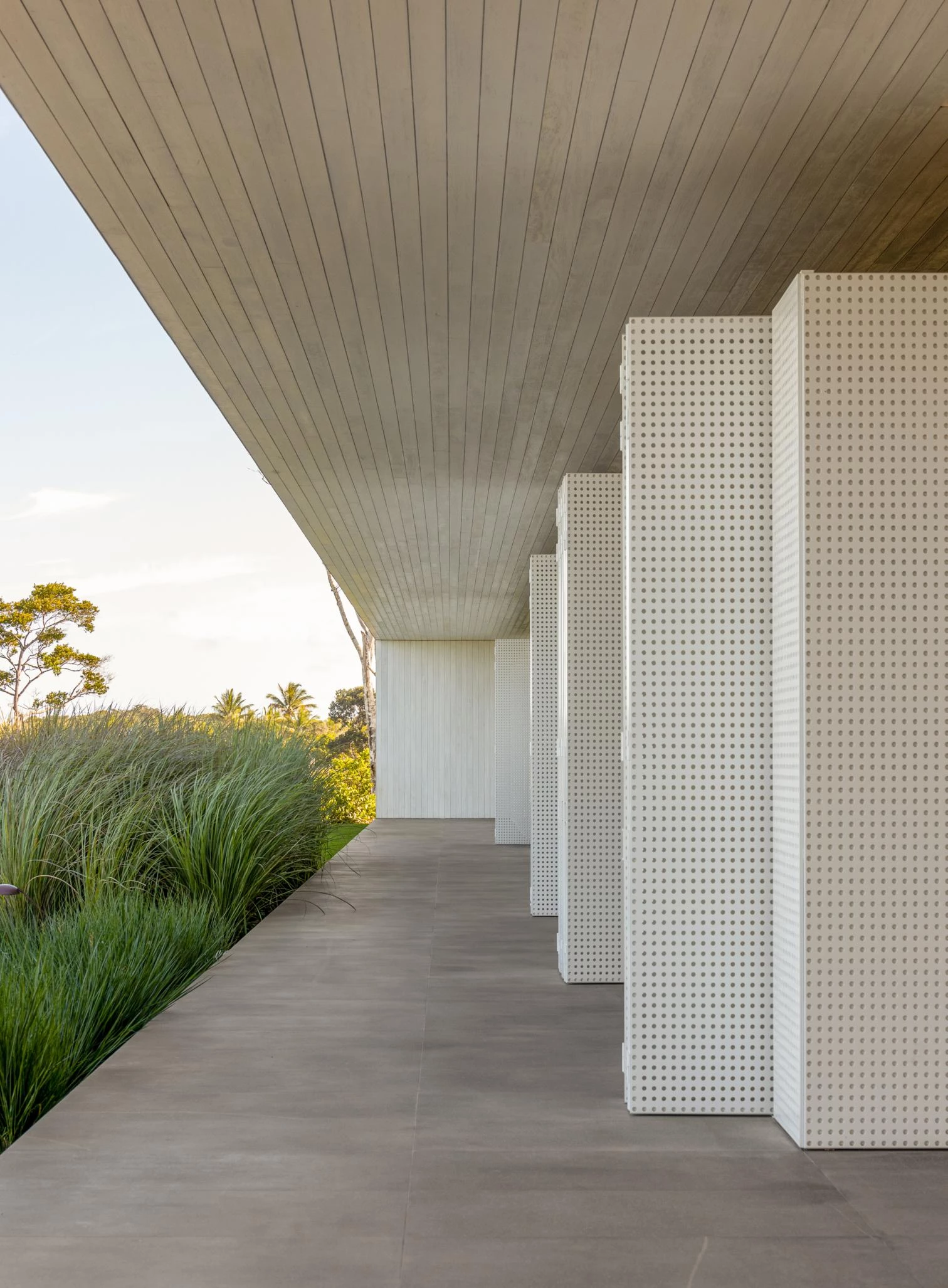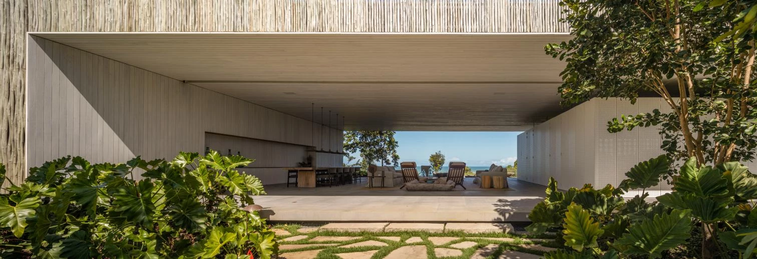 The audacity of the metallic structure that makes the 45-meter void possible is balanced out with the tactile organicity of the materials that wrap it: eucalyptus slats and thin biriba tree branches – used traditionally in the northeast of Brazil –, which ‘grow’ on the facade as if they were petrified roots; the roof, for its part, is built with recycled wood and handmade tiles.