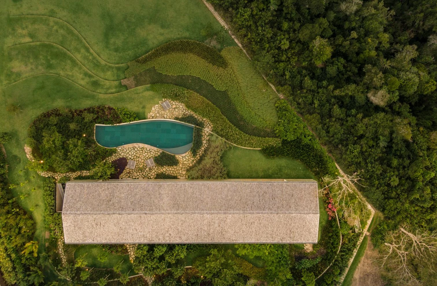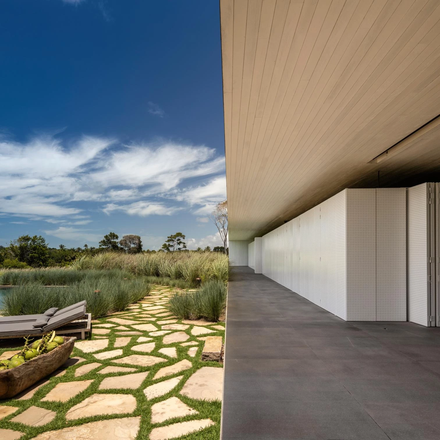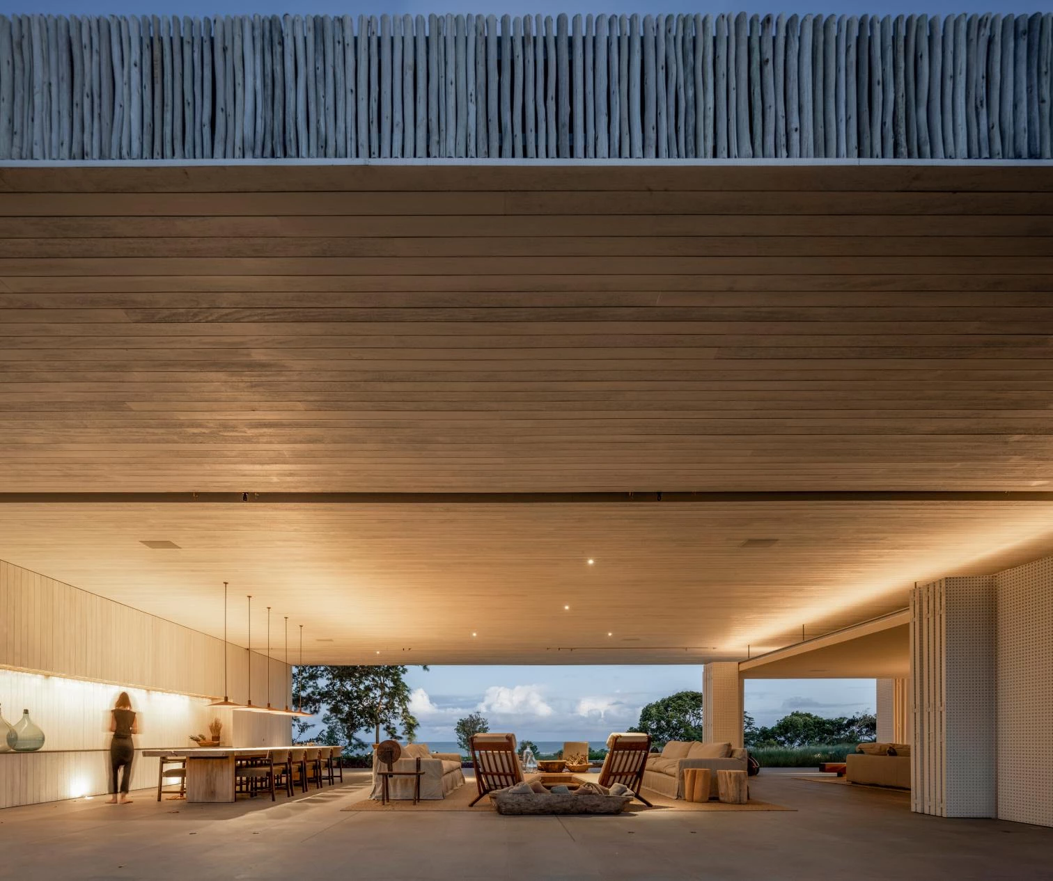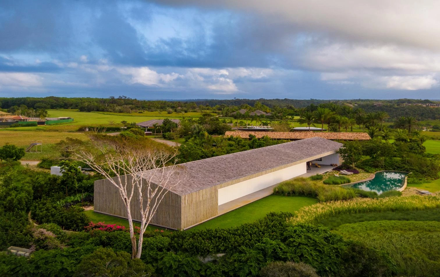 The audacity of the metallic structure that makes the 45-meter void possible is balanced out with the tactile organicity of the materials that wrap it: eucalyptus slats and thin biriba tree branches – used traditionally in the northeast of Brazil –, which ‘grow’ on the facade as if they were petrified roots; the roof, for its part, is built with recycled wood and handmade tiles.