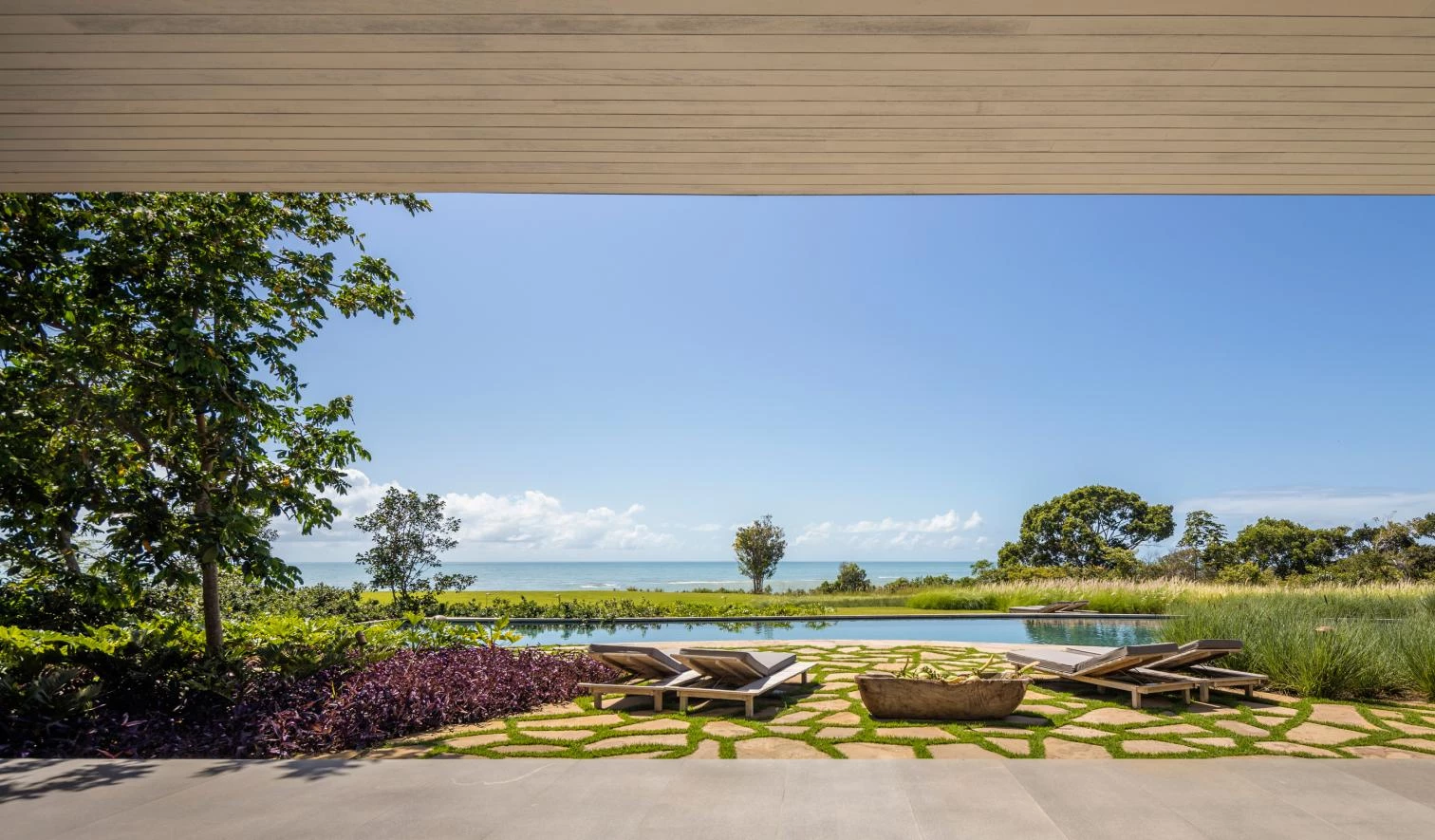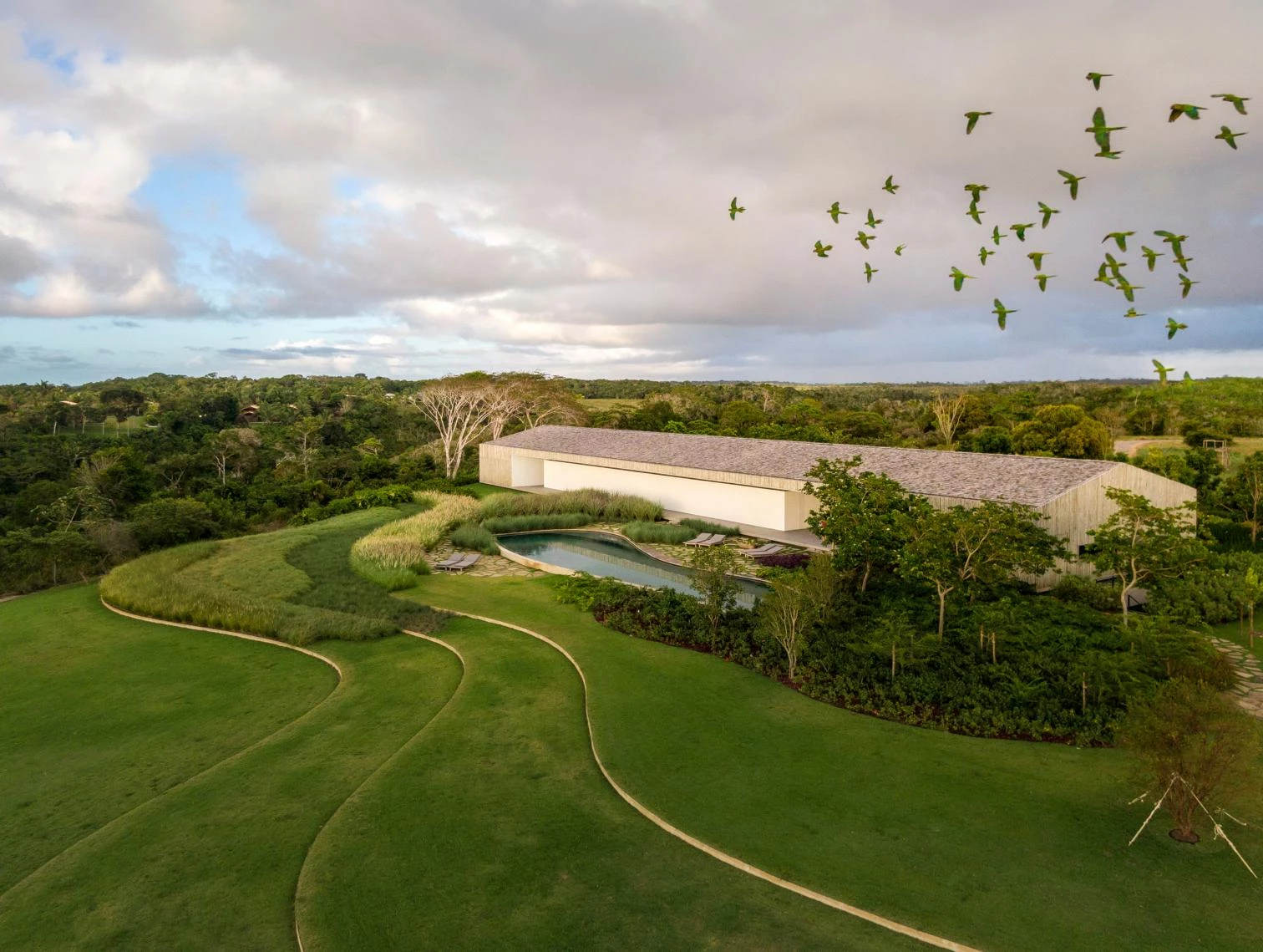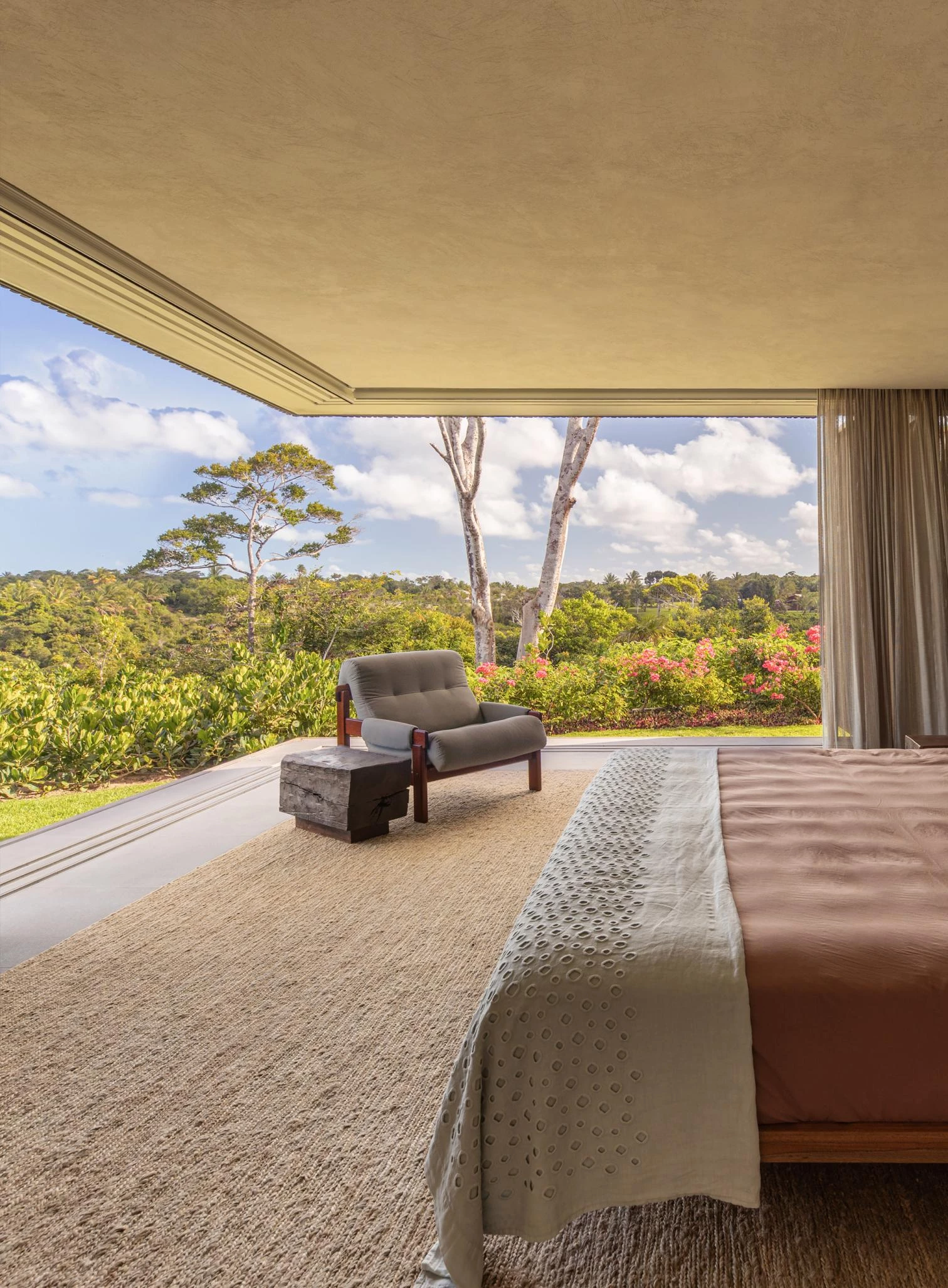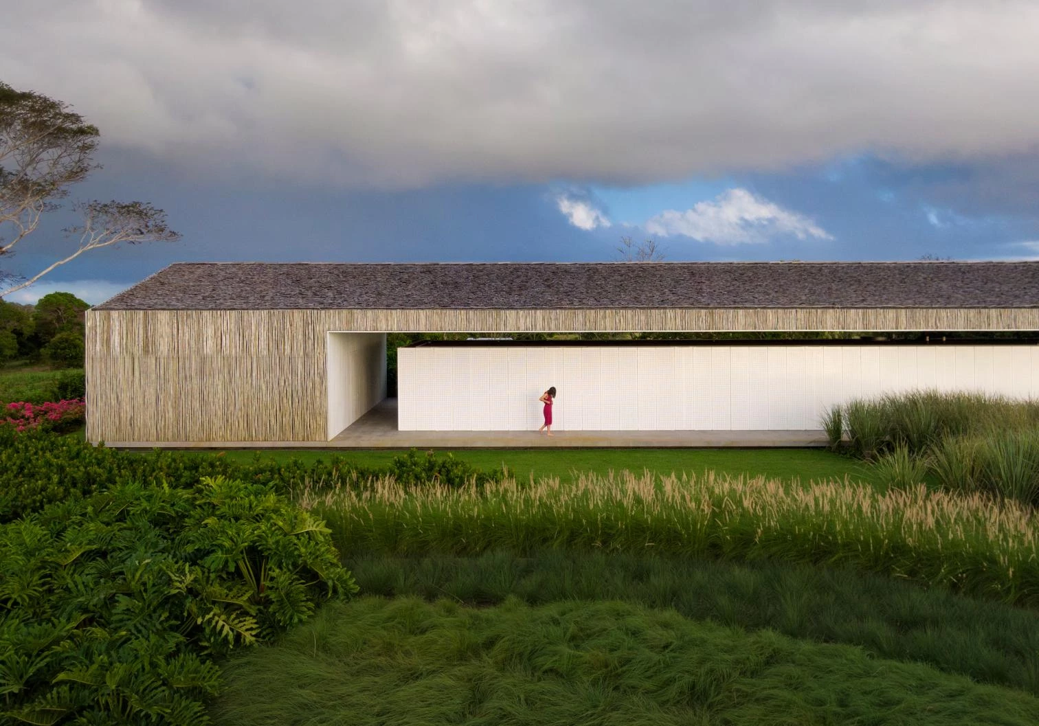 The audacity of the metallic structure that makes the 45-meter void possible is balanced out with the tactile organicity of the materials that wrap it: eucalyptus slats and thin biriba tree branches – used traditionally in the northeast of Brazil –, which ‘grow’ on the facade as if they were petrified roots; the roof, for its part, is built with recycled wood and handmade tiles.